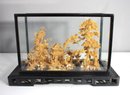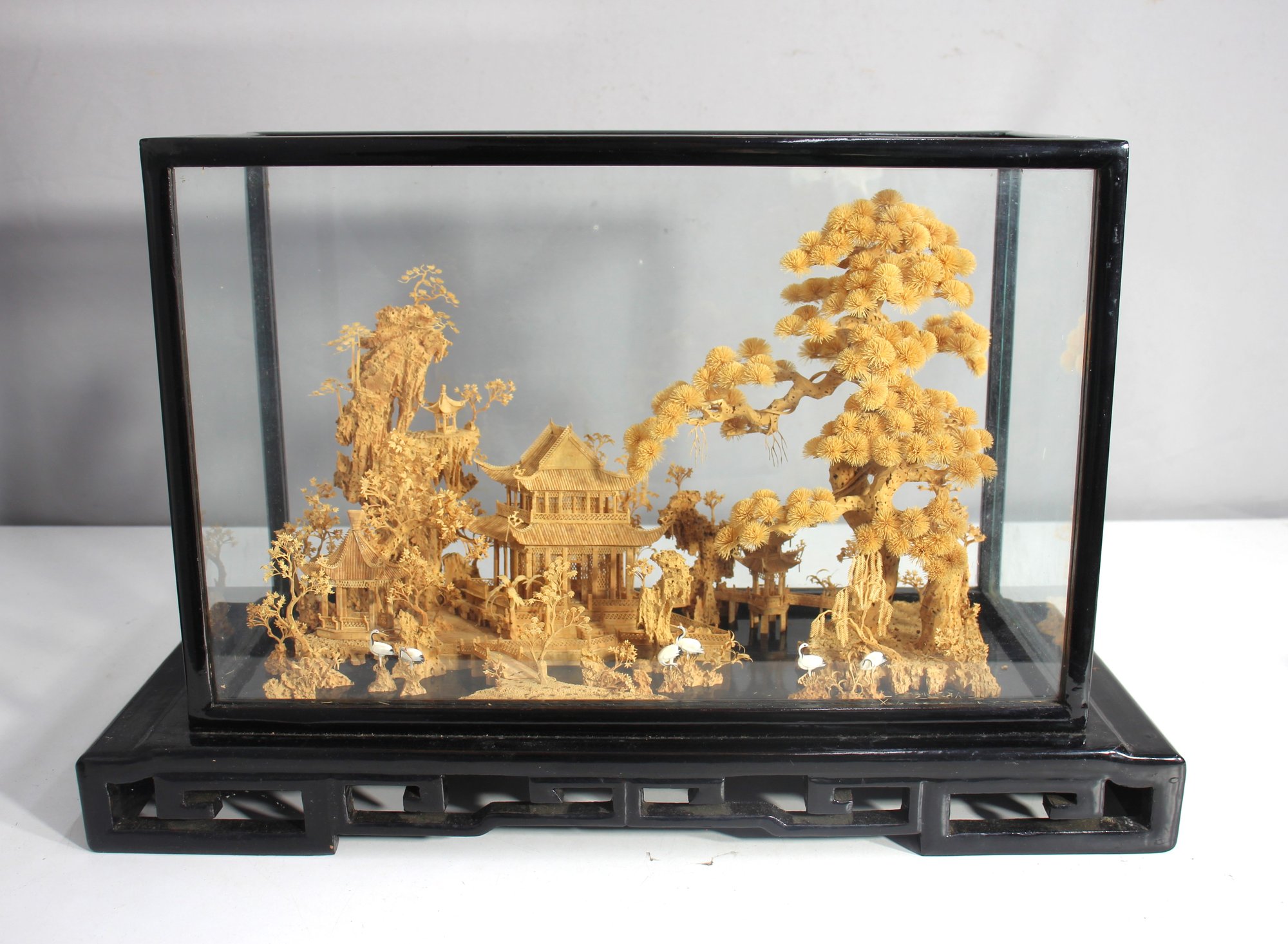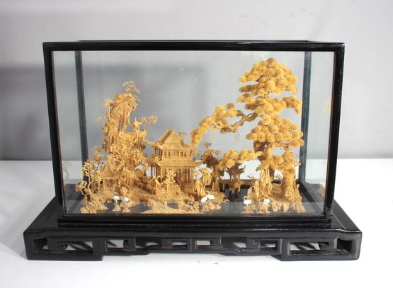 This stunning Chinese diorama showcases exceptional craftsmanship, featuring an intricate landscape within a glass case. The piece includes delicately carved details of pagodas, trees, cranes, and traditional architecture, all crafted with precision and artistry. Set on a black wooden base with intricate fretwork, this piece exudes elegance and cultural significance. Measuring 14 inches high, 21.5 inches wide, and 9 inches deep, it makes a striking decorative addition to any space. Some minor wear consistent with age. A timeless collectible showcasing the beauty of traditional Chinese artistry.