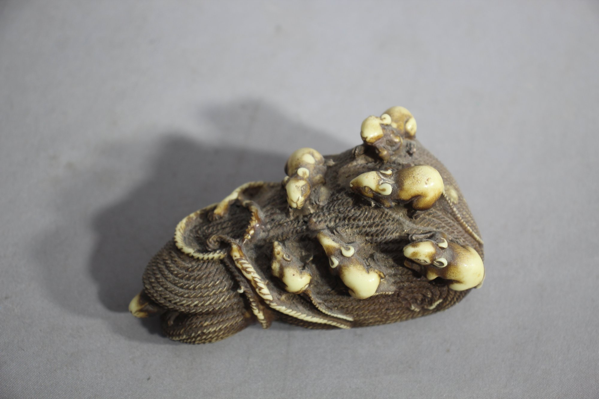 Take a peek into the whimsical with this vintage resin sculpture, a playful yet exquisitely detailed piece inspired by traditional Japanese carvings. Depicting a group of lifelike rats or mice merrily scampering and frolicking atop a coiled bail rope, this sculpture captures the dynamism and minutiae of animal movements.