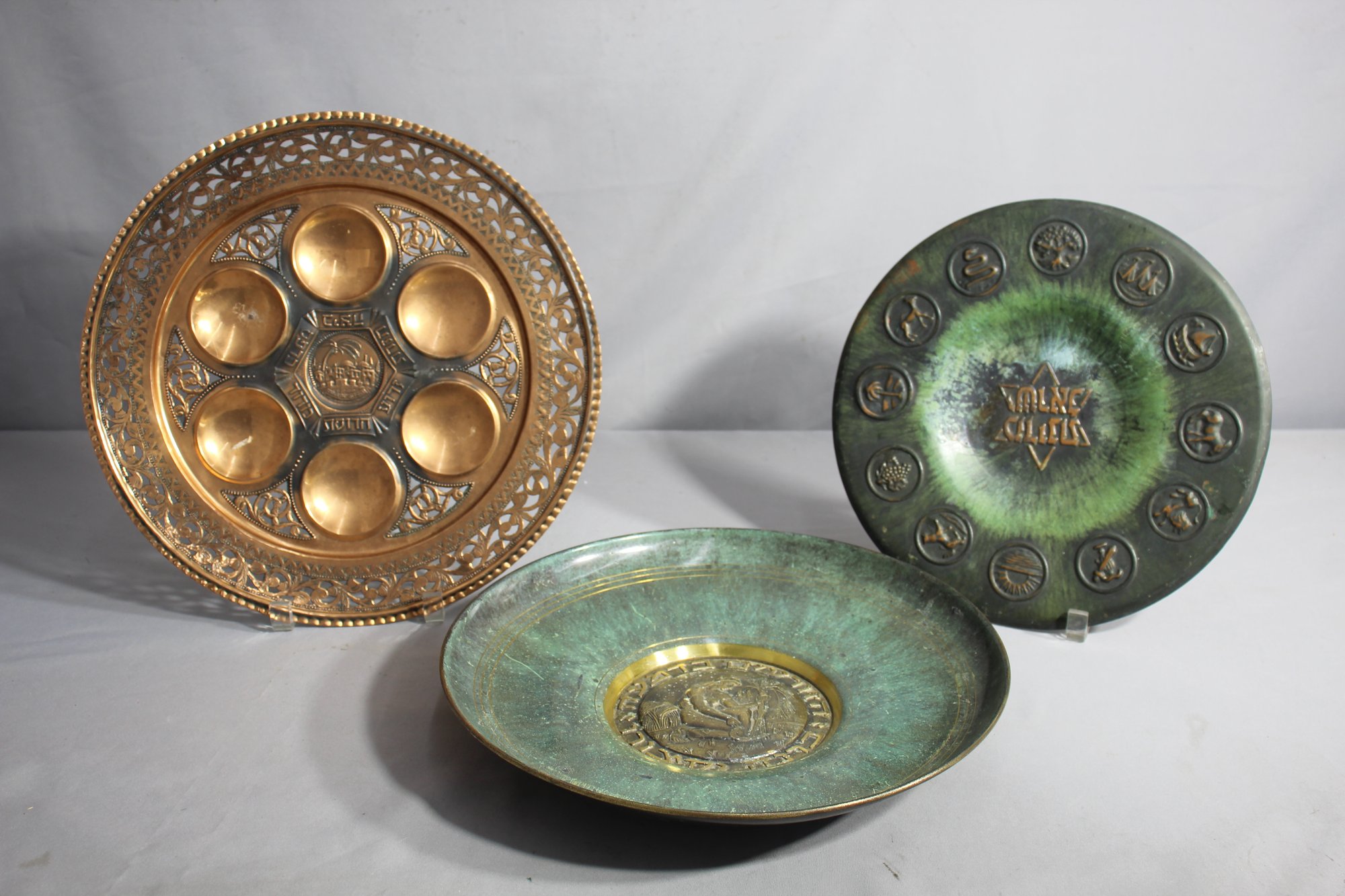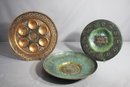 A smaller brass plate with a captivating verdigris finish, accented by a central medallion depicting a scene of pastoral life, adding depth and cultural significance to the collection.