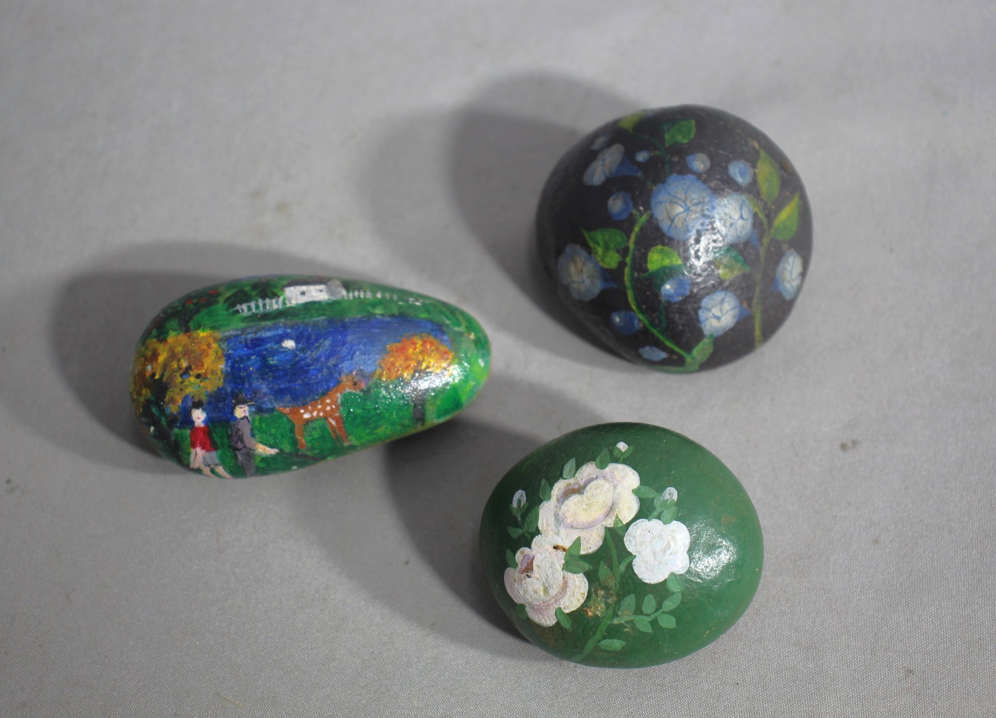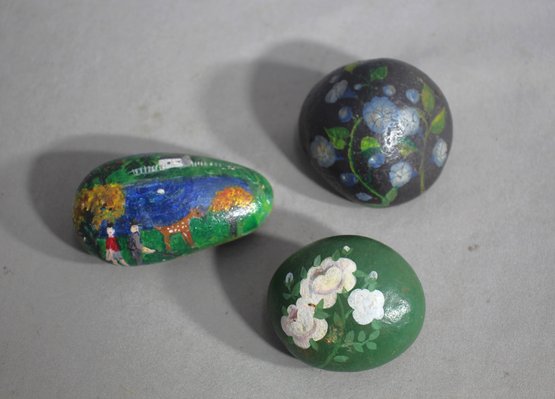 each with its own unique and delightful design that captures the essence of nature and serenity. This set features a pastoral landscape complete with a vibrant sunset and a peaceful deer; a nighttime bloom with blue flowers cradling the mystery of the moon; and a final stone adorned with delicate white blossoms