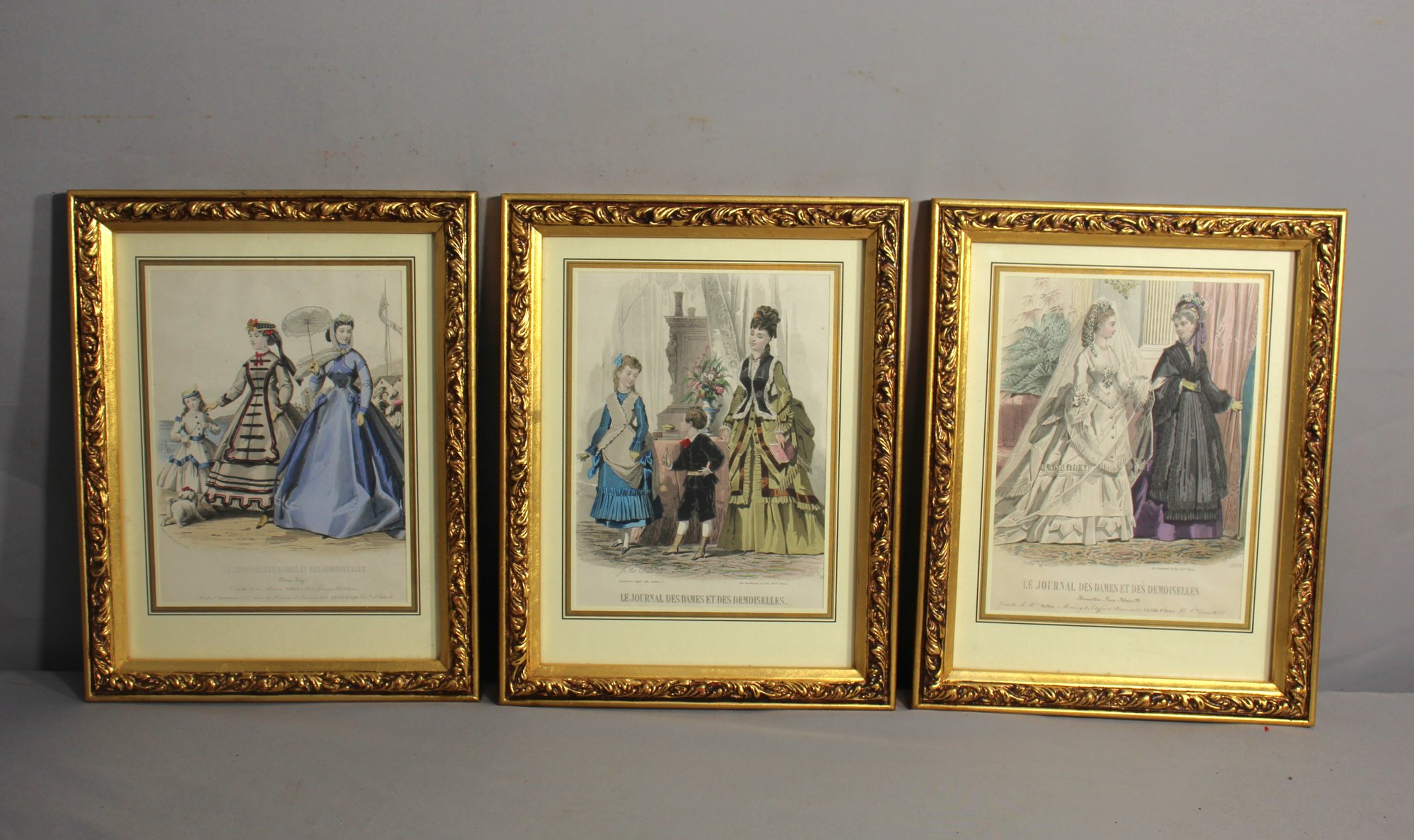 The intricate detailing and vibrant coloration bring each ensemble to life, making it easy to imagine the rustle of silken fabrics and the soft whisper of taffeta. Encased in sumptuous ornate gold frames that complement the grandeur of the illustrations, these prints are more than mere decorations; they are conversations starters, pieces of history, and a collector's delight. Perfect for adorning the walls of a fashion enthusiast's study or adding a touch of vintage charm to a living space