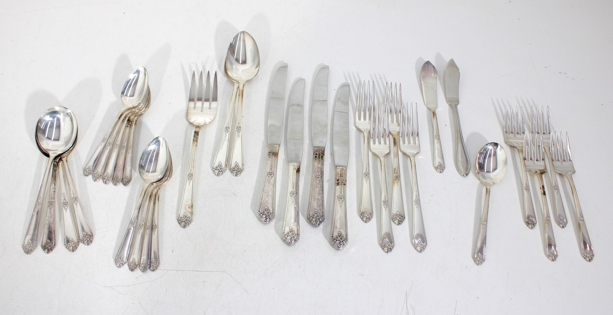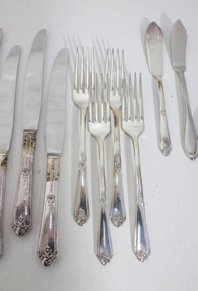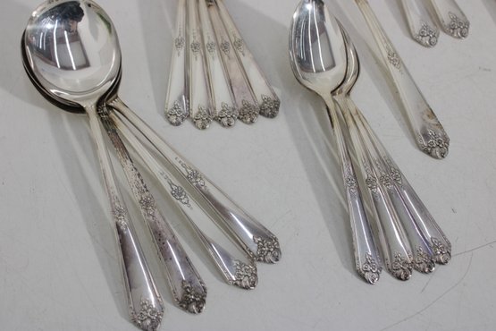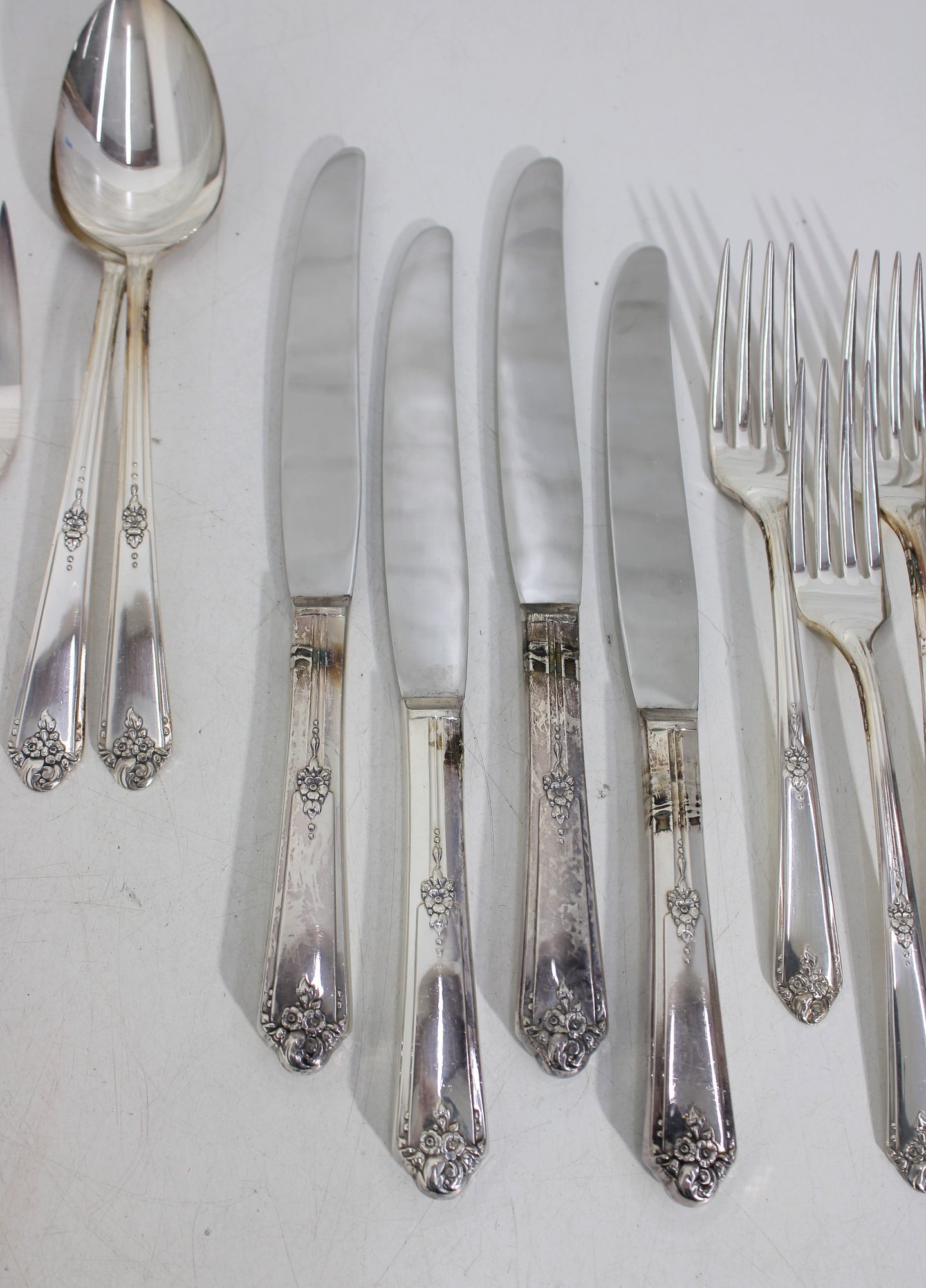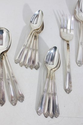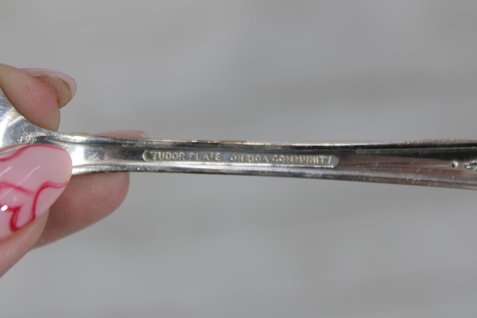 a partial vintage flatware set in the Tudor pattern by Oneida Community, crafted in classic silverplate. This elegant pattern features traditional lines with ornate detailing at the handles, making it a timeless choice for both everyday dining and special occasions.