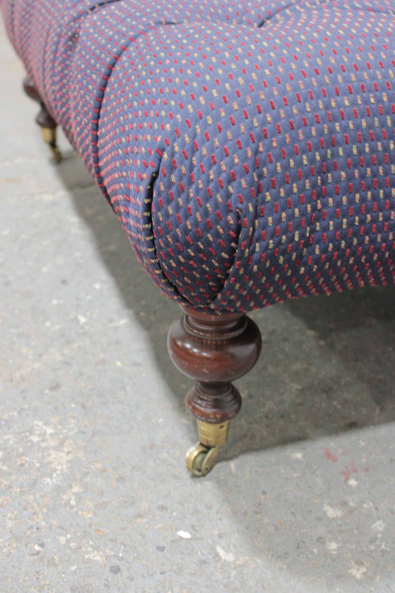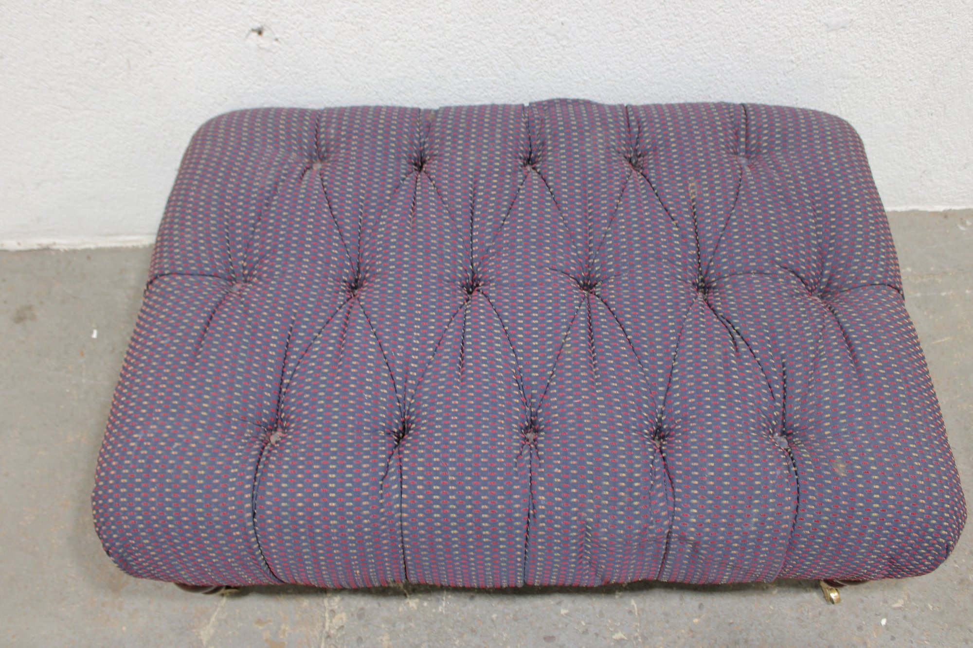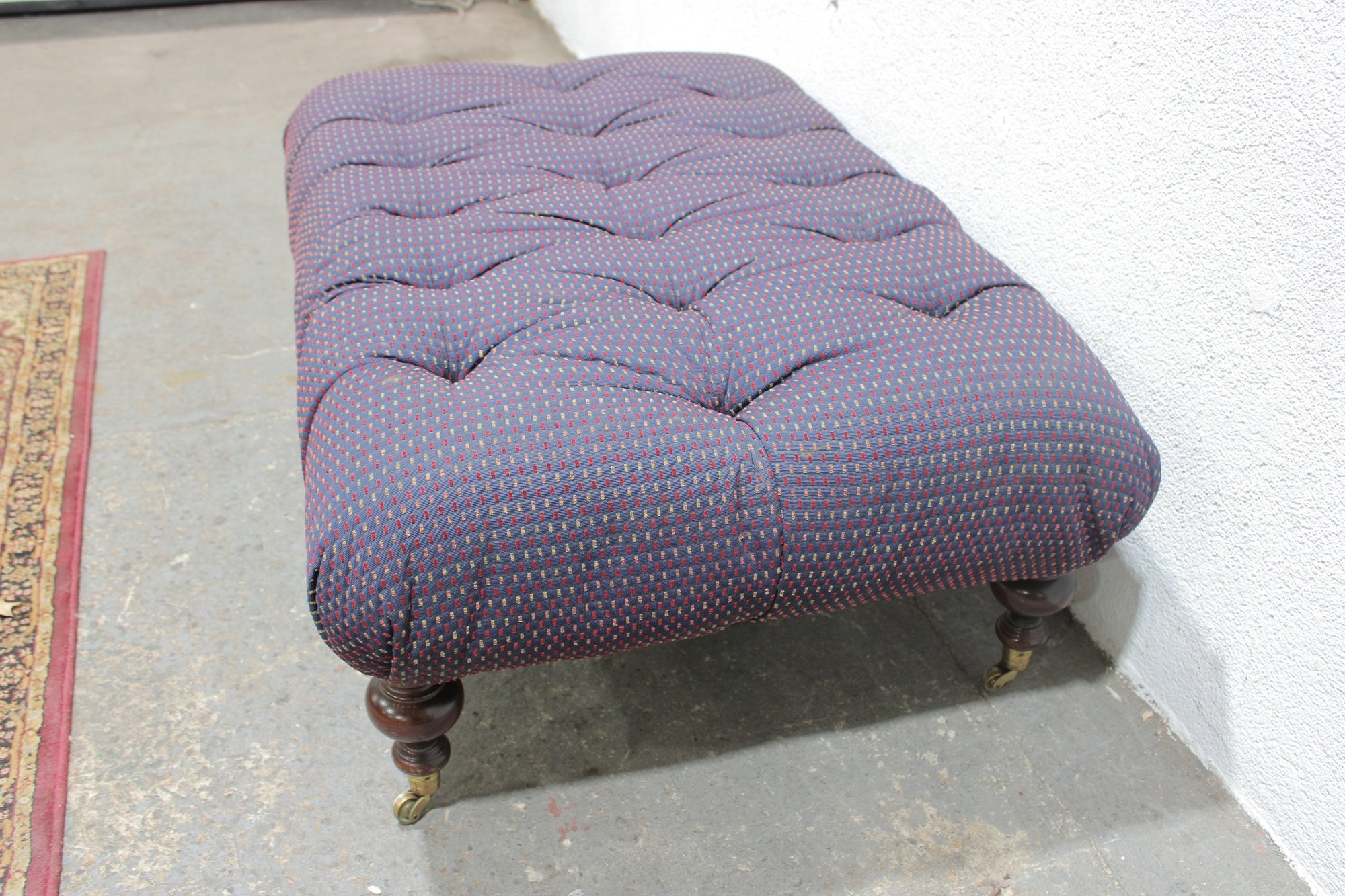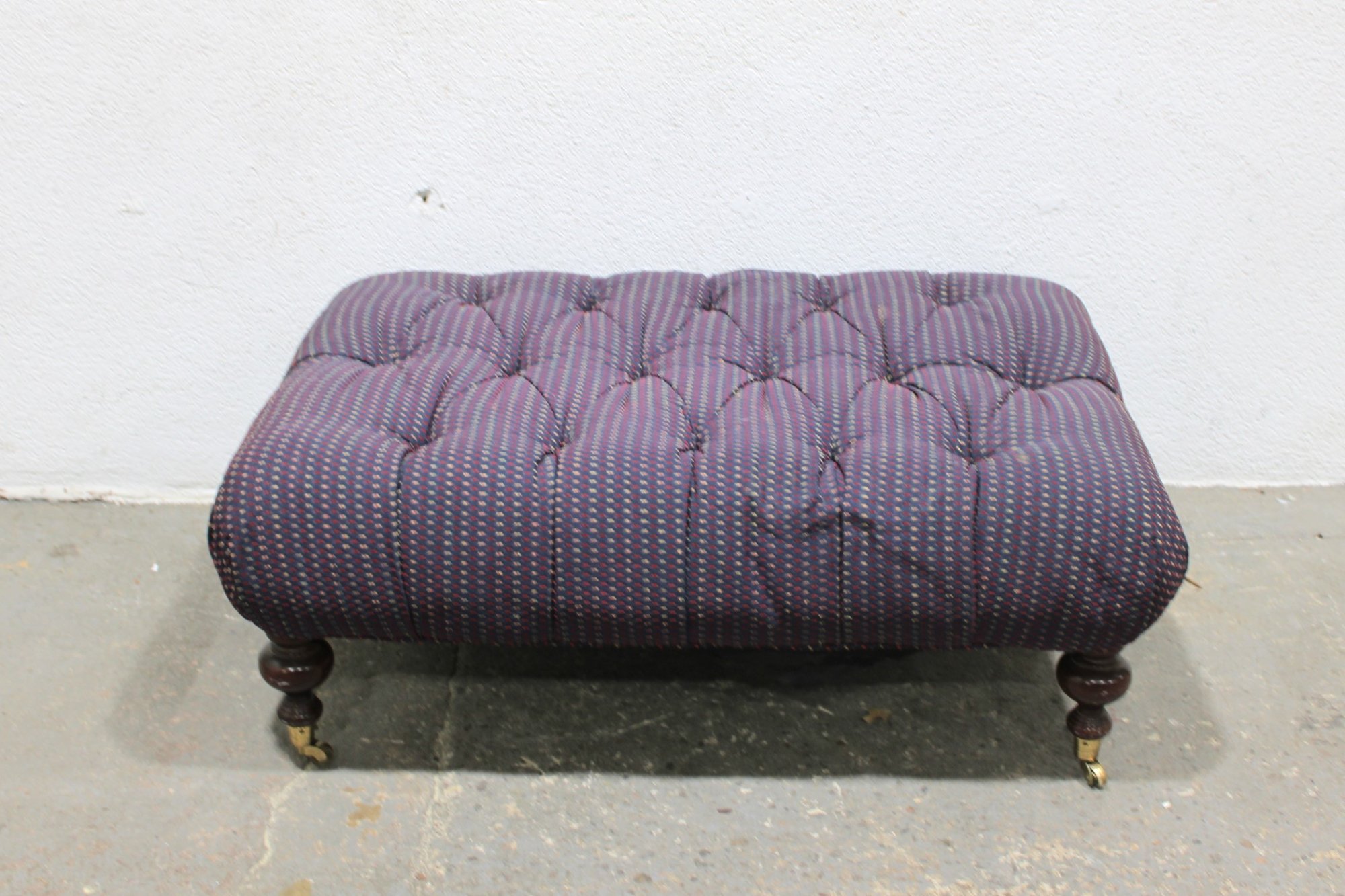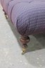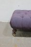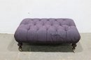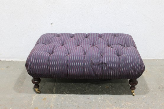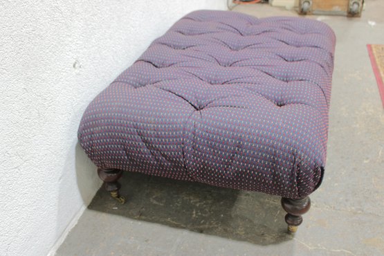 tufted upholstered ottoman bench featuring classic styling and sturdy construction. This piece has a generously padded top with deep button tufting and upholstered in a textured purple patterned fabric, giving it both comfort and visual appeal. The bench rests on turned wooden legs with brass casters, allowing it to be easily moved while maintaining a traditional furniture look.