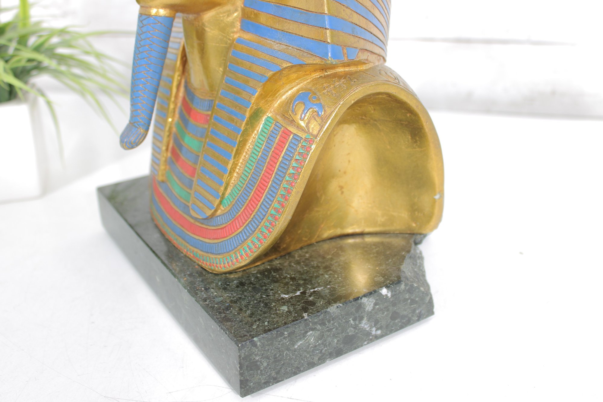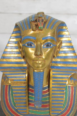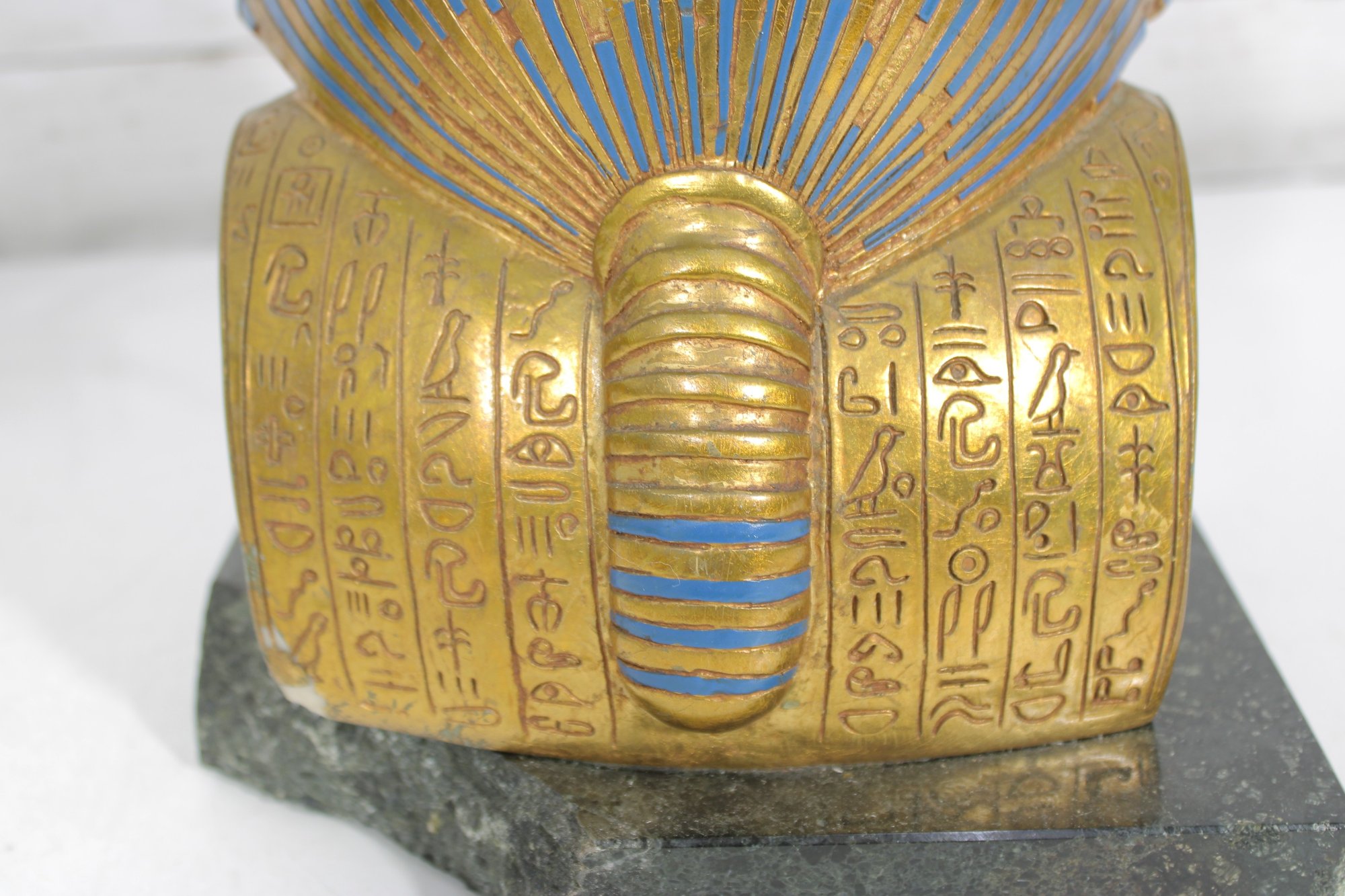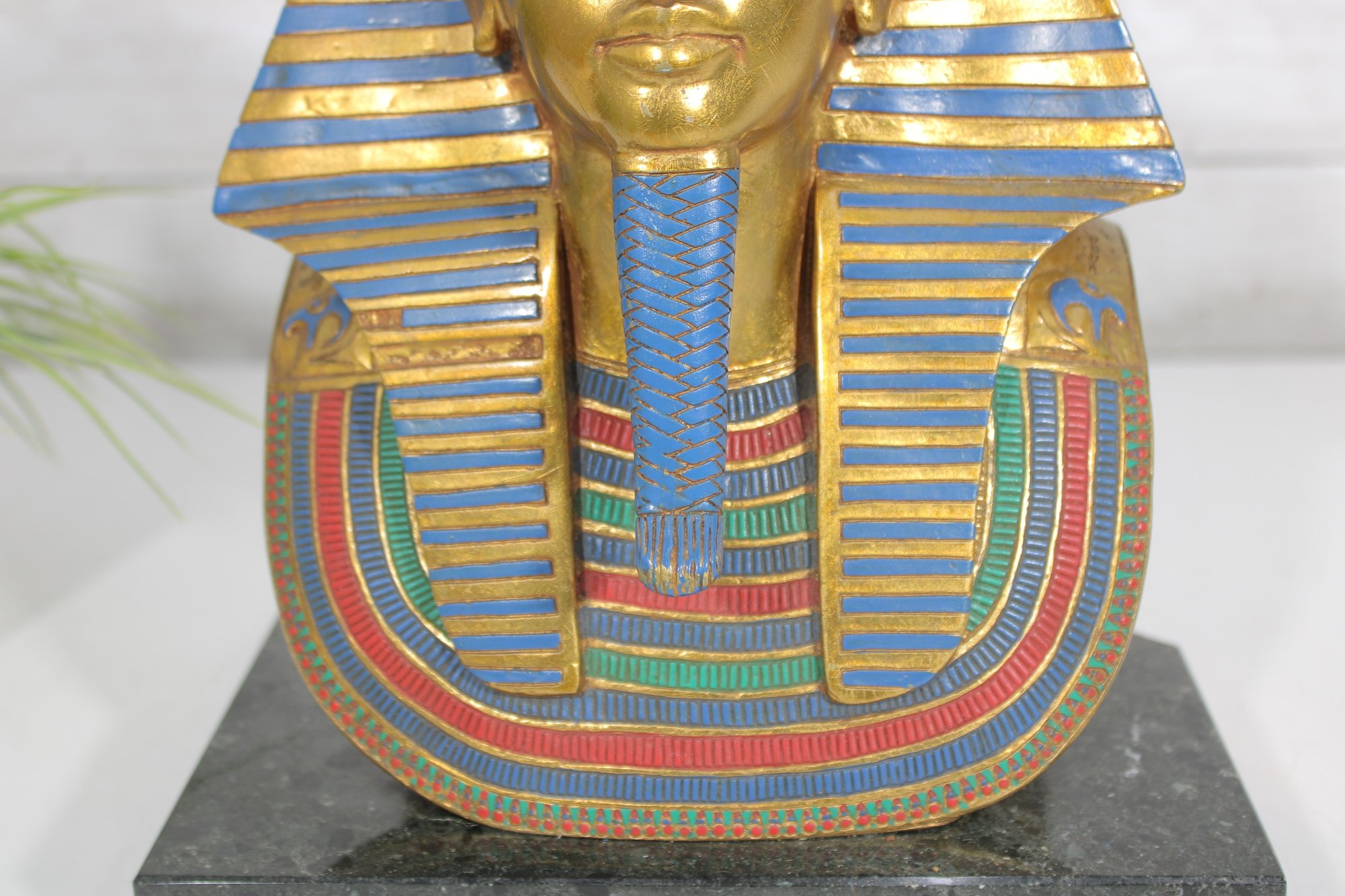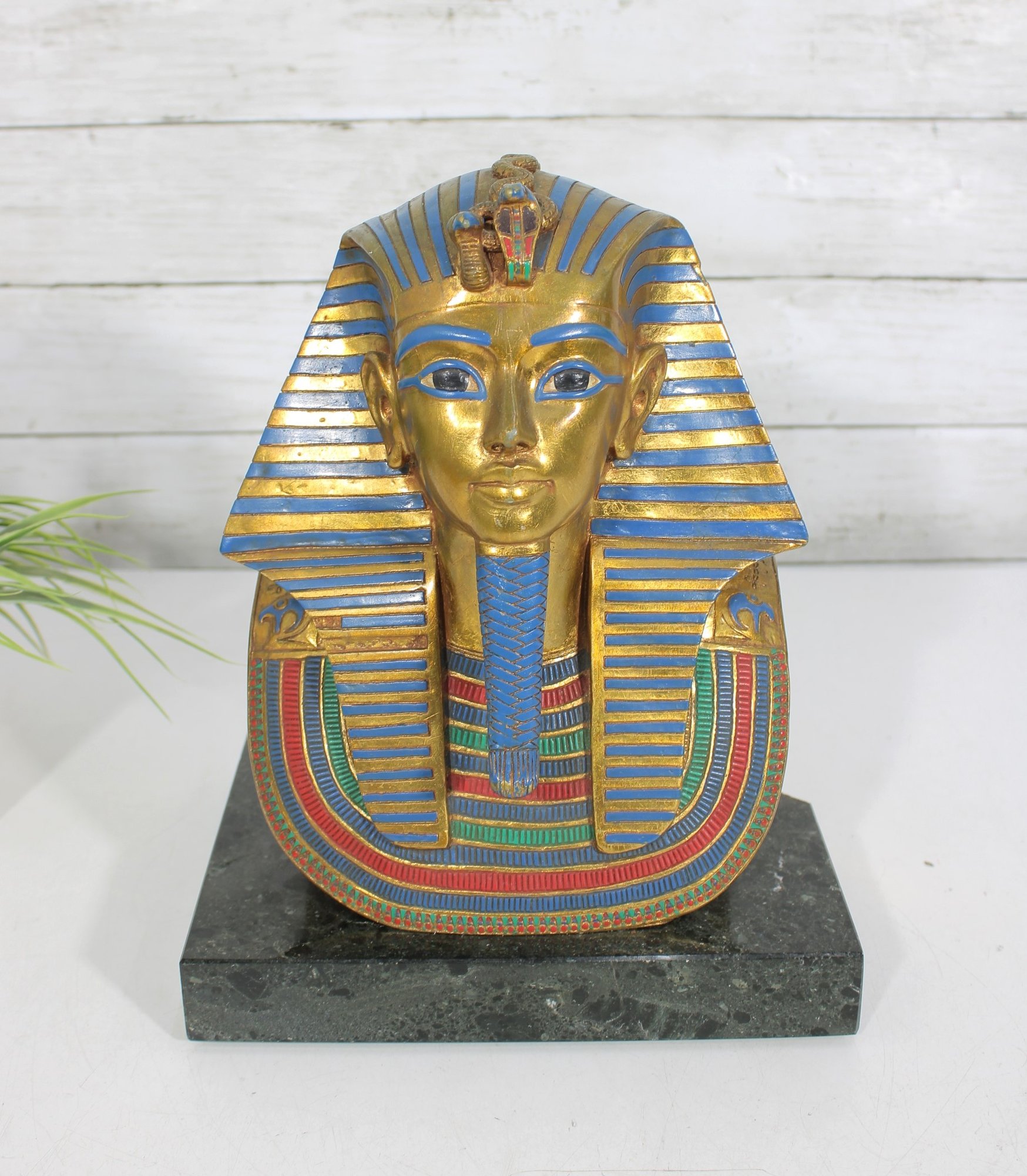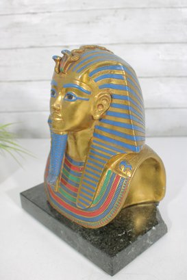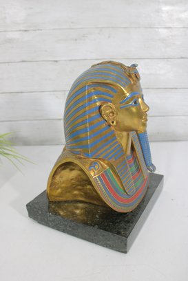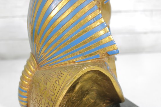 decorative replica of the iconic funerary mask of King Tutankhamun, beautifully rendered as a bust sculpture mounted on a solid stone base. This piece features the classic gold-tone finish with vibrant blue and red accents, capturing the intricate details of the ancient Egyptian design.