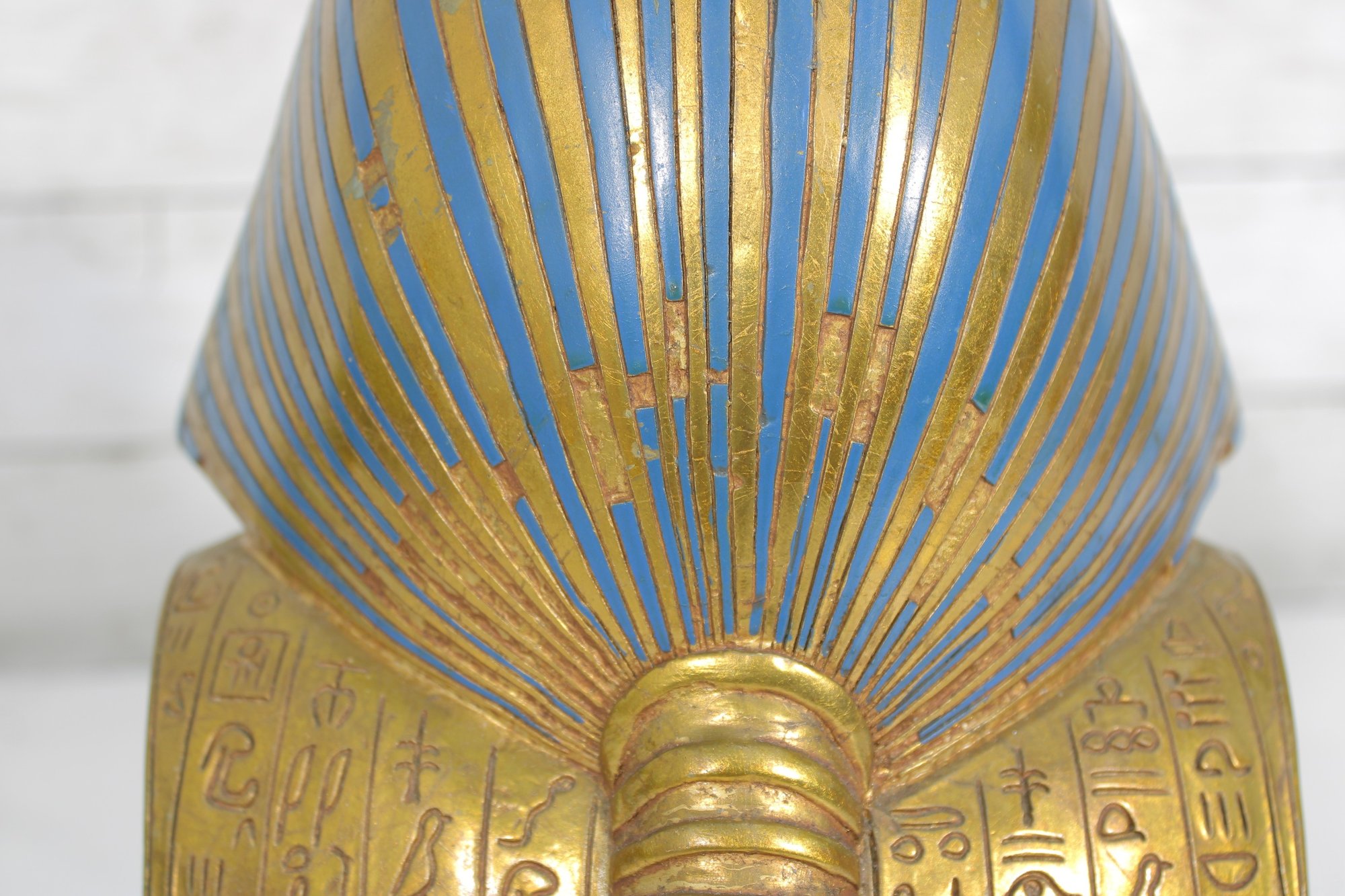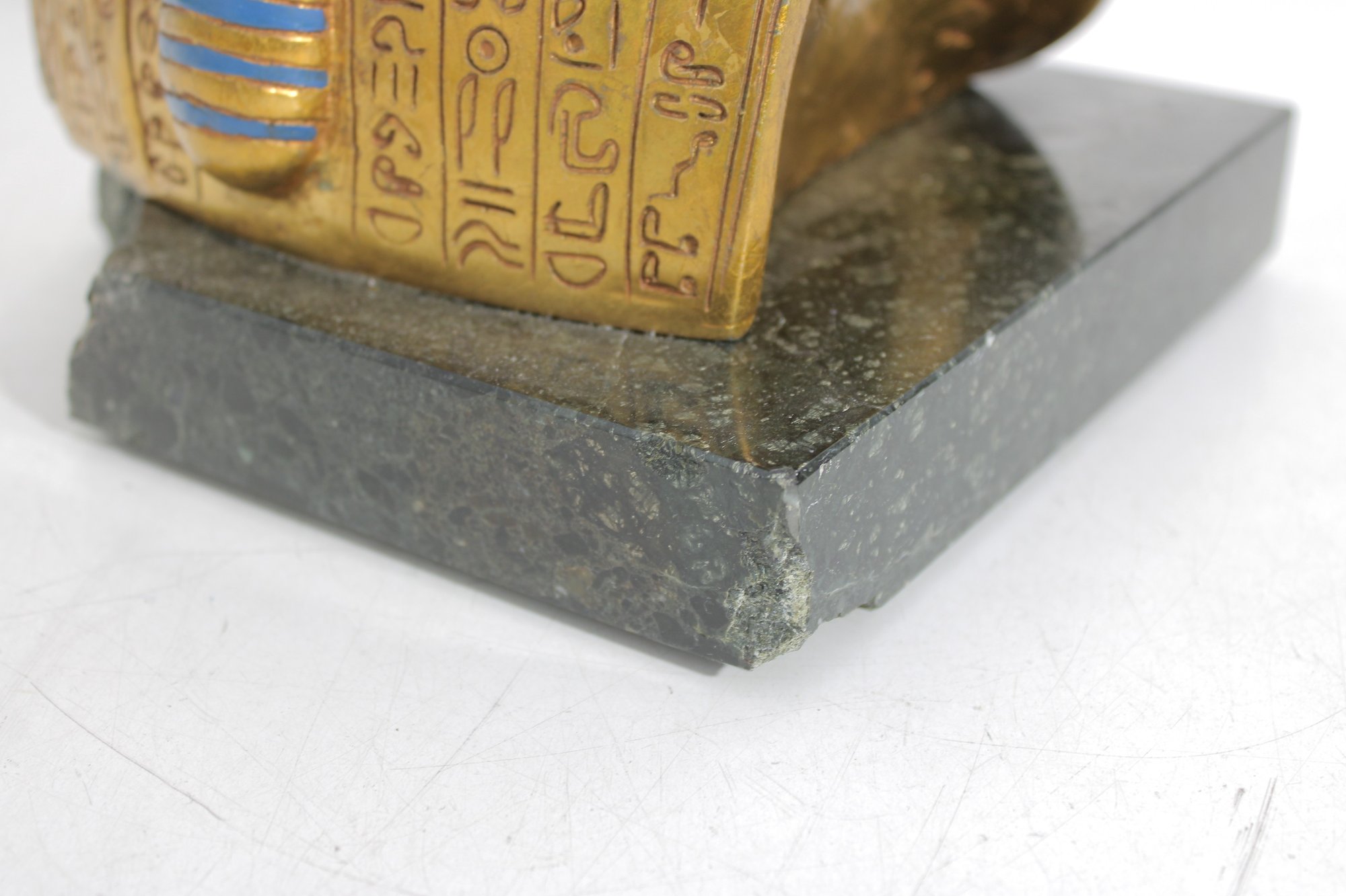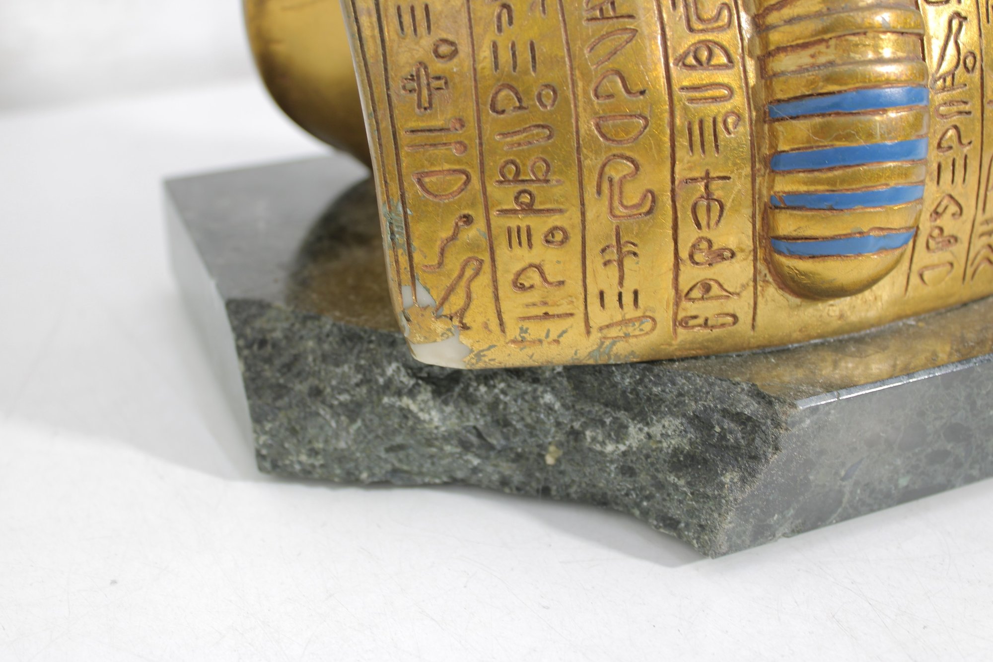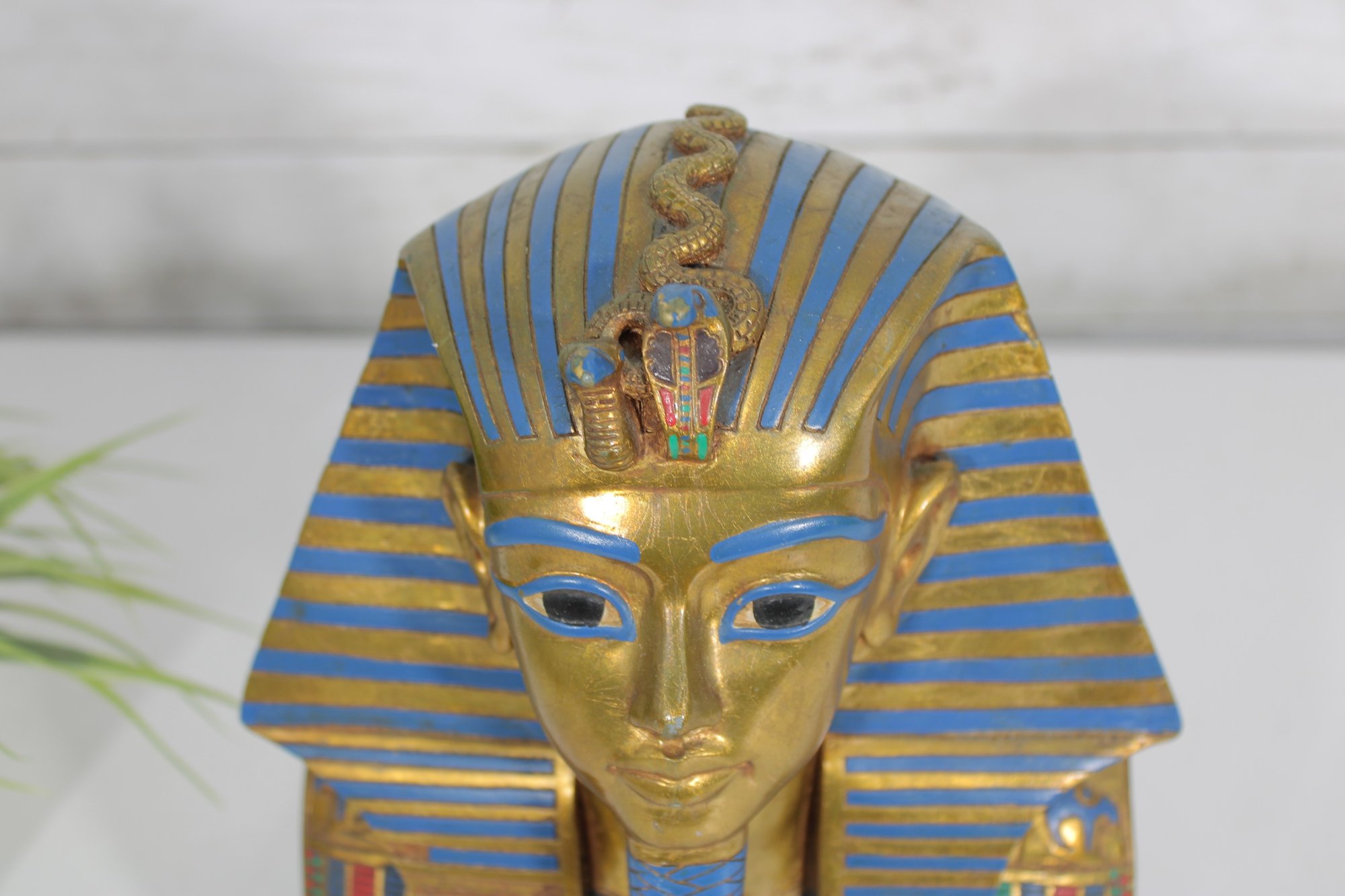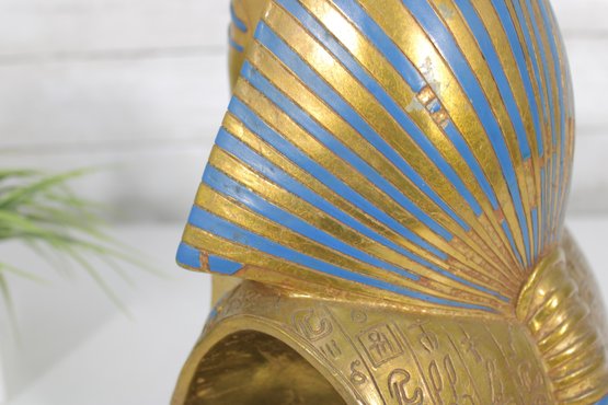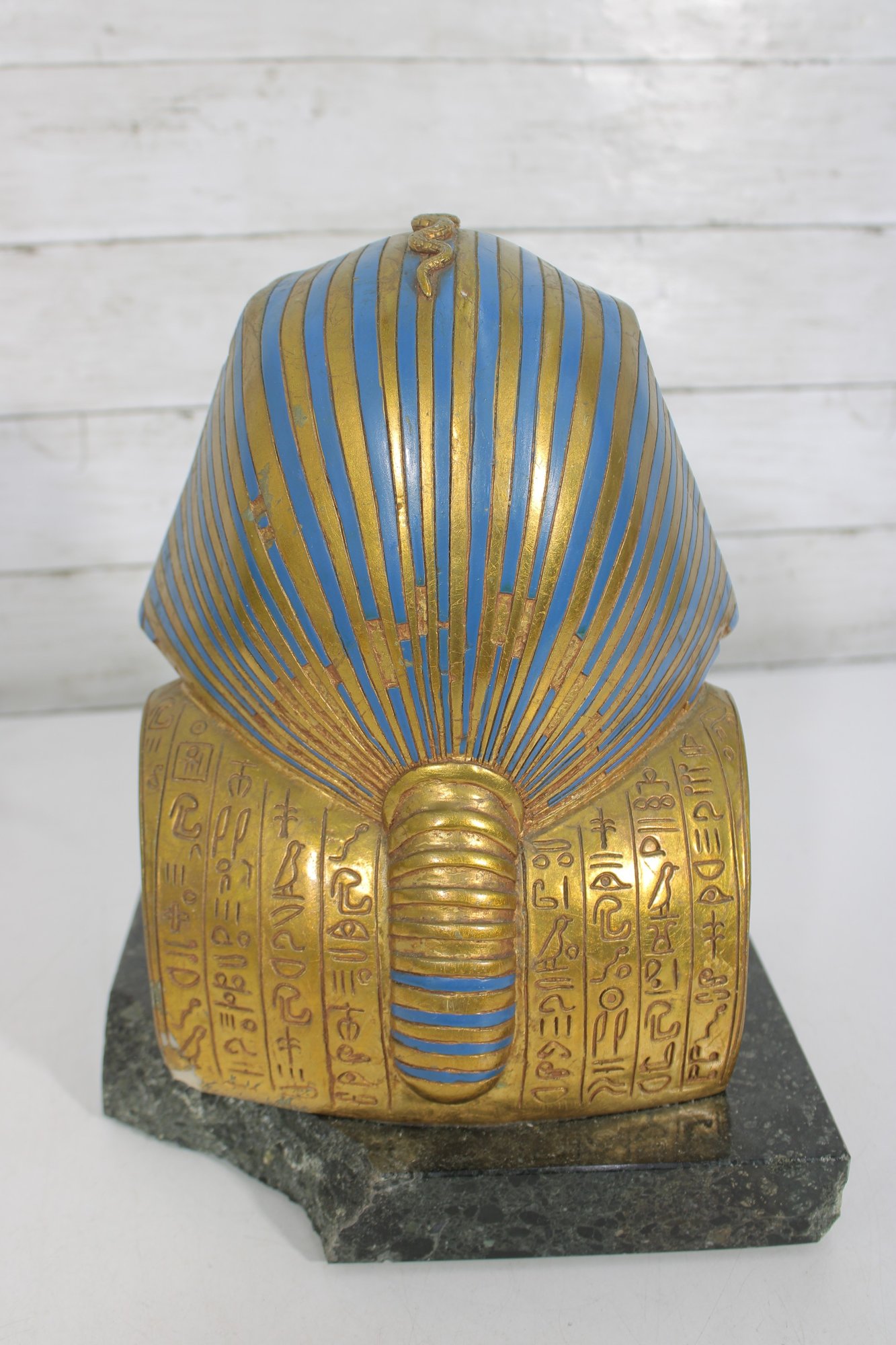 decorative replica of the iconic funerary mask of King Tutankhamun, beautifully rendered as a bust sculpture mounted on a solid stone base. This piece features the classic gold-tone finish with vibrant blue and red accents, capturing the intricate details of the ancient Egyptian design.
