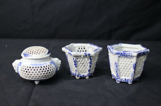 Two (2) Japanese Porcelain Reticulated Small Jardiniere And Incense Burner