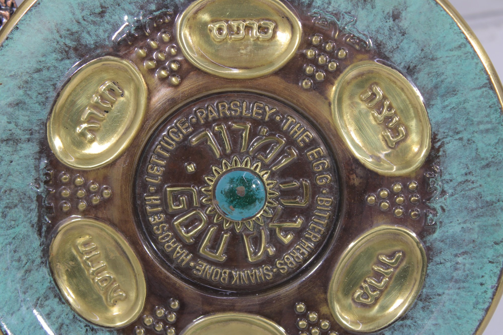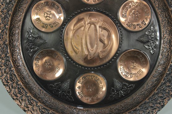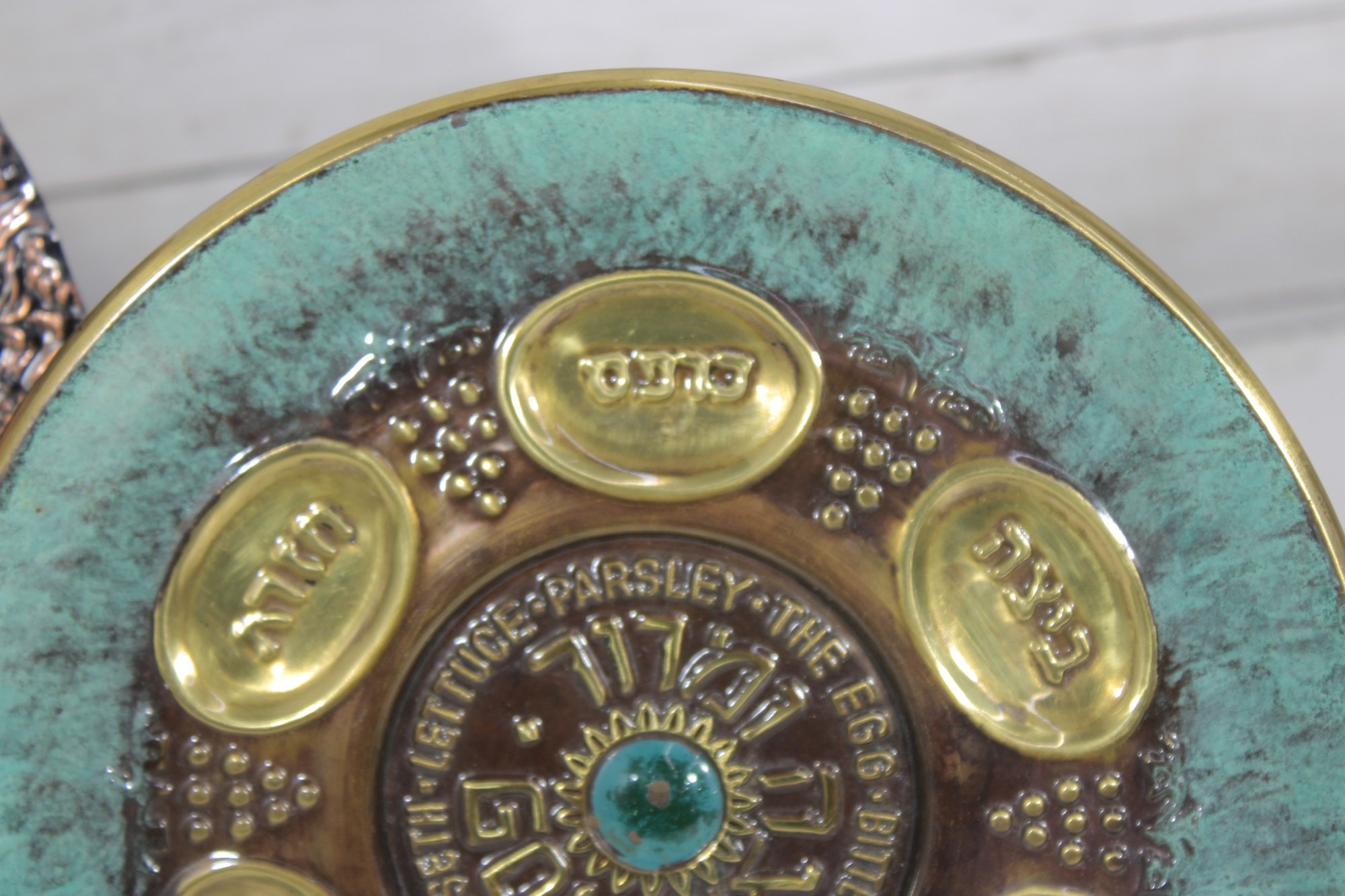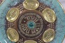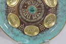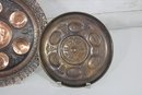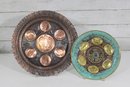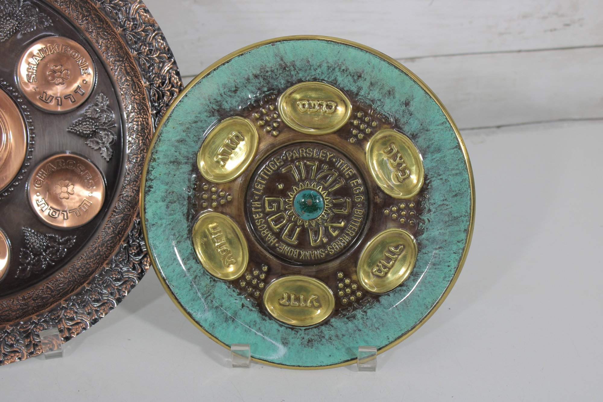 The larger plate has a richly detailed copper-toned design with Hebrew inscriptions and raised decorative elements. The smaller plate features a turquoise enamel-style finish with brass sections labeled for the symbolic foods used in the Seder tradition.