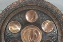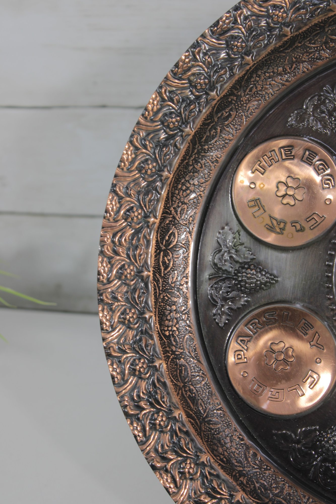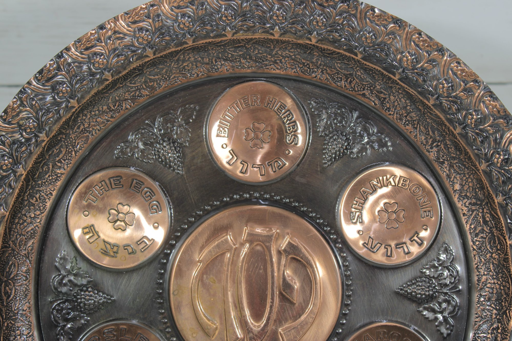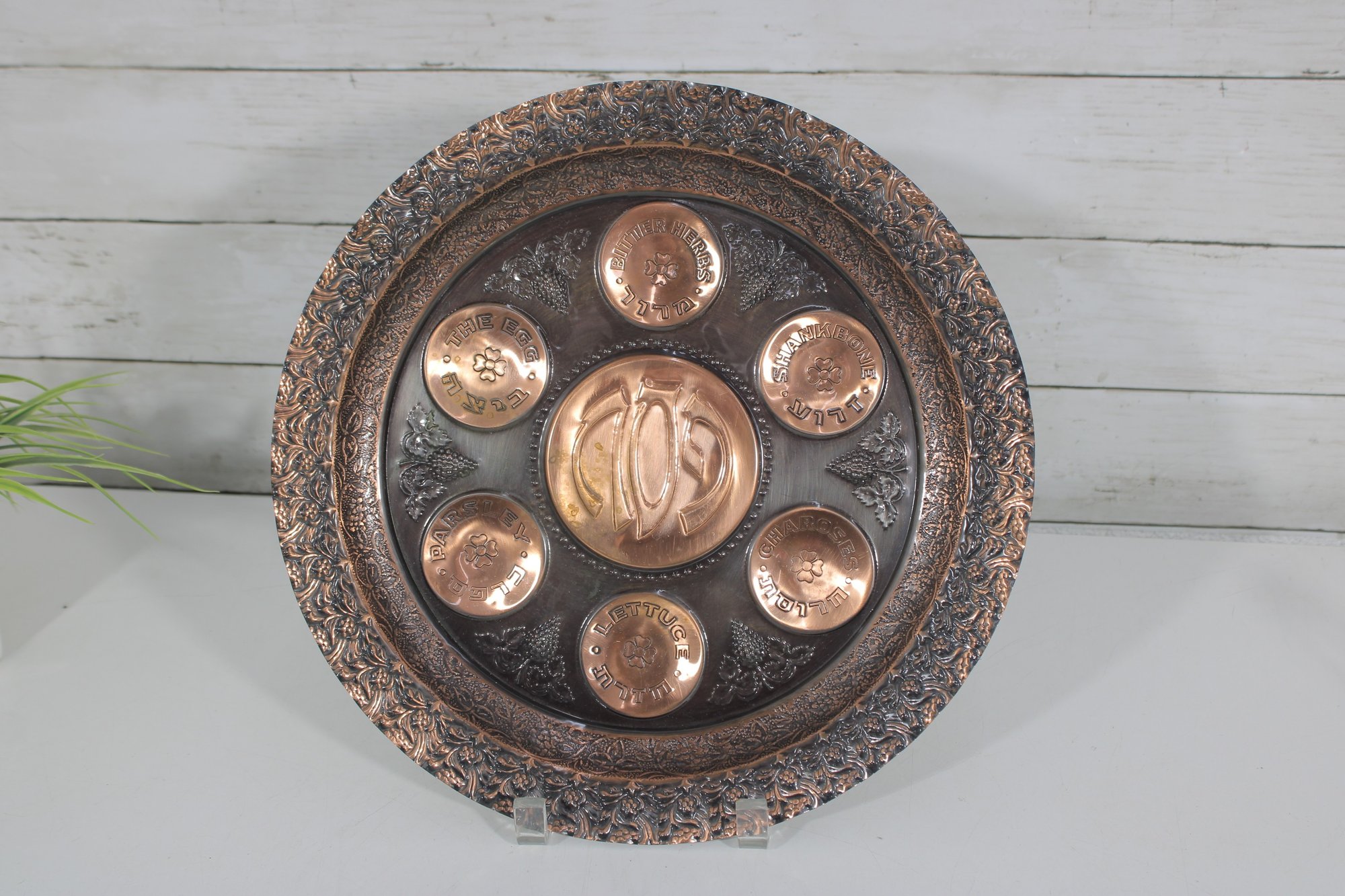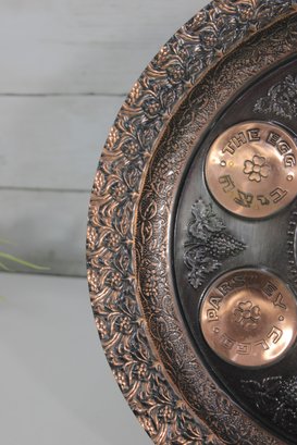 The larger plate has a richly detailed copper-toned design with Hebrew inscriptions and raised decorative elements. The smaller plate features a turquoise enamel-style finish with brass sections labeled for the symbolic foods used in the Seder tradition.