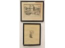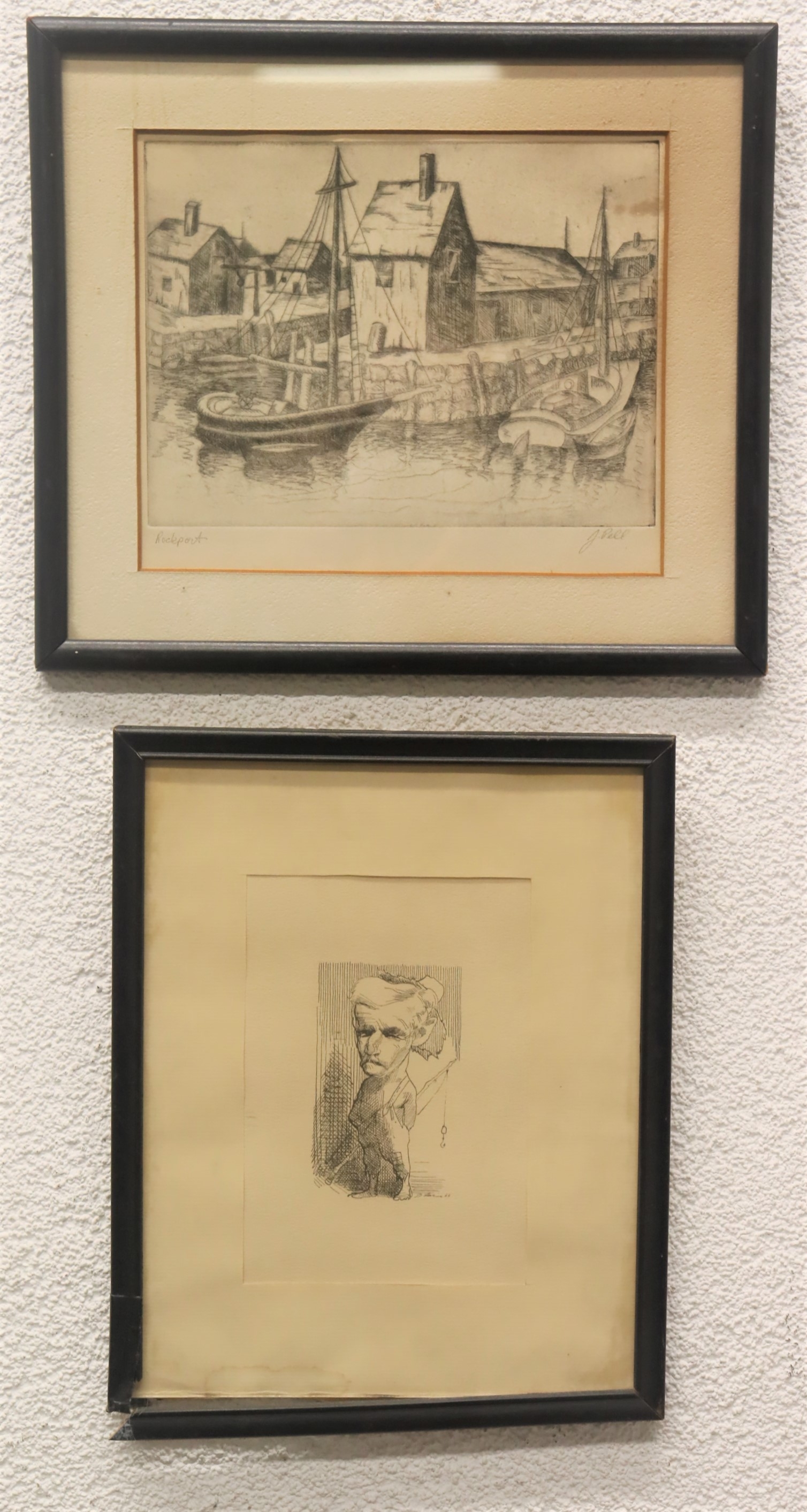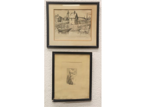 Two Framed Prints - Etching Of Rockport And Pen & Ink Mark Twain Fishing - Both Signed