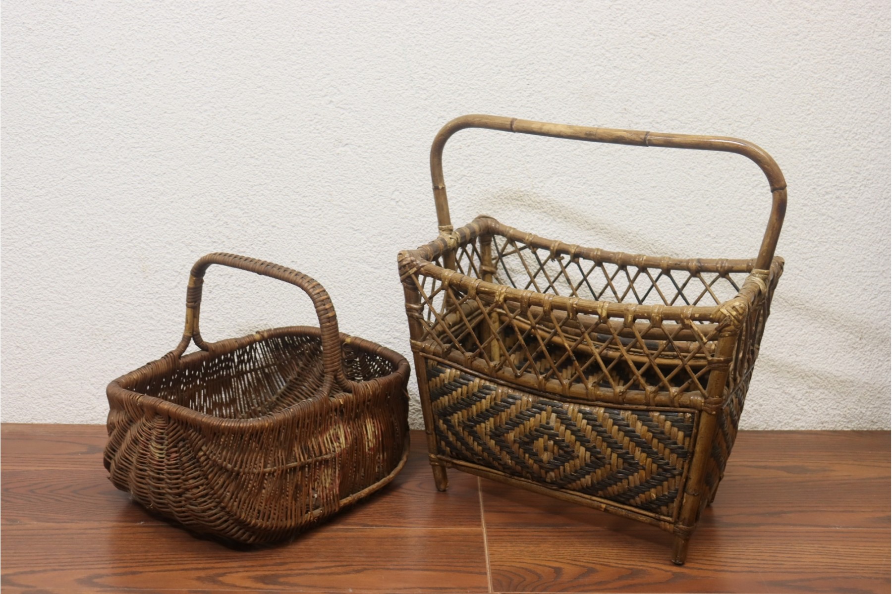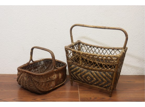Two Woven Cane Farmhouse Baskets - Footed Floor Basket And Flat-Bottom Carry Basket