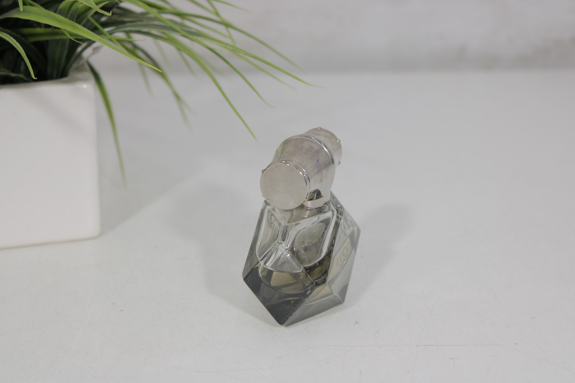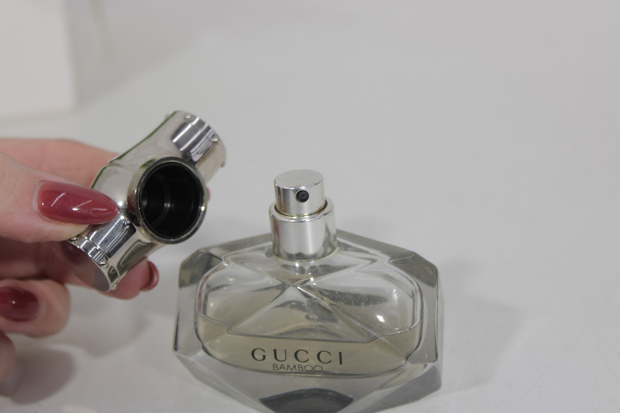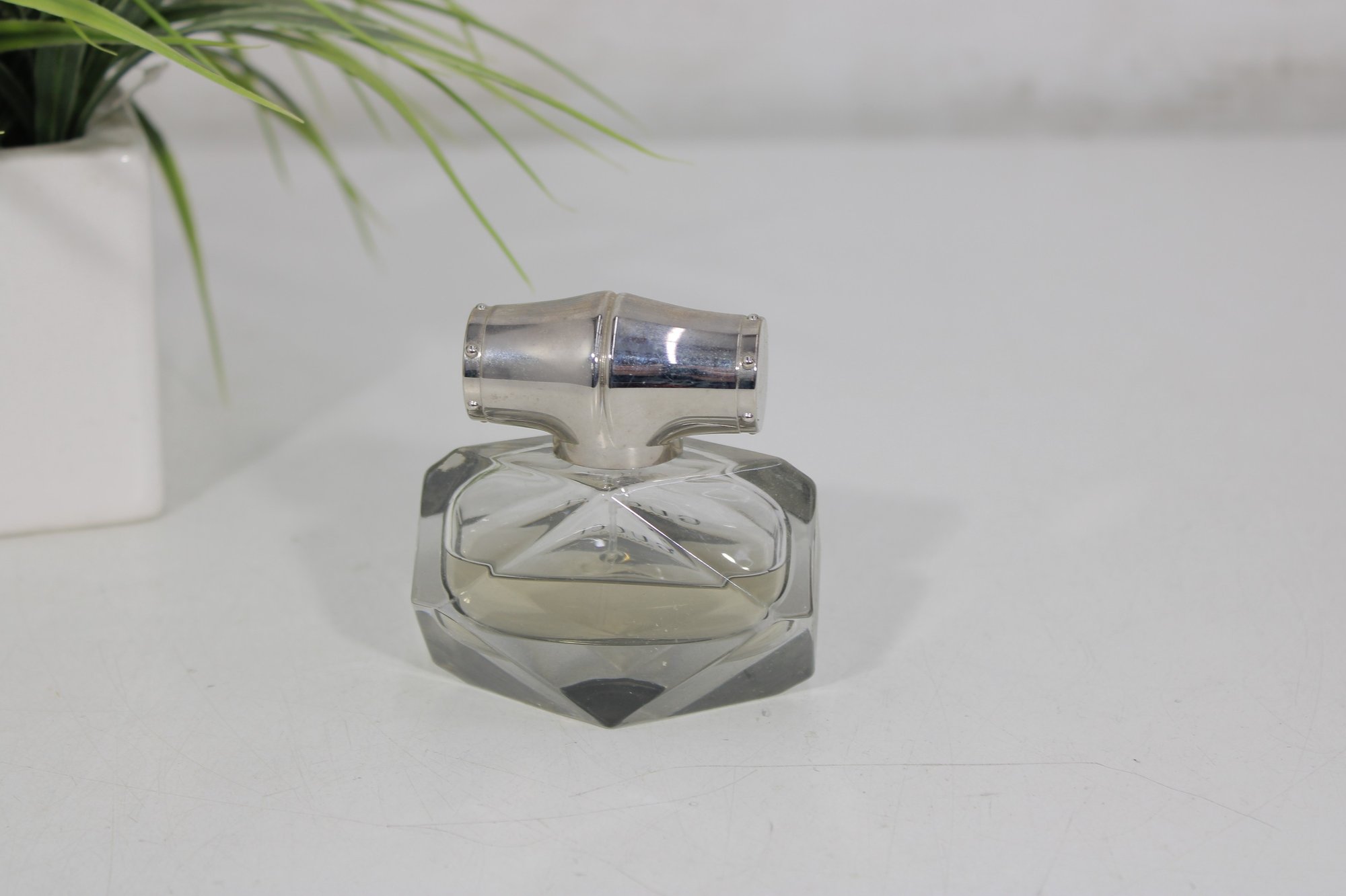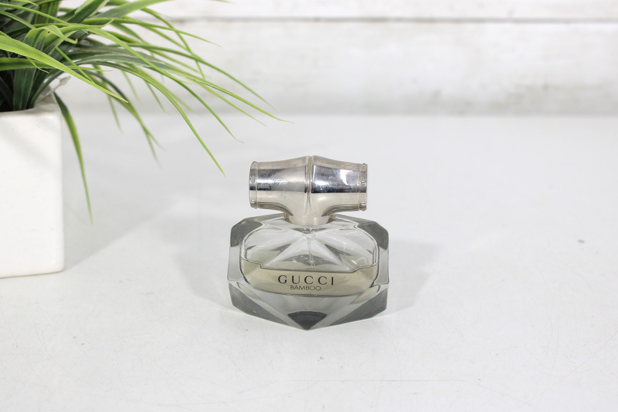 This beautifully crafted bottle features a faceted diamond-inspired glass base with sleek silver-tone bamboo-style cap, reflecting strength and femininity — the signature inspiration behind Gucci Bamboo.
