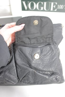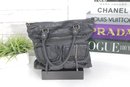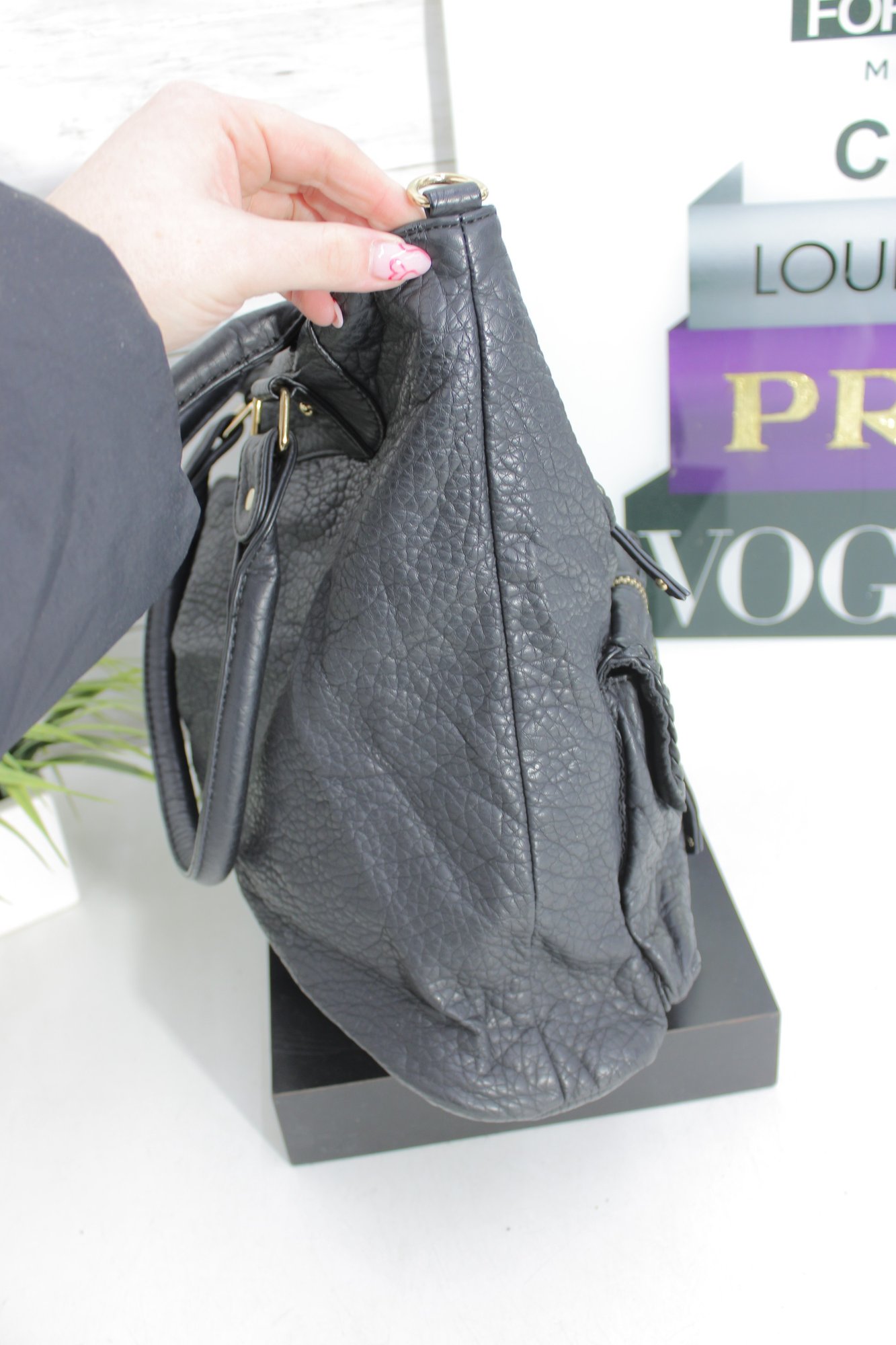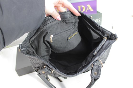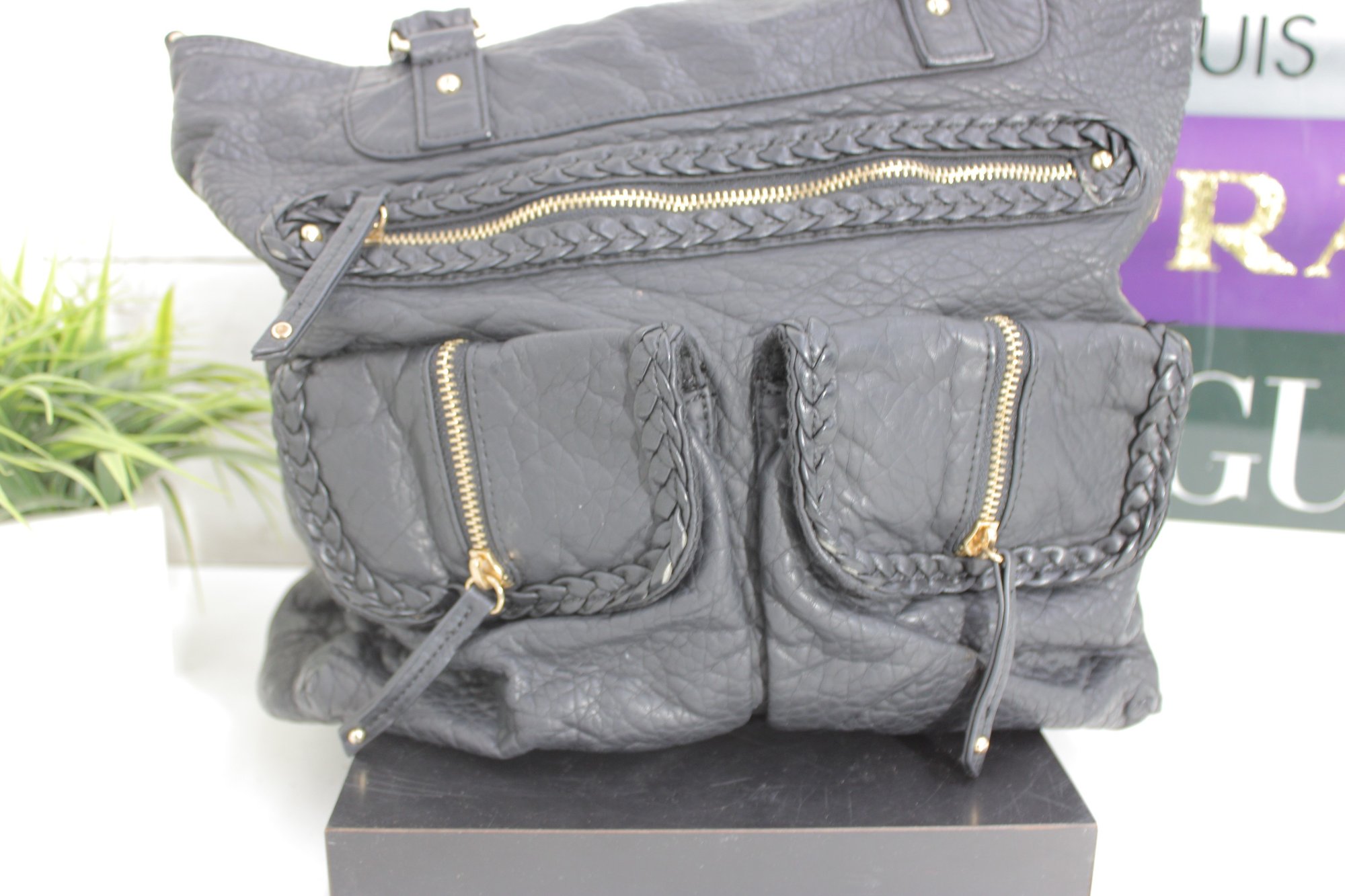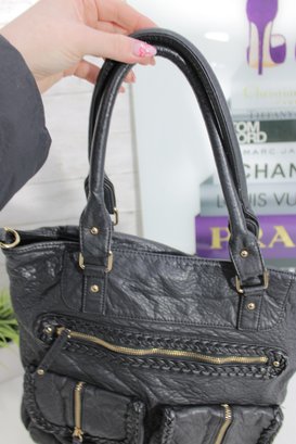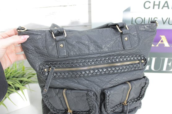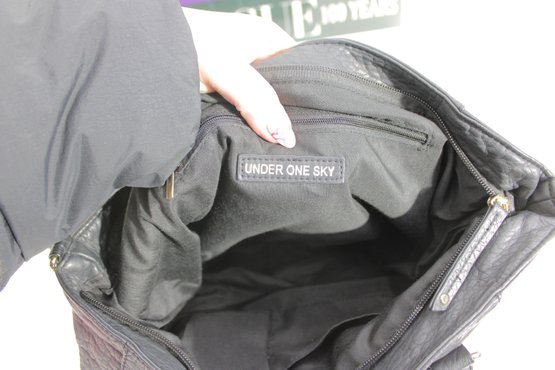 a stylish and functional Under One Sky black tote handbag featuring a soft, textured faux leather exterior with braided trim accents. This roomy bag combines everyday practicality with trendy detailing.