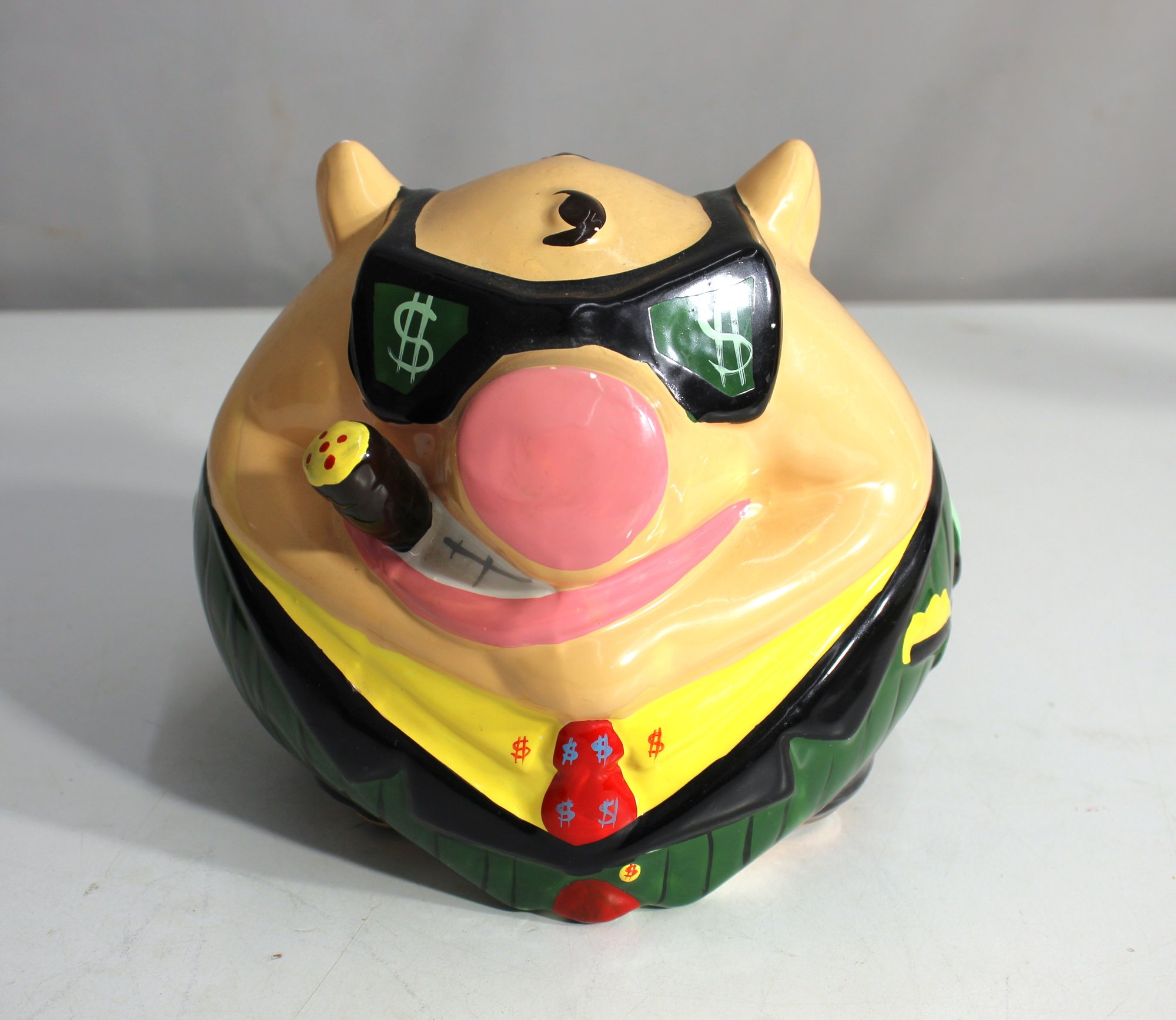 Add some humor to your savings with this "Fat pig" ceramic piggy bank, featuring a fun design complete with dollar sign sunglasses, a big grin, and a cigar. Dressed in a green pinstripe suit, this quirky bank exudes a "big spender" vibe, perfect for adding character to any space. This playful piece is ideal for collectors or as a gift for someone with a sense of humor. The bank has a coin slot on top and a removable stopper at the bottom for easy access. A unique and entertaining way to save up!