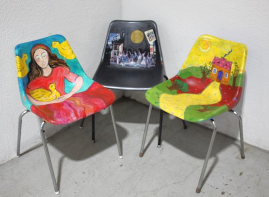 Add a splash of creativity to your space with this set of three uniquely hand-painted art chairs, each featuring a distinct design. One chair showcases a serene scene of a woman with ducks, perfect for nature lovers. The second chair presents a vibrant landscape with a quaint house and sunlit pathway, evoking a sense of home. The third chair, in black, brings a theatrical vibe with a collage depicting scenes from Broadway. Ideal for eclectic decor, these chairs are not only functional but also serve as striking art pieces. Some wear is present, but the artwork remains vibrant and eye-catching.