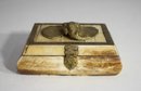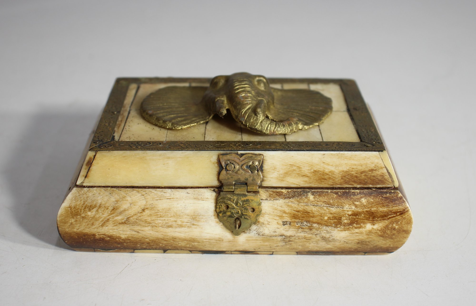 Bone exterior with brass detailing, including ornate hinges and an elephant centerpiece.