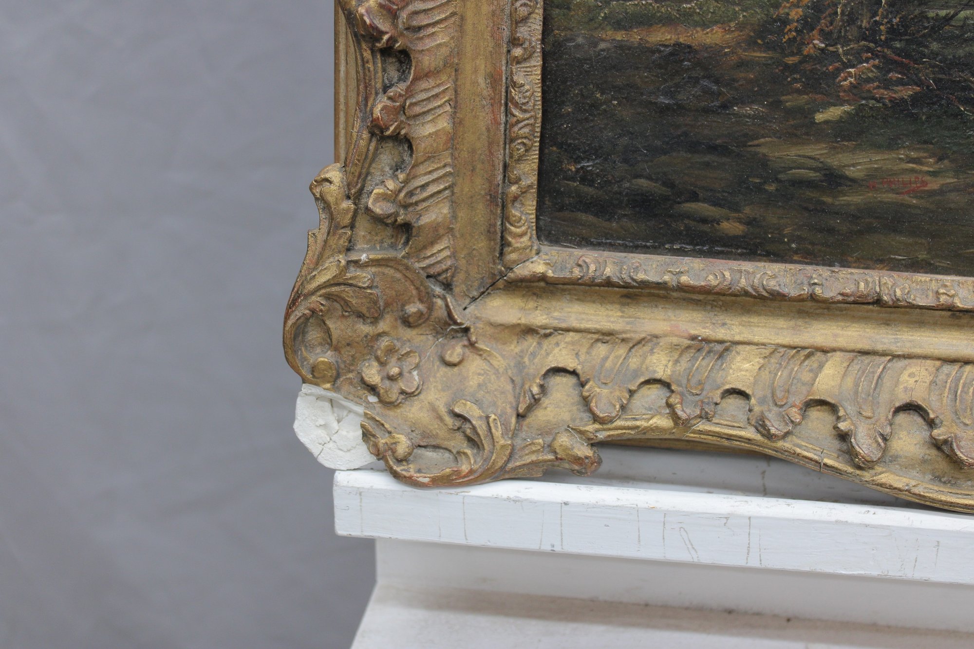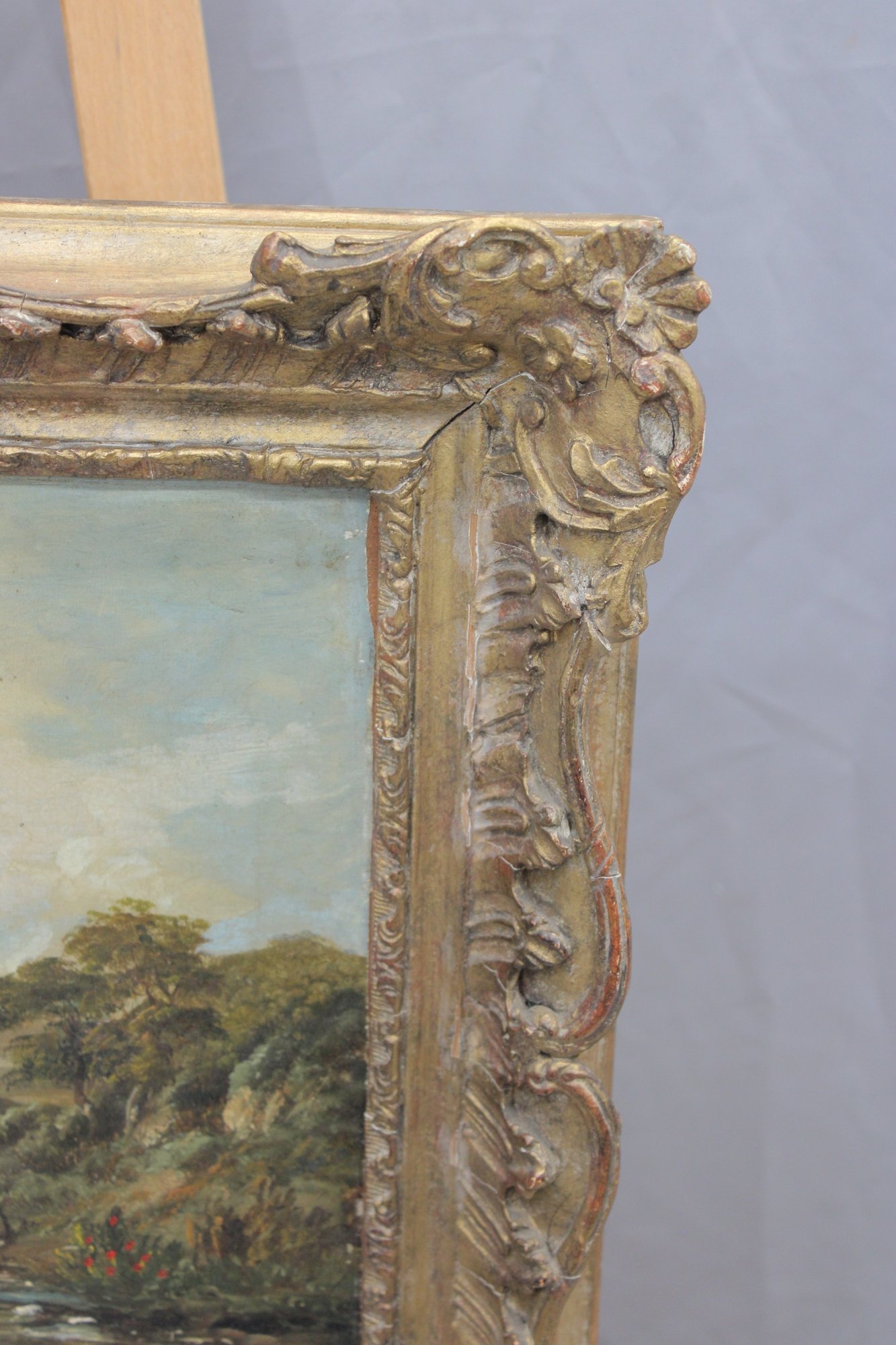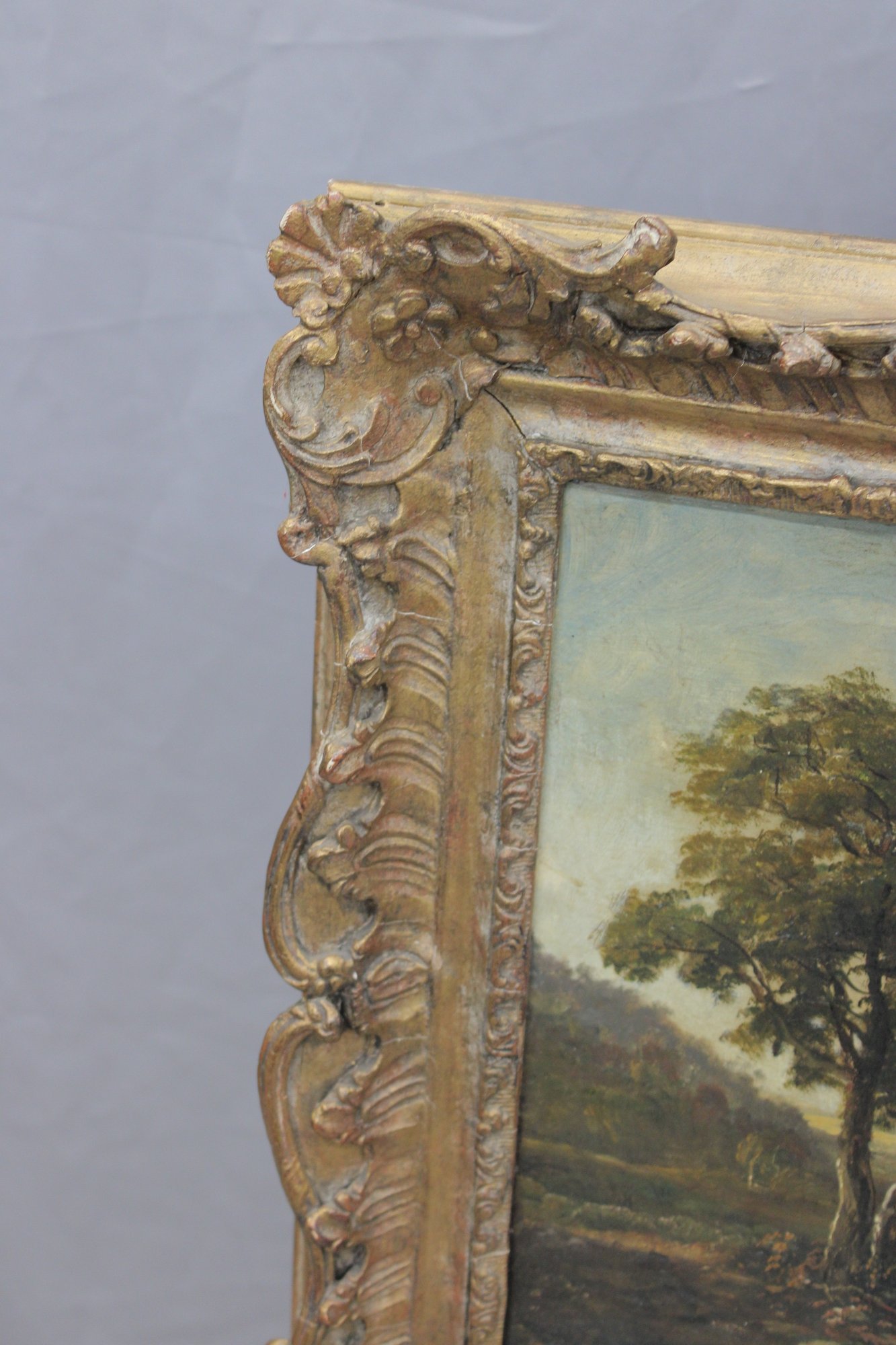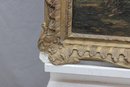 The painting is presented in an ornate gilt wood frame with deep relief foliate and scroll decoration, which enhances its decorative appeal and period character.