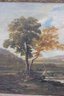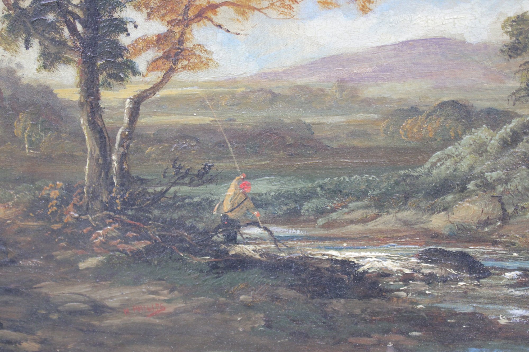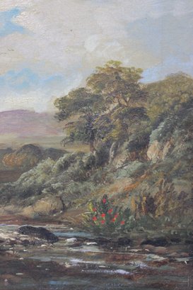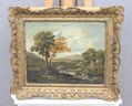 oil on artist board landscape painting, unsigned, depicting a tranquil riverside scene with trees, rolling countryside, and a small figure fishing along the water’s edge. The composition features confident brushwork, soft natural light, and a harmonious palette of greens, browns, and sky blues, evoking a traditional late-19th to early-20th-century landscape style.
