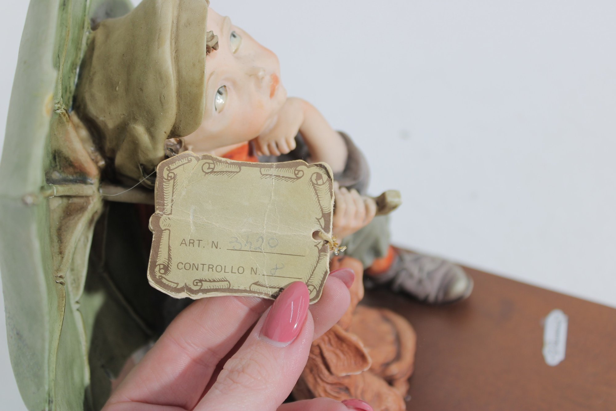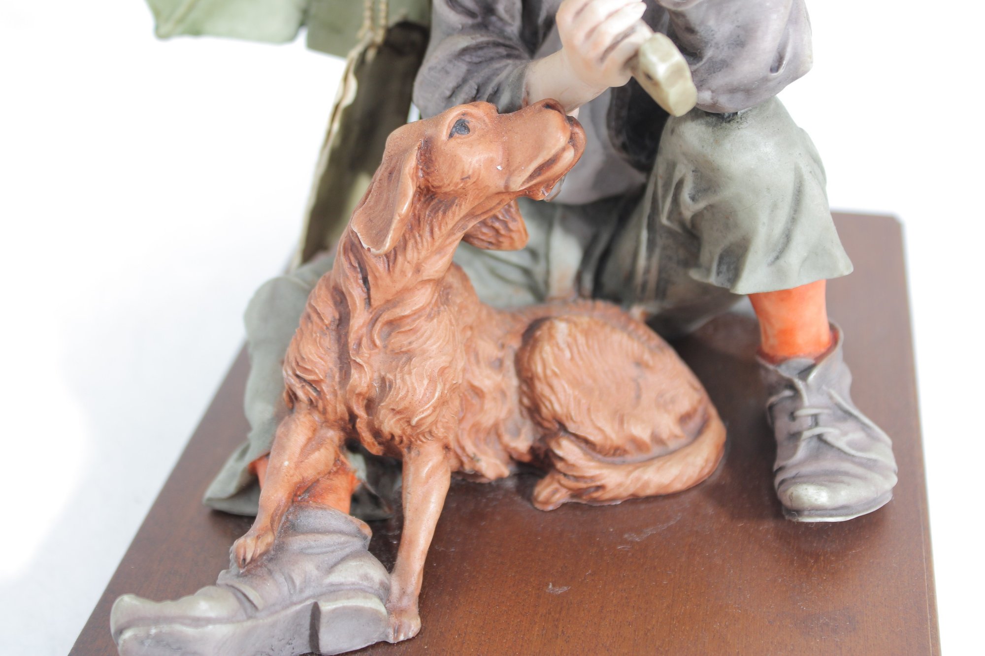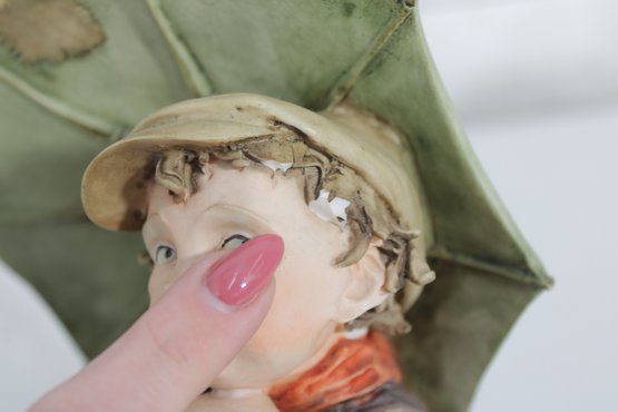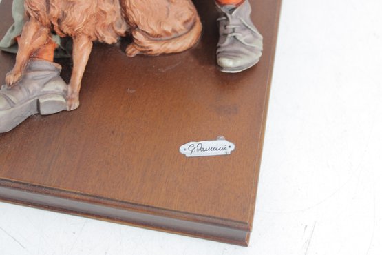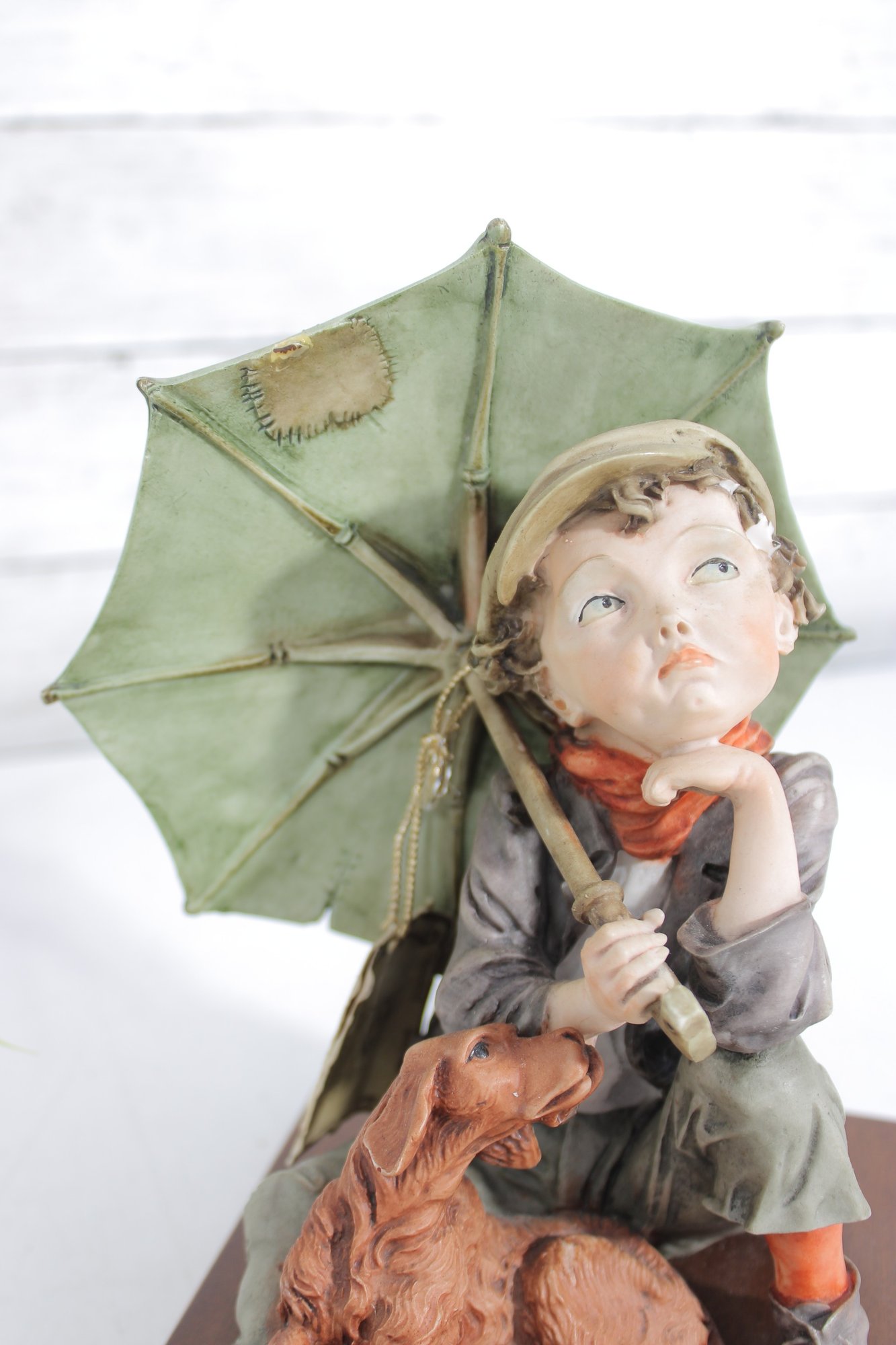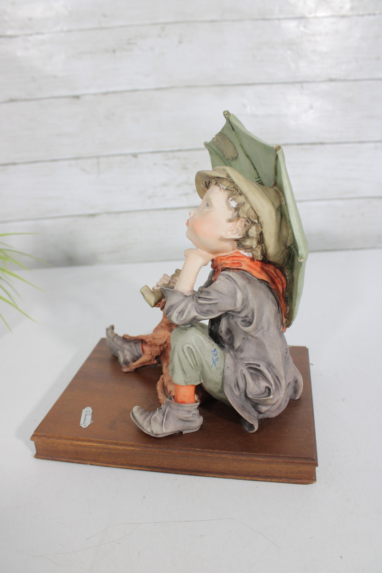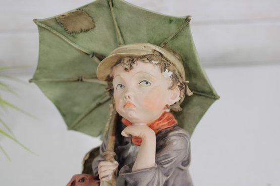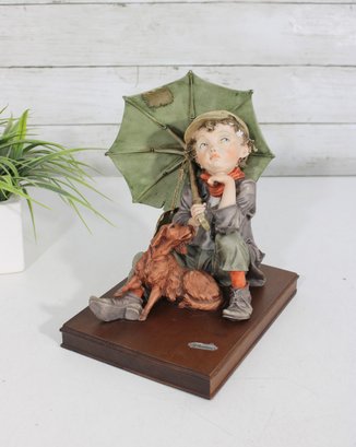 The piece is mounted on a wooden base and includes the original Certificate of Authenticity (COA) tag, confirming its origin from Florence, Italy. Intricate hand-painted details—from the boy’s soft facial features and textured clothing to the realistic dog and weathered umbrella—highlight the artistry of this renowned maker.