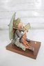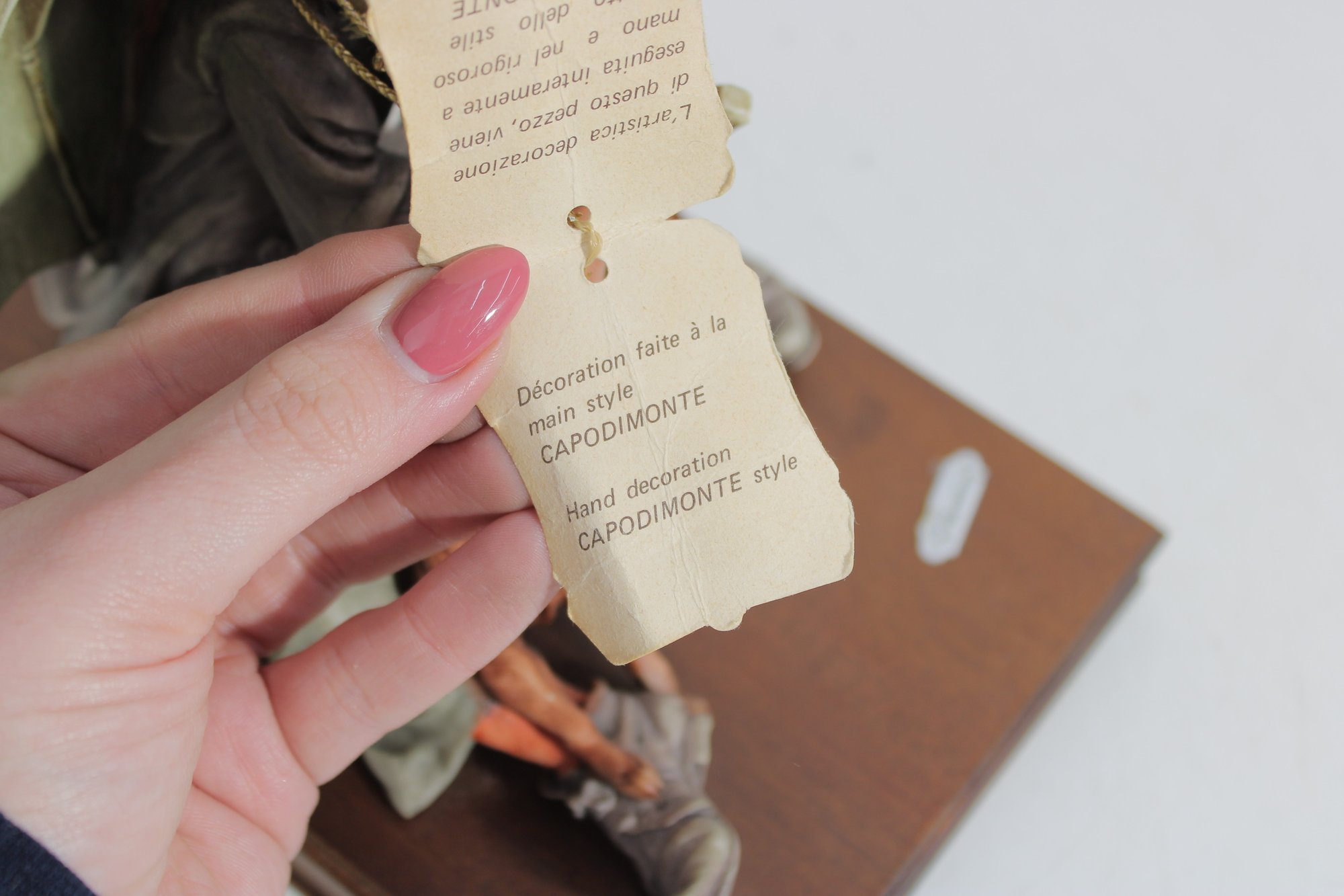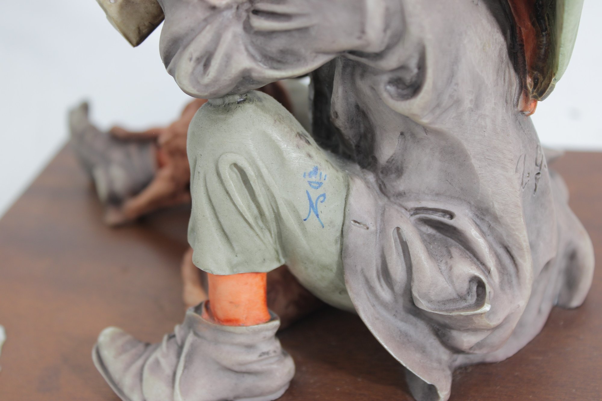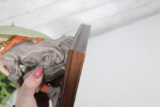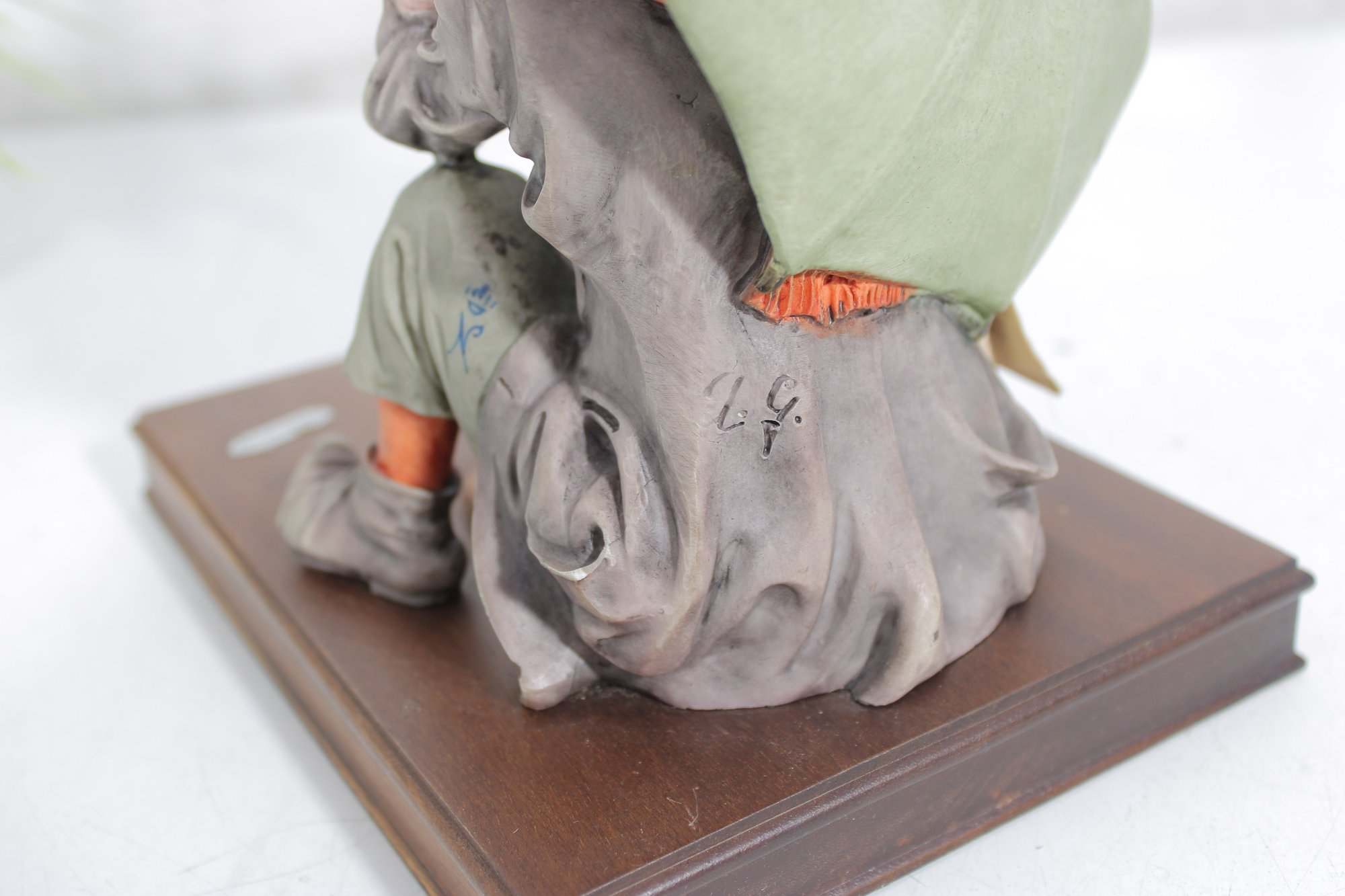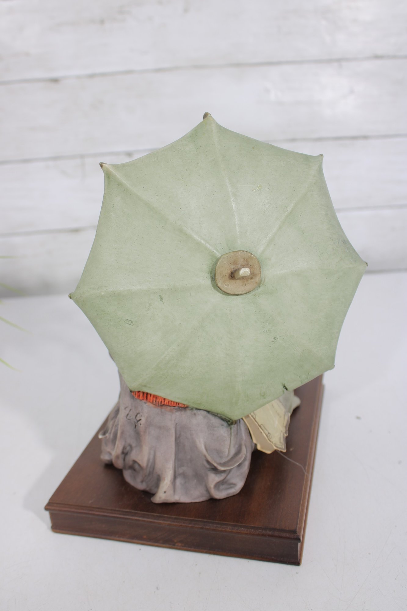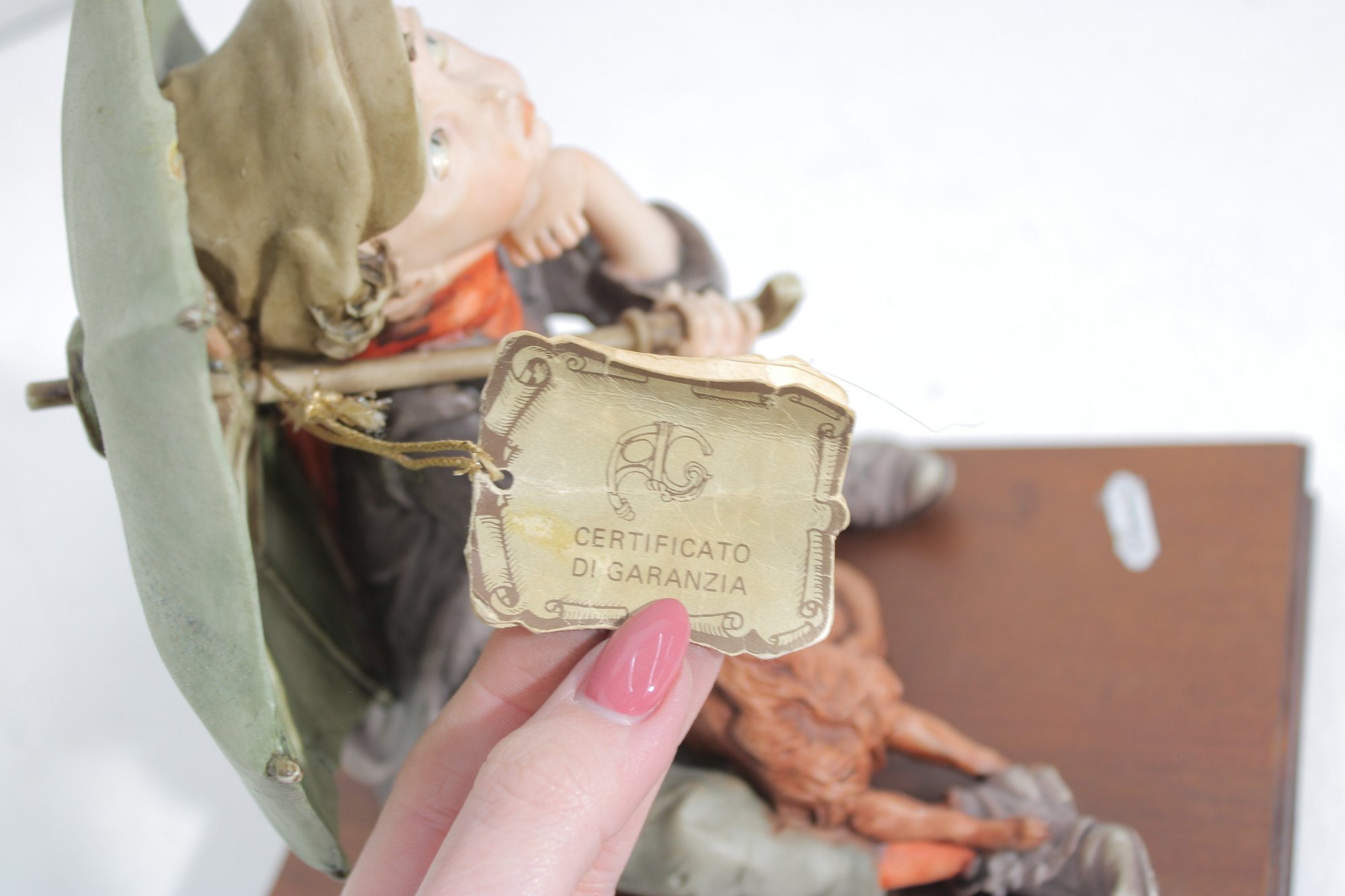 The piece is mounted on a wooden base and includes the original Certificate of Authenticity (COA) tag, confirming its origin from Florence, Italy. Intricate hand-painted details—from the boy’s soft facial features and textured clothing to the realistic dog and weathered umbrella—highlight the artistry of this renowned maker.