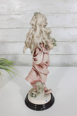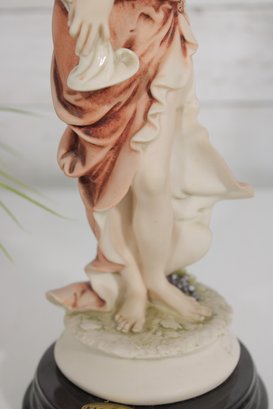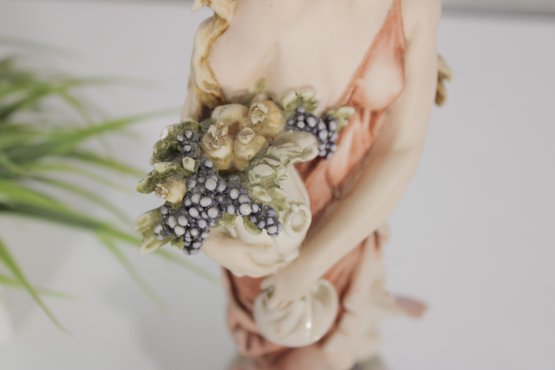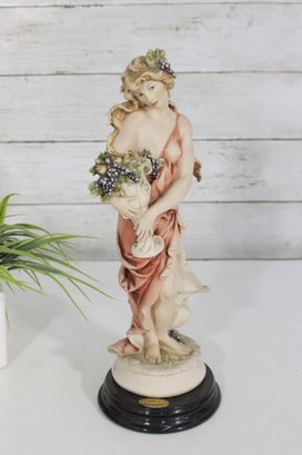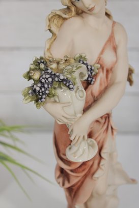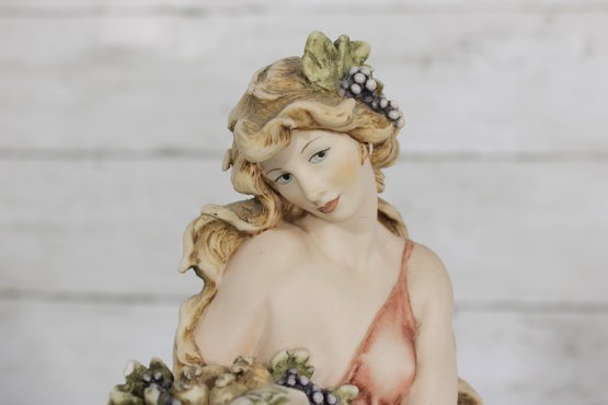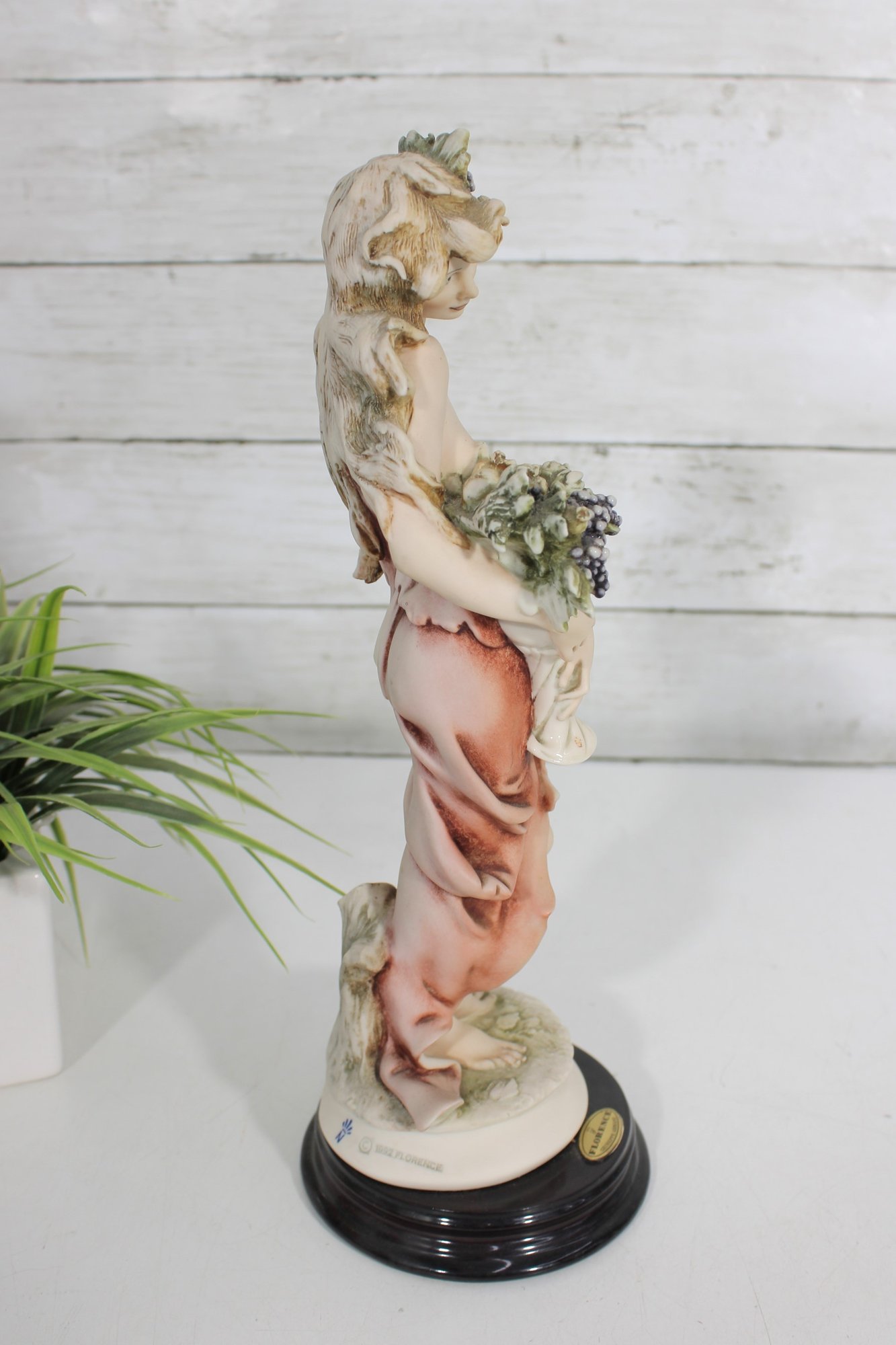 Stunning Giuseppe Armani Florence sculpture titled Autumn, featuring an elegant classical lady holding a floral amphora. This beautifully detailed piece captures the warmth and richness of the autumn season, with flowing garments in soft peach tones and a bouquet of grapes and flowers symbolizing harvest.