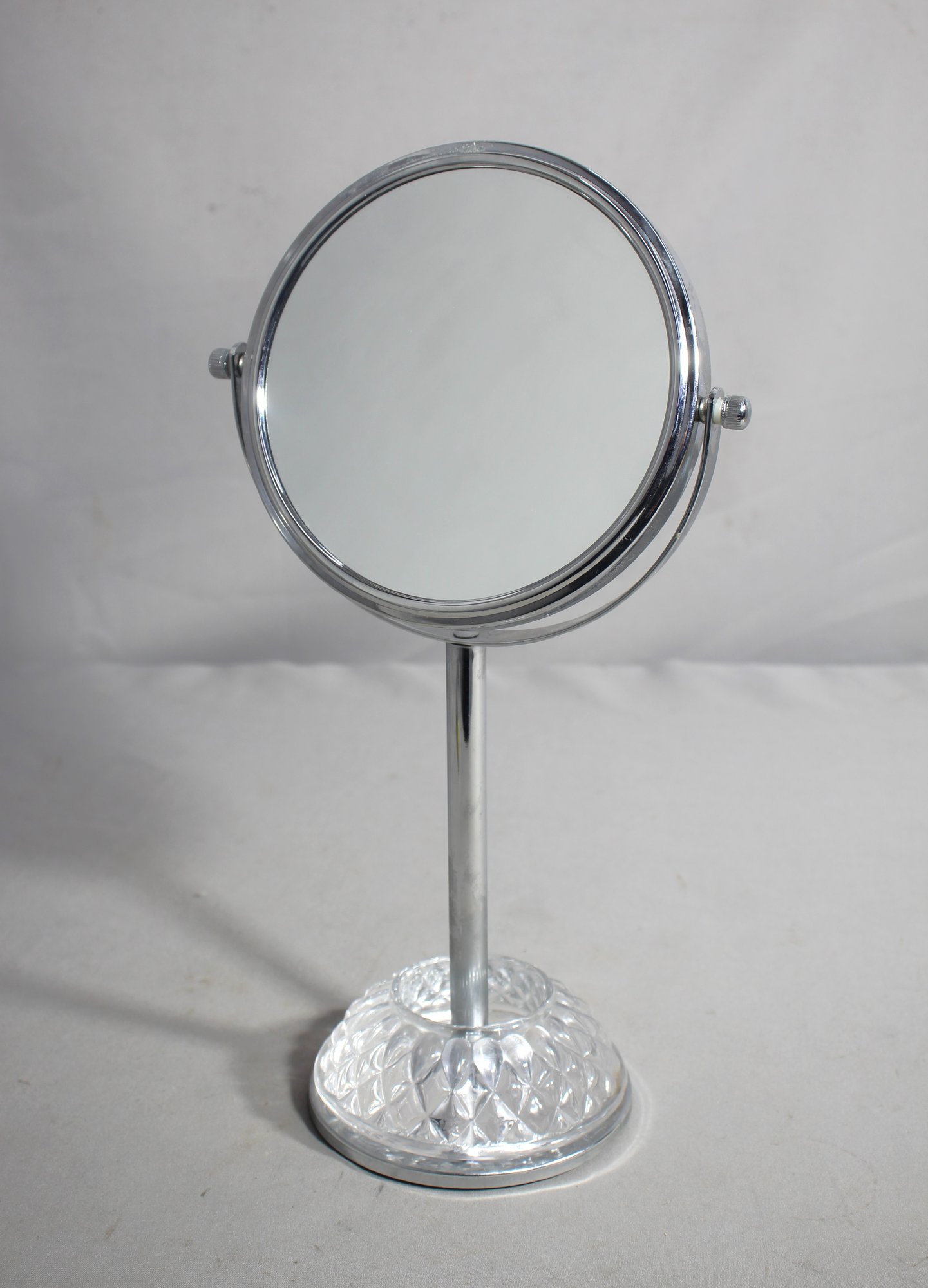 It features a classic circular mirror with a double-sided design, one being a standard reflection and the other offering magnification for detailed grooming. The mirror is framed in gleaming chrome, lending a touch of sophistication to its appearance. The stand and base showcase intricate crystal-cut designs on the glass, beautifully reflecting light and adding a decorative touch.