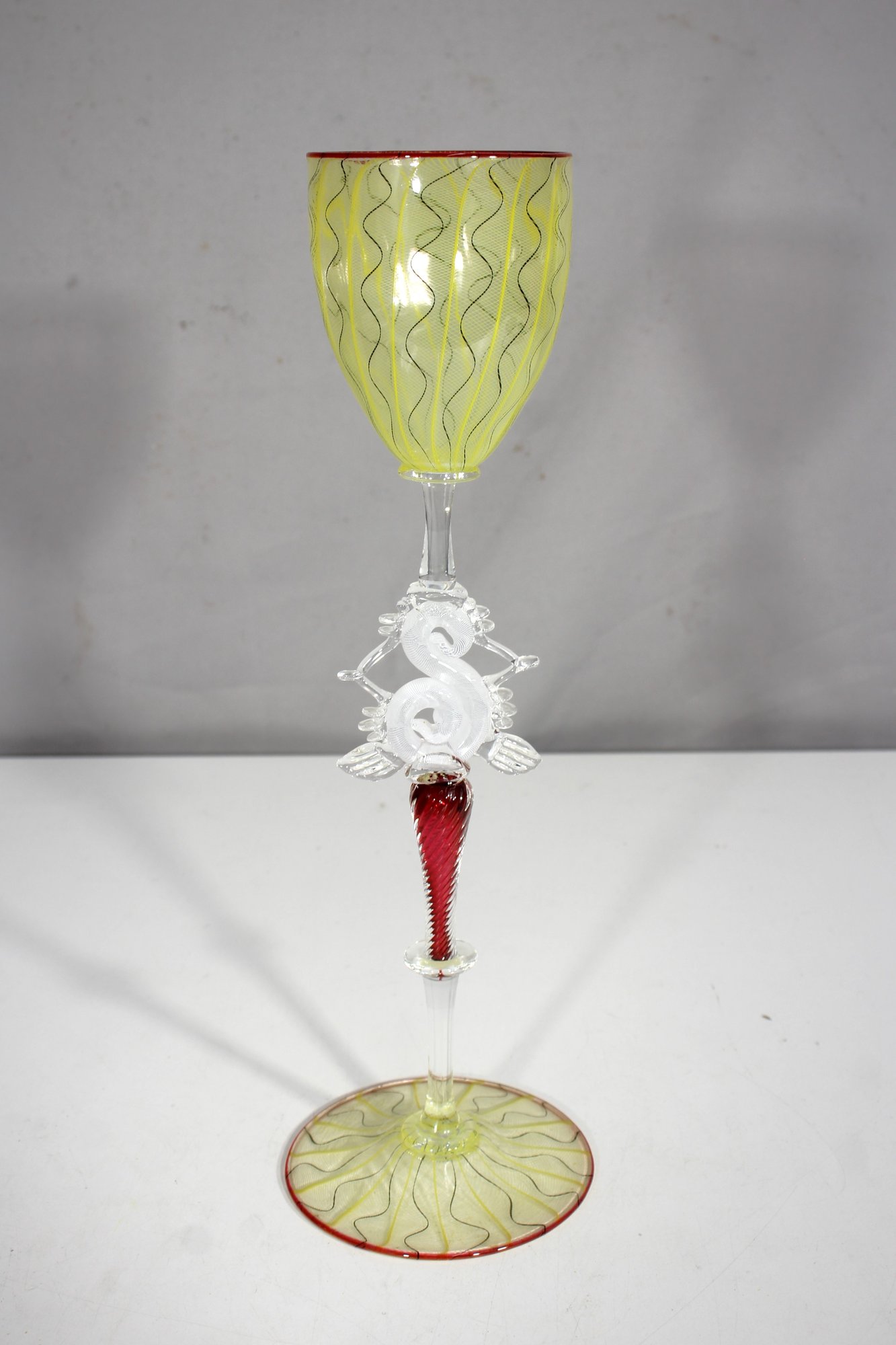Stunning in craftsmanship and vibrant in design, this Venetian-style hand-blown art glass goblet stands an impressive 14.5 inches tall. With delicate colorwork and ornate detail, it’s both a decorative showpiece and a masterful example of traditional glass artistry.