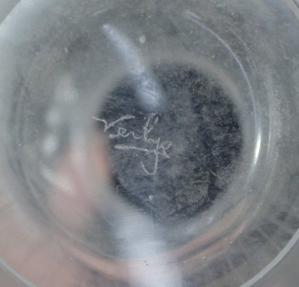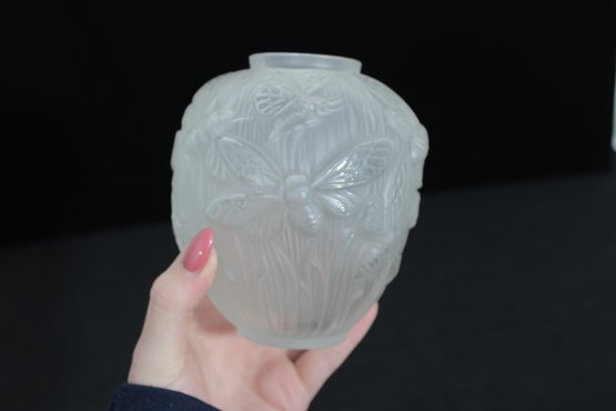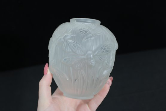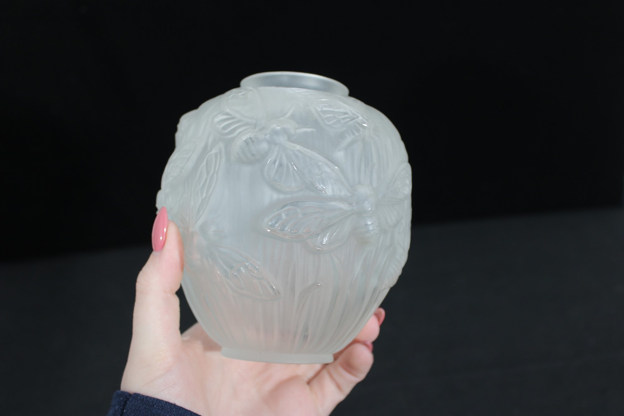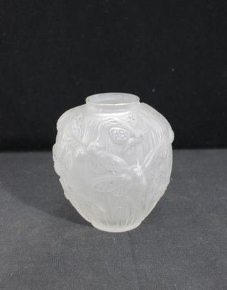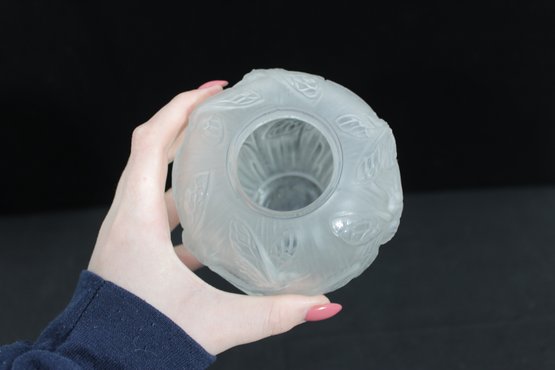 The satin-frosted finish enhances the intricate pattern, while the compact form makes it perfect for display or use with small floral arrangements. The base is signed “Verlys,” confirming authenticity.