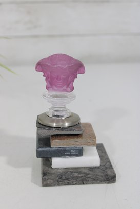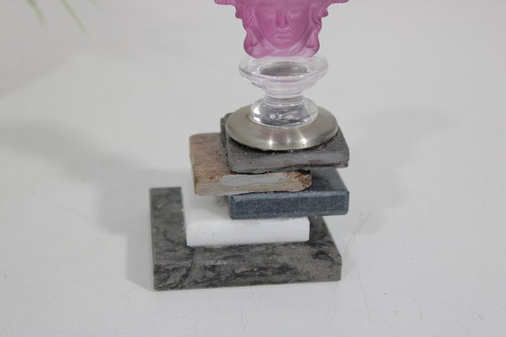 Unique decorative sculpture featuring a Versace-style Medusa head glass stopper mounted on a mixed-material base. The top showcases a translucent pink glass Medusa motif, reminiscent of classic Versace design, set above a layered base of marble, stone, metal, and acrylic elements.