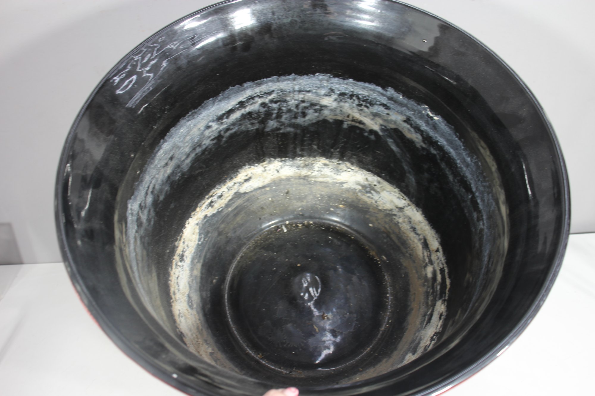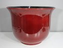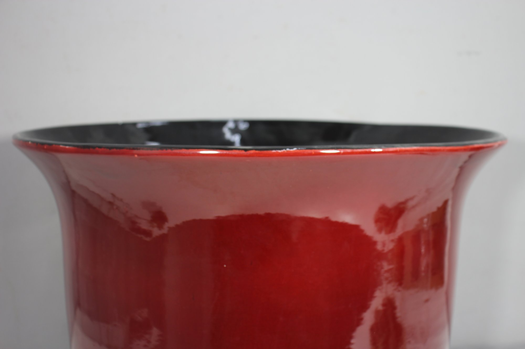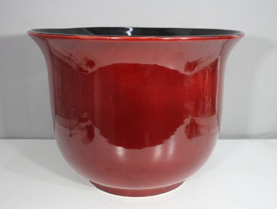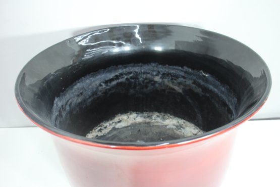 a stunning oversized ceramic planter, measuring 17 inches high and 22 inches in diameter. This beautifully crafted piece features a glossy deep red exterior with a sleek black interior glaze, making it an eye-catching addition to any space.