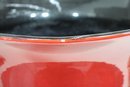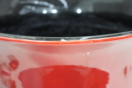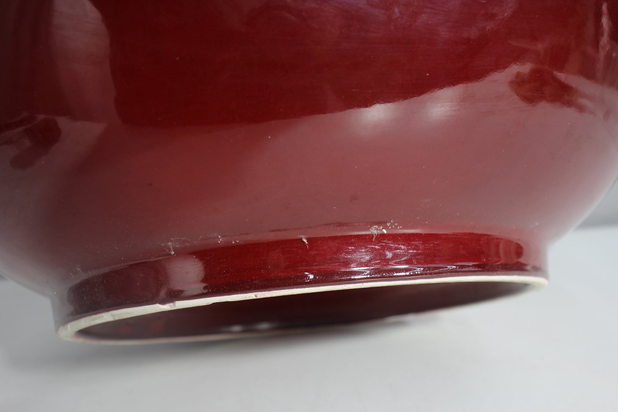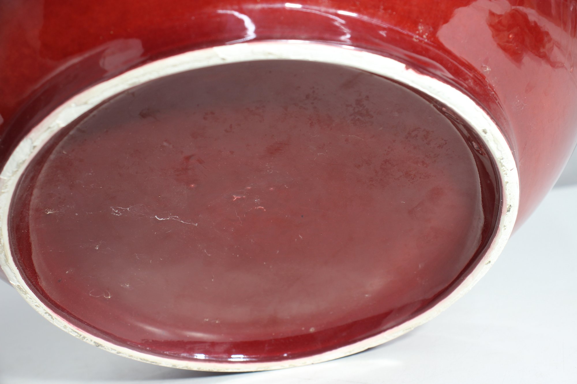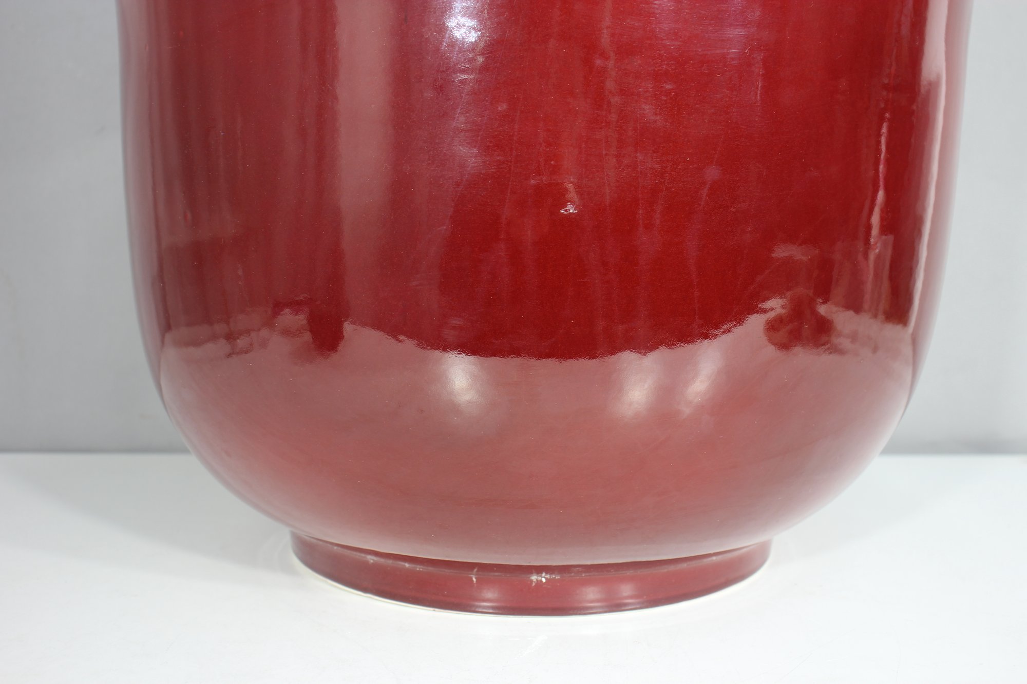 a stunning oversized ceramic planter, measuring 17 inches high and 22 inches in diameter. This beautifully crafted piece features a glossy deep red exterior with a sleek black interior glaze, making it an eye-catching addition to any space.