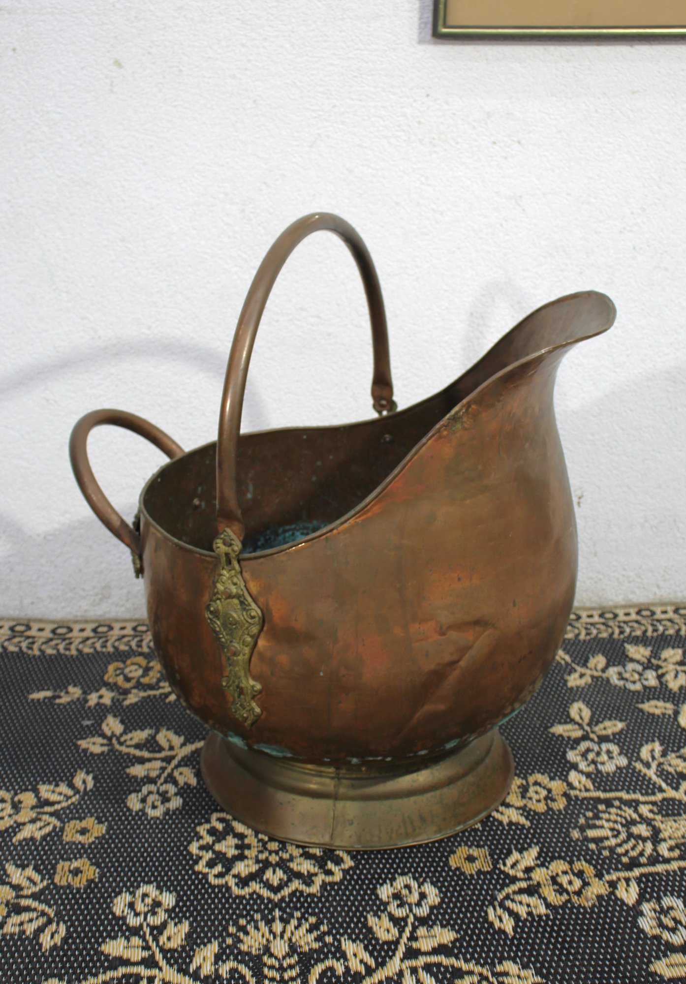 This impressive vintage brass & Copper coal scuttle stands 24 inches tall and 19 inches wide, making it a substantial decorative piece with both functional and historical charm. The scuttle features a gracefully curved body with a large, sturdy handle for easy carrying and an additional decorative handle on the back. Intricate brass accents, including detailed motifs on the handles and sides, add to its antique appeal. The interior shows a natural patina, adding authenticity and character to the piece. This large brass scuttle is ideal as a statement decor item, umbrella holder, or for its original use as a fireplace accessory. Perfect for vintage collectors or those looking to add a touch of rustic elegance to their home.