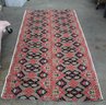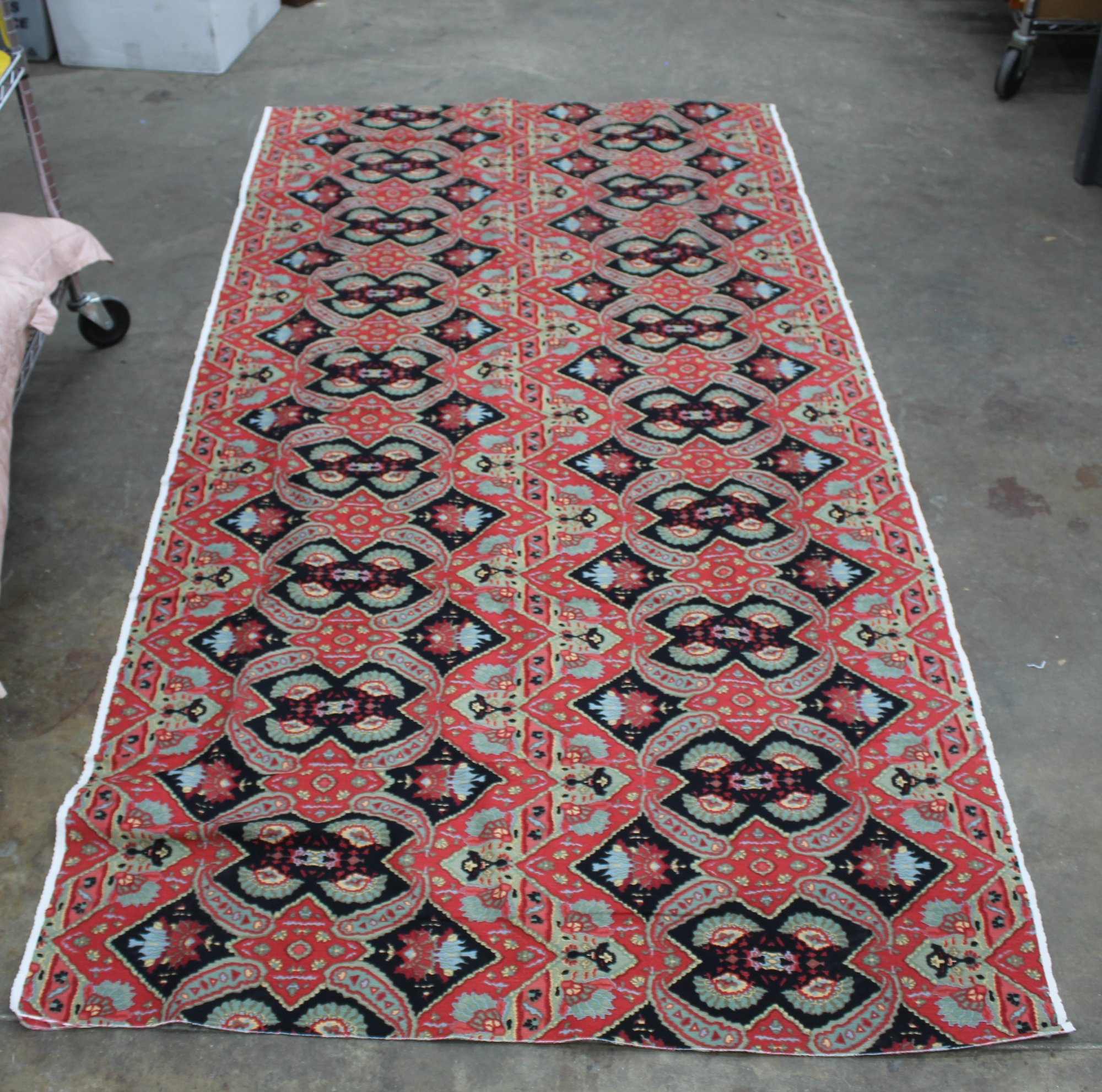 This striking fabric panel showcases a bold geometric and floral pattern in rich shades of red, black, and green. The intricate design features