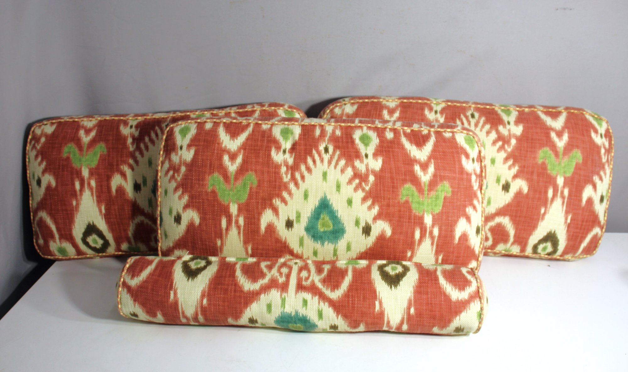 Add a splash of color and style to your space with this set of four daybed pillows featuring a bold ikat pattern in shades of red, green, and cream. The set includes three rectangular cushions and one bolster pillow, each showcasing intricate detailing that brings a lively, bohemian flair to any setting. Perfect for adding comfort and personality to a daybed or lounge area. These pillows are not only decorative but also functional, providing extra support for cozy relaxation.