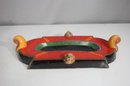 This whimsical and colorful ceramic tray in the spirit of Katya Apekina’s playful, figurative art style, featuring bold geometric shapes and hand-sculpted animalistic faces. This expressive piece showcases a rich color palette of red, green, orange, and black with raised curled-horn designs on either side and stylized facial elements on each edge—adding character and intrigue to this one-of-a-kind piece.