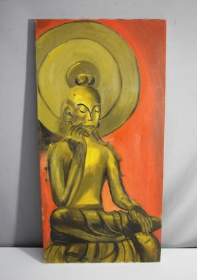 This is a striking contemporary artwork portraying a serene Buddha figure, painted in bold shades of yellow and red. The piece beautifully captures the meditative essence of the Buddha, with a halo effect behind the head that adds a spiritual depth to the composition. The artist's signature and the year '17 are marked on the lower corner. Painted on a stretched canvas, this piece brings a sense of peace and vibrant energy, making it an ideal centerpiece for any room or collection. Its modern style and color palette ensure that it complements a variety of interior designs.
