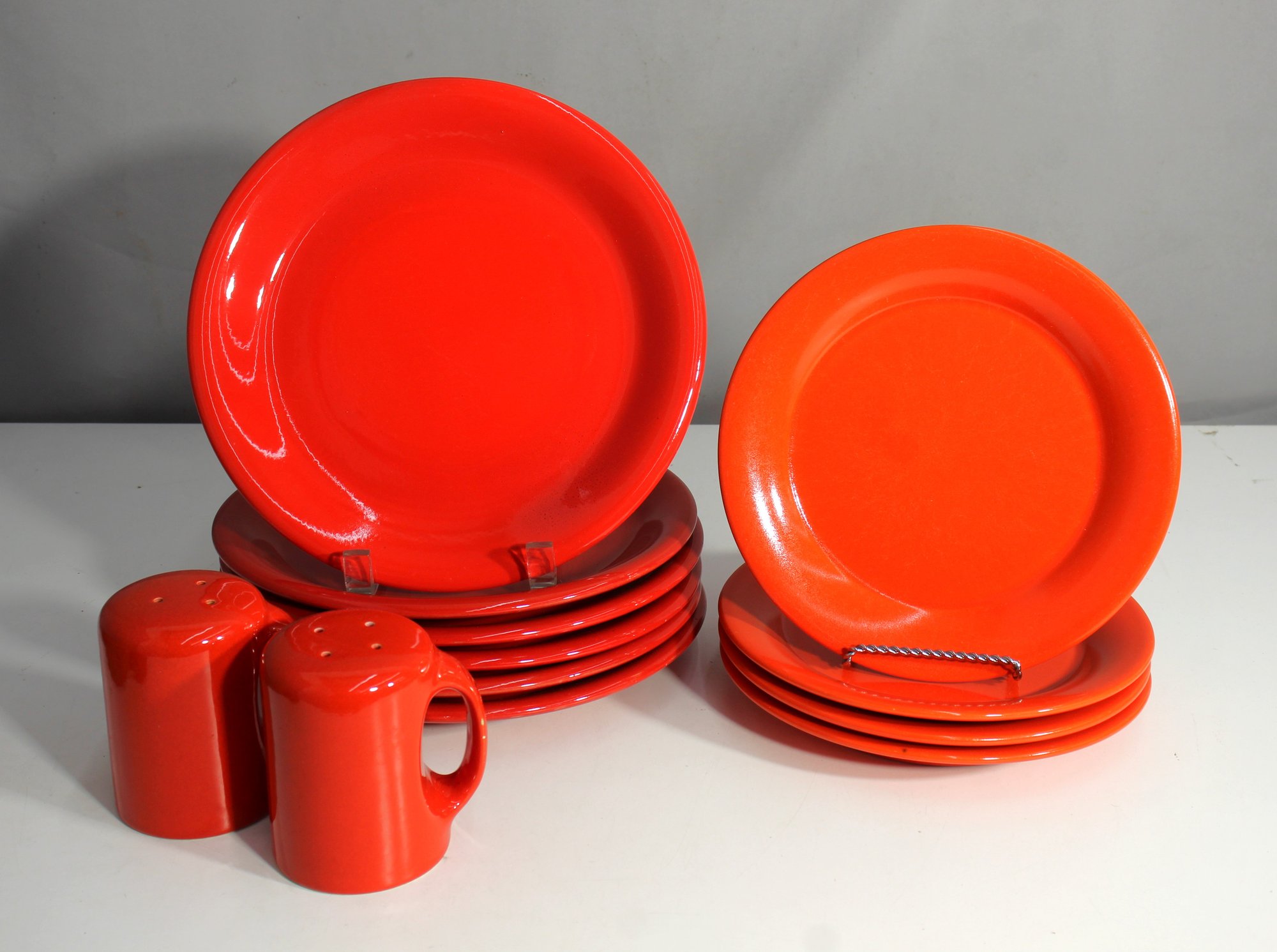 This bold and colorful dinnerware set includes a mix of vibrant orange and red plates, as well as a pair of matching salt and pepper shakers. The set features pieces from Franciscan, known for quality craftsmanship, alongside unmarked red plates that perfectly complement the collection. The bright hues make this set an eye-catching addition to any table setting. Ideal for those who love retro or modern design, this set will add a pop of color and personality to your dining experience. Perfect for everyday use or display.