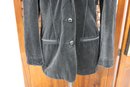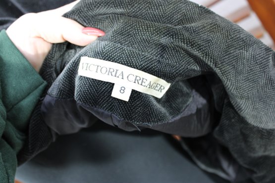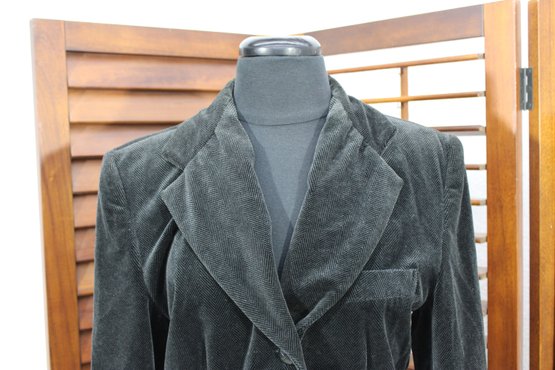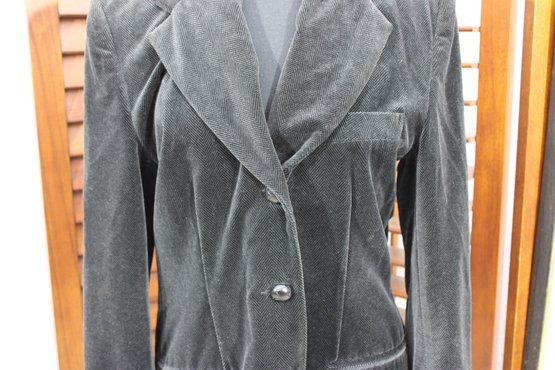 a stylish women’s blazer by Victoria Creager, size 8. Crafted in a rich black velvet, this jacket features a tailored silhouette with notched lapels, front button closure, and structured seams for a flattering, polished look.