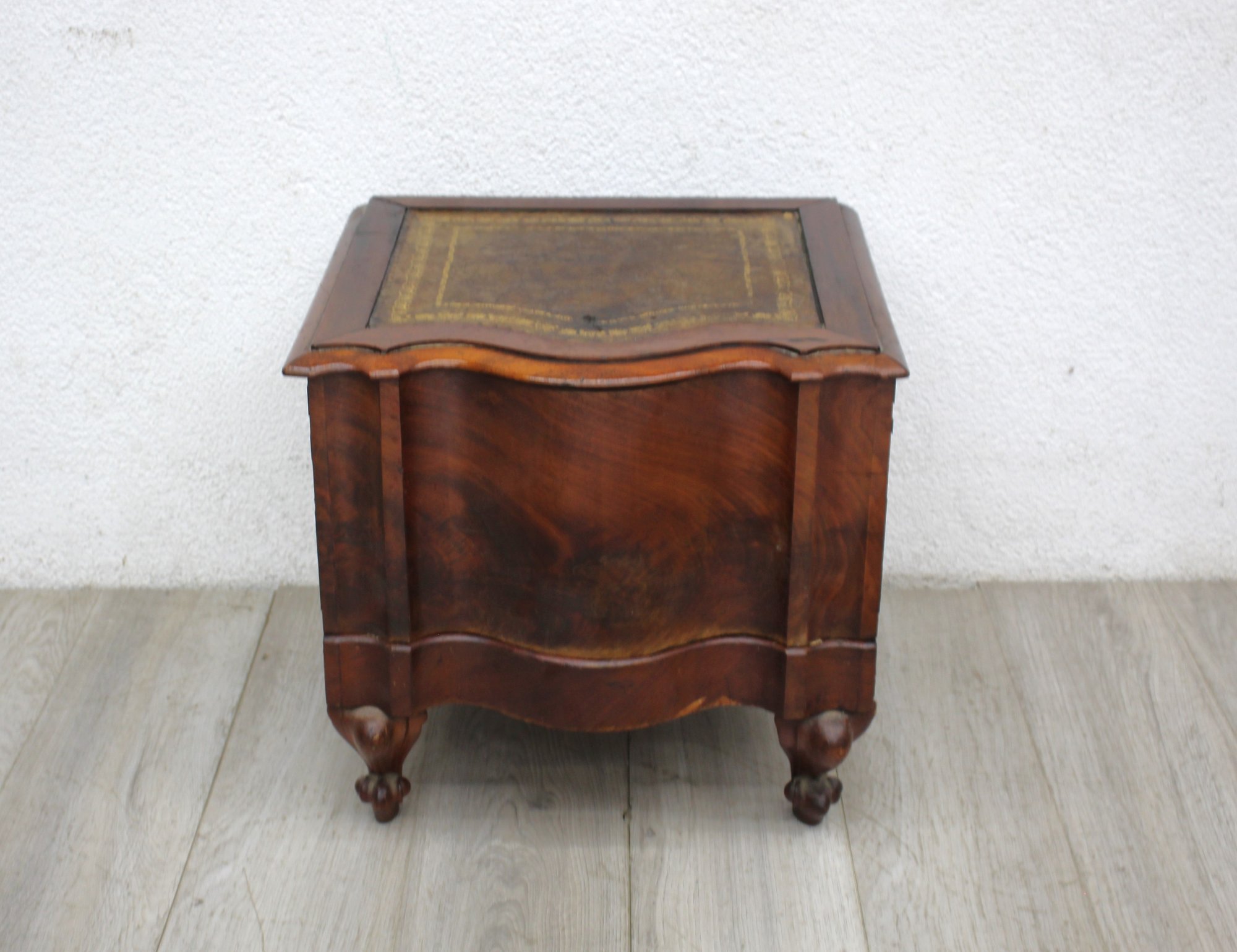 This Victorian mahogany bed step features beautiful wood grain and a leather inlay on top. Some wear is evident, but it remains a functional and elegant piece for any vintage-inspired bedroom.