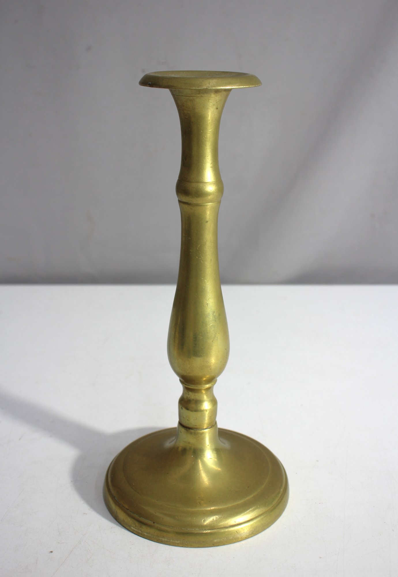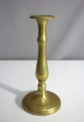 vintage brass candlestick stands 11 inches tall, showcasing a timeless design with a slender, curved body and a round base. The piece features a warm patina, adding to its charm and character, and makes a perfect addition to any classic or eclectic décor.