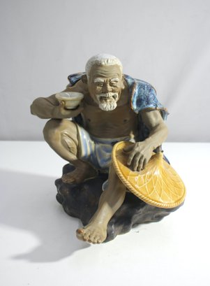 A beautifully detailed vintage ceramic figurine featuring a crouching elderly man holding a cup and hat. This piece stands approximately 11 inches tall and showcases a hand-painted design with textured details, including a vibrant blue drape. A maker's stamp is located on the inside bottom of the figure. This collectible artwork exudes craftsmanship and is perfect for display or as an addition to a ceramic art collection. Condition is excellent with no visible chips or cracks. A unique piece with historical charm.