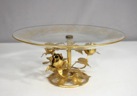stunning vintage glass cake stand, featuring an elegant etched floral design on the glass top and an ornate gold-tone metal base adorned with sculpted roses and leaves.