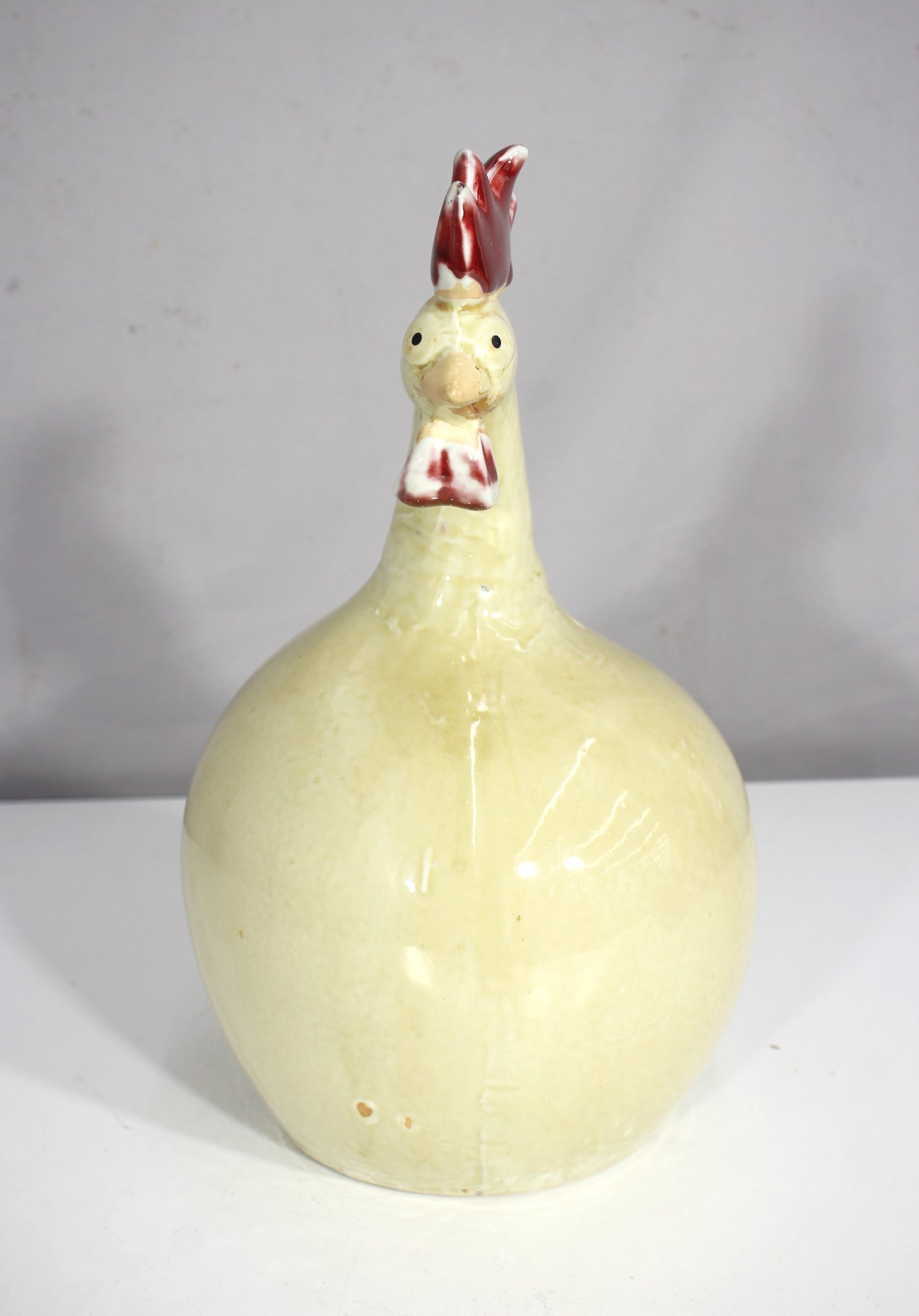 This rooster doubles as both décor and a conversation piece with its exaggerated rounded body and perched tail. The ceramic shows a beautiful aged patina, especially near the base and tail area, adding vintage authenticity and character.
