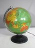 a beautiful vintage illuminated 14-inch world globe, featuring a classic mid-century design. This globe showcases a vibrant green and orange color scheme with detailed cartography, mounted on a sturdy black base with a metal meridian arm for smooth rotation and positioning.