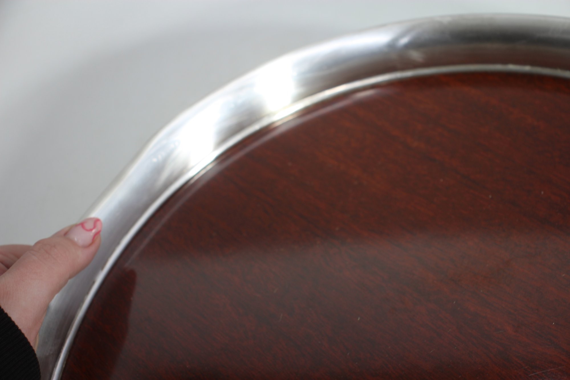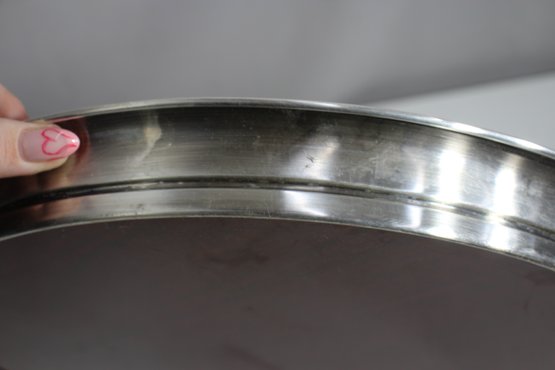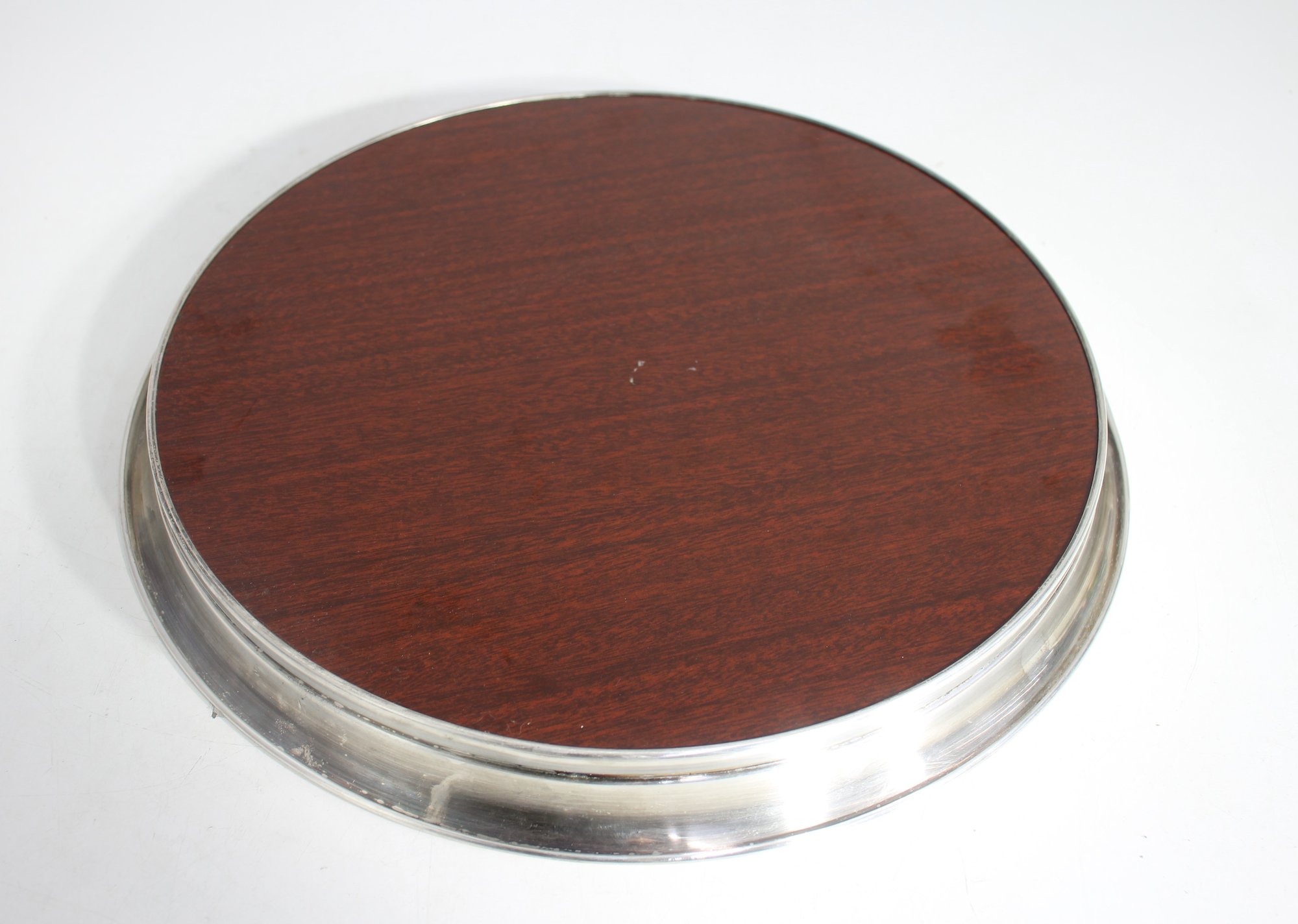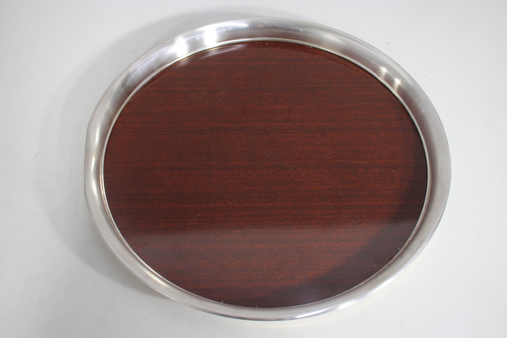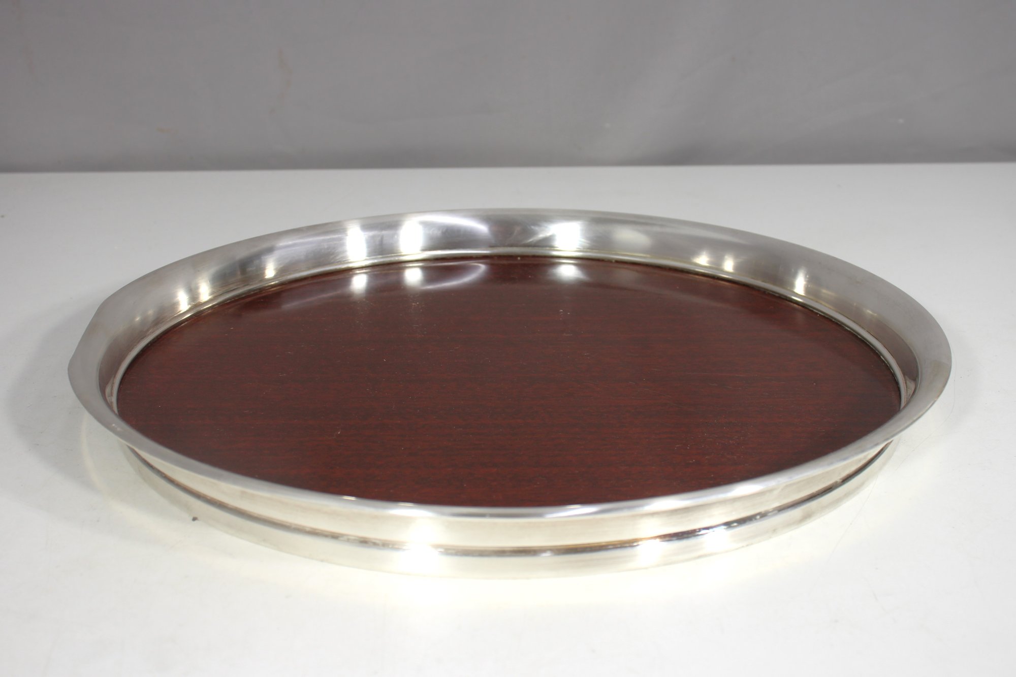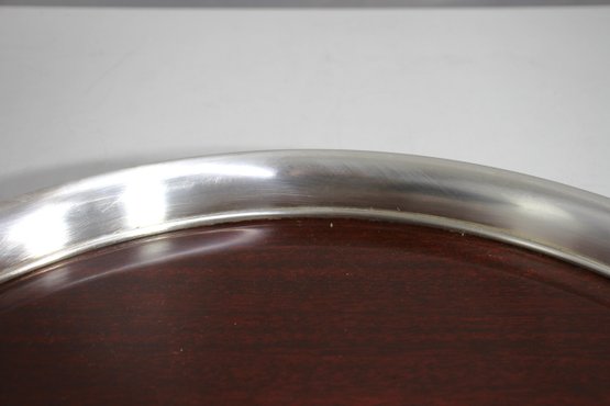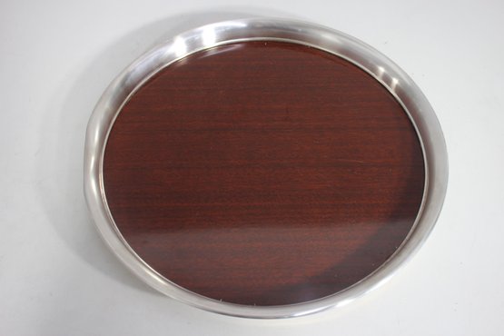 vintage 15” round serving tray features a rich woodgrain surface encased in a polished silver-tone metal rim. A perfect blend of mid-century style and functionality, this tray is ideal for serving drinks, displaying décor, or adding a touch of sophistication to your space.We invite everyone to join us for an in-person preview of the items from Thursday through Saturday, 10 am to 2 pm. Keep in mind that photographs may not capture all details accurately.