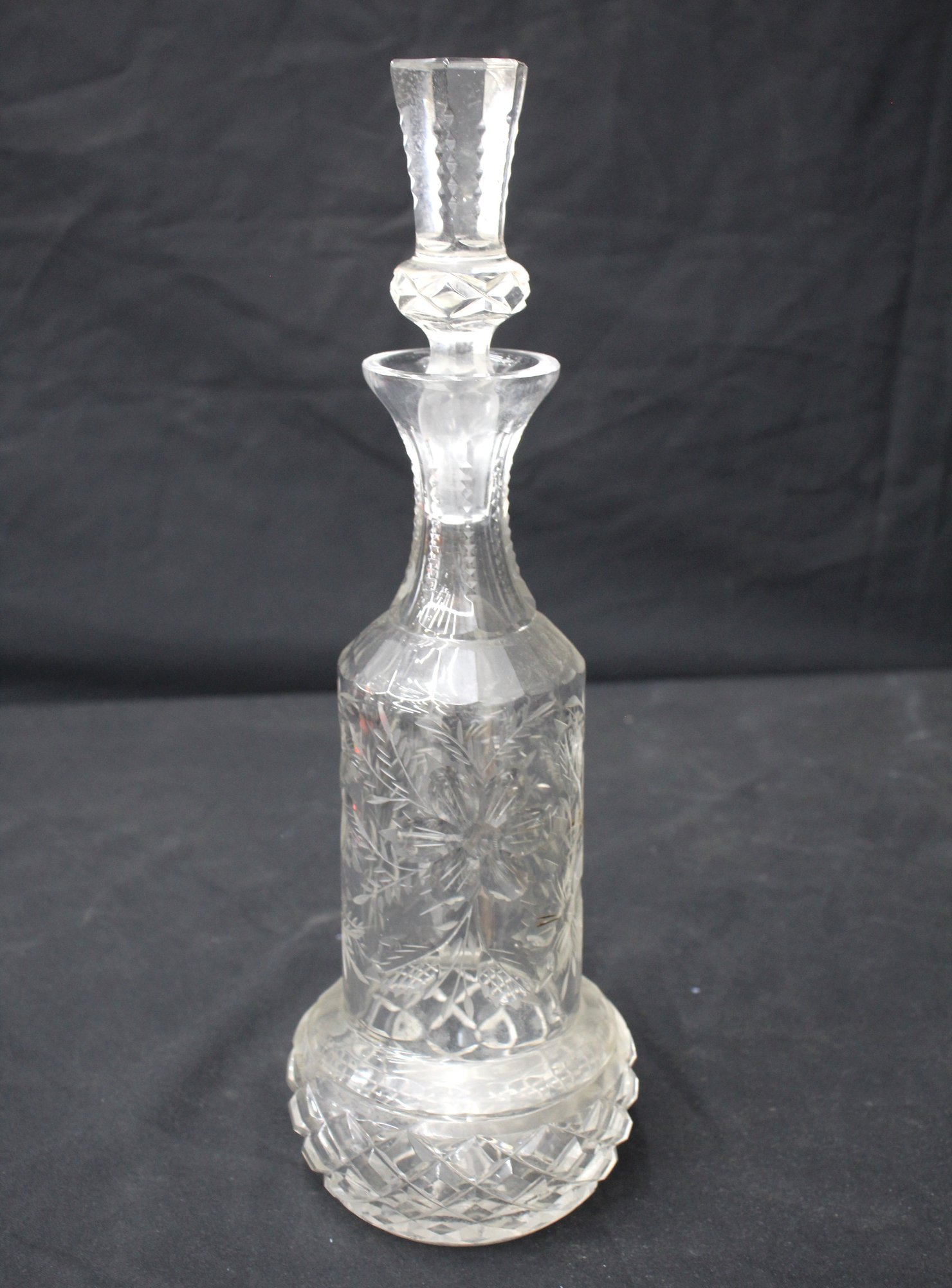 This elegant crystal decanter stands at an impressive 16 inches with the stopper. It features intricate cut glass patterns, including a floral motif on the body and a diamond-cut design on the base, adding a touch of vintage charm to any display. The stopper, beautifully detailed to match the decanter, fits securely. Perfect for collectors or as a stunning display piece.