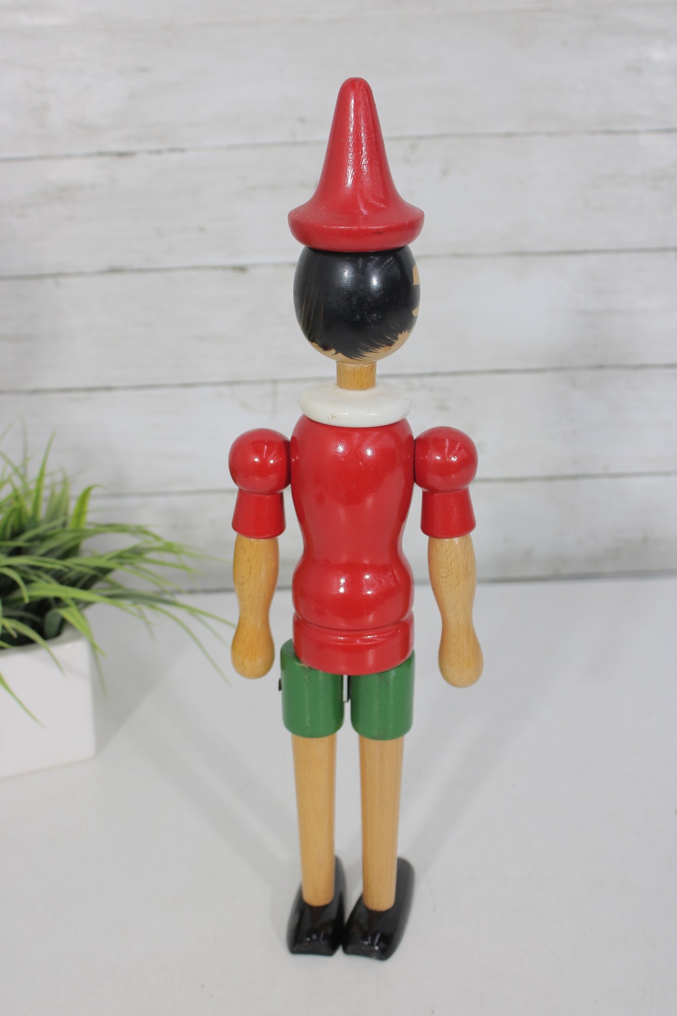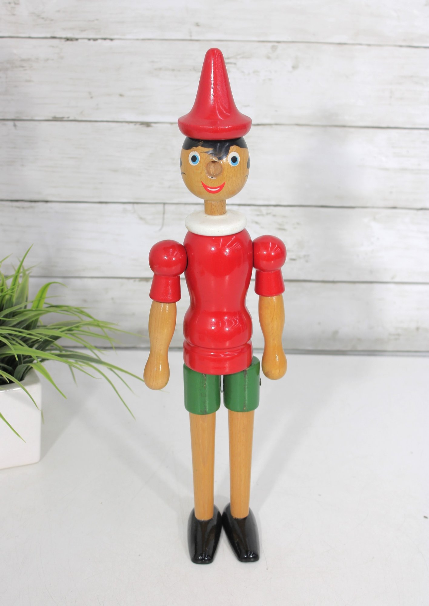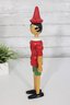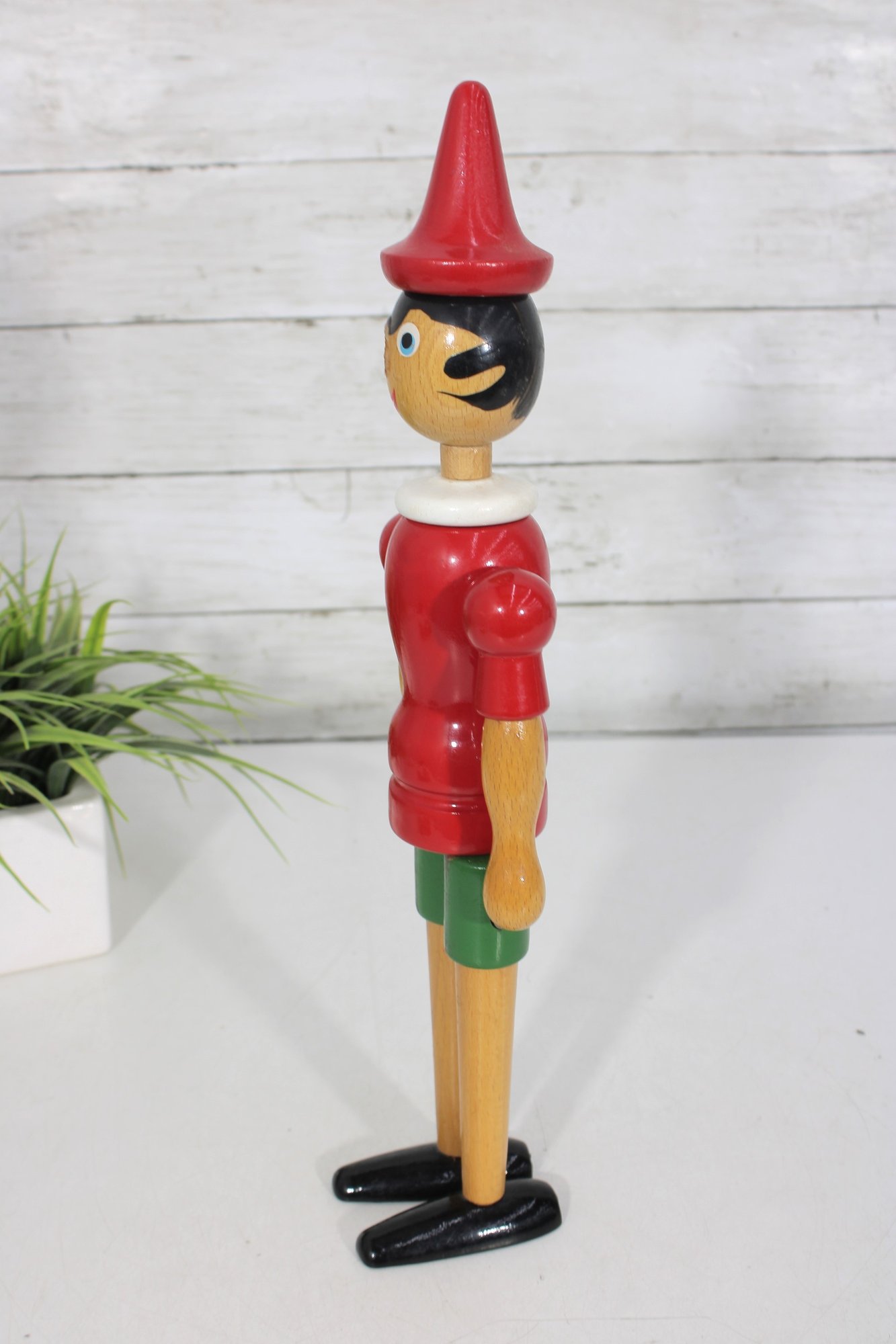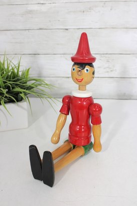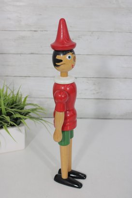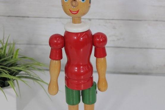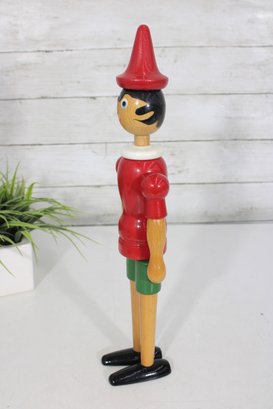 Classic vintage Pinocchio wooden figure standing approximately 16 inches tall. This charming character features a traditional red shirt, green shorts, black shoes, and pointed red hat.