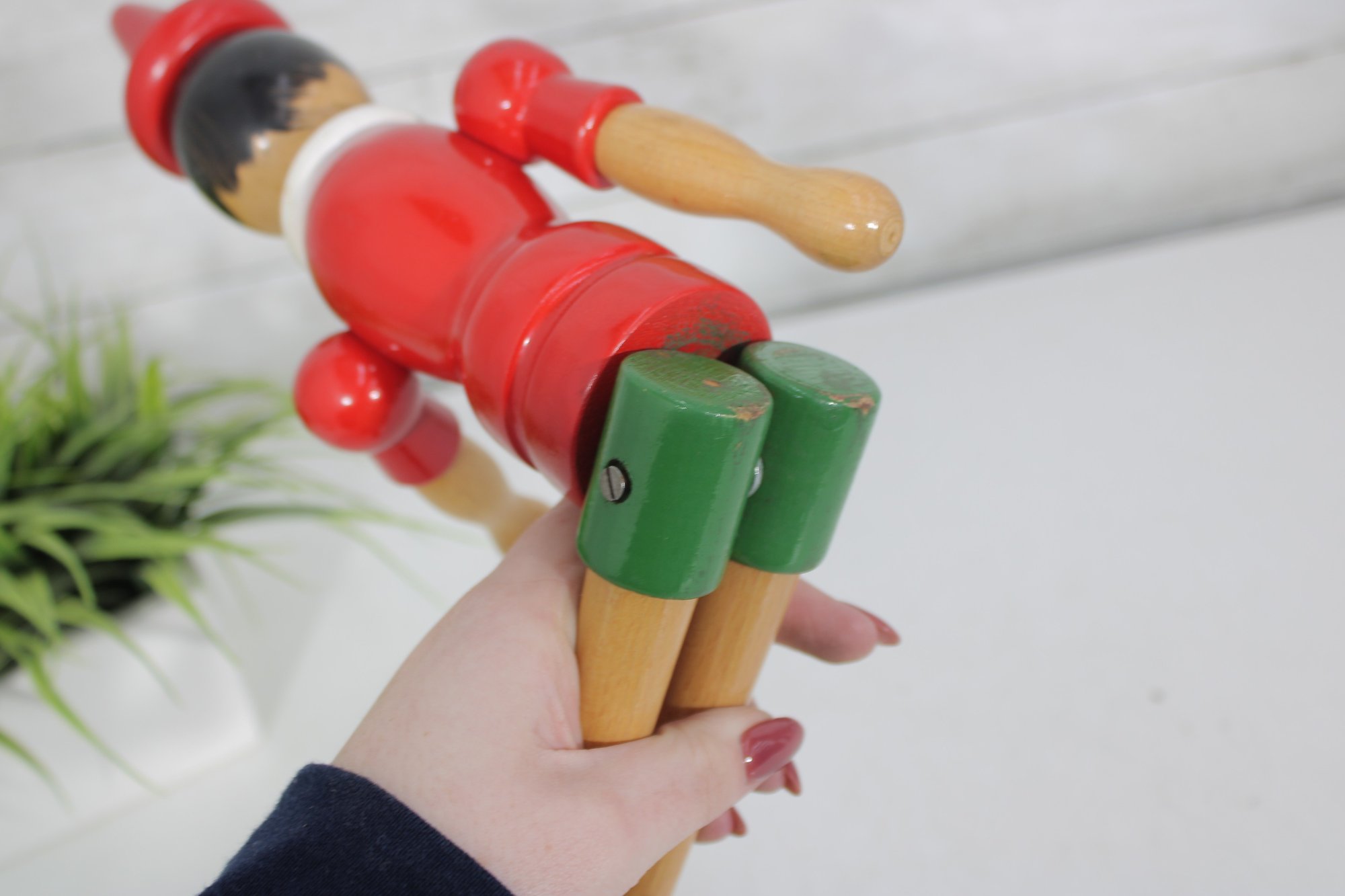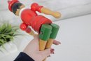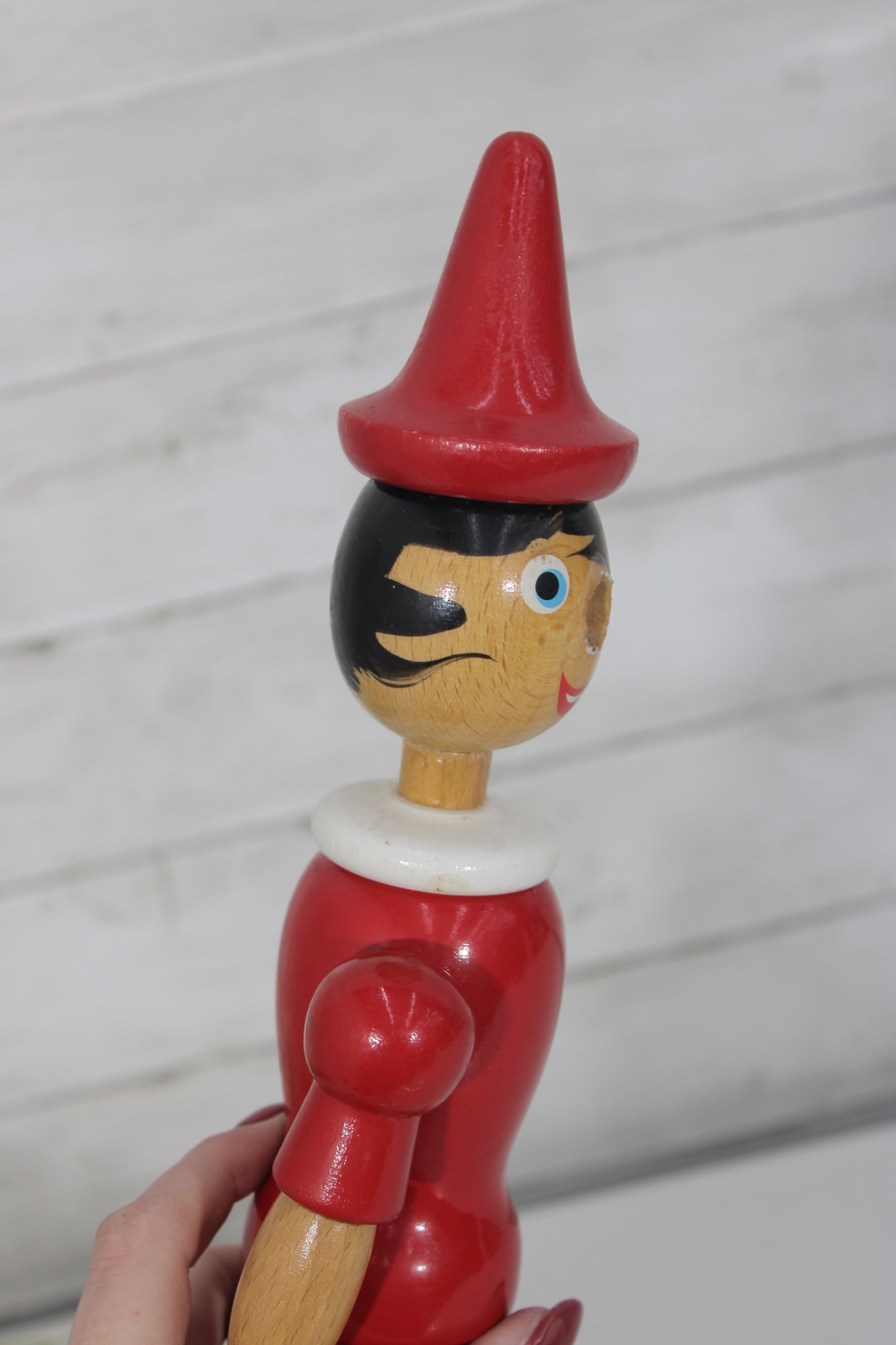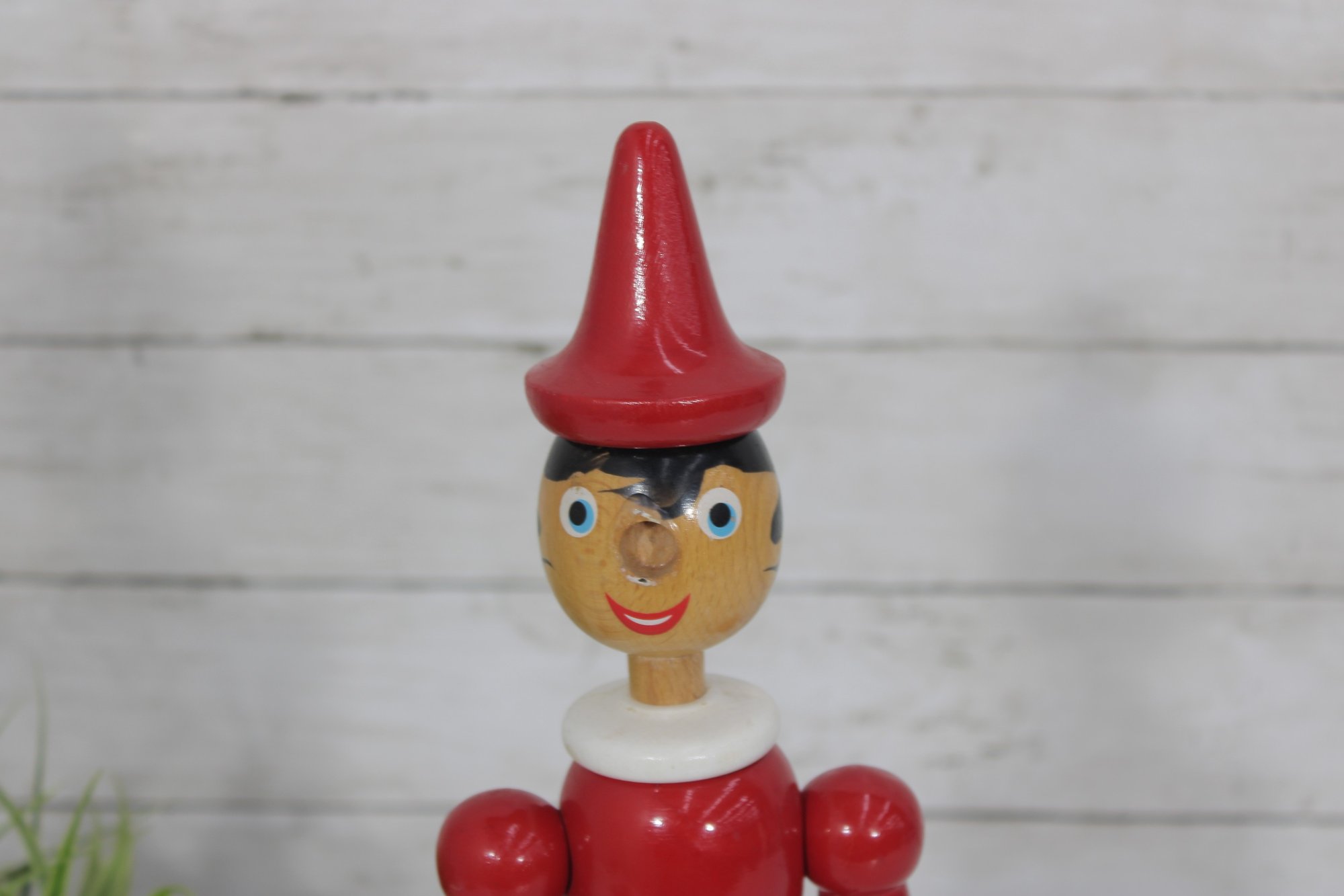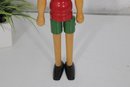 Classic vintage Pinocchio wooden figure standing approximately 16 inches tall. This charming character features a traditional red shirt, green shorts, black shoes, and pointed red hat.