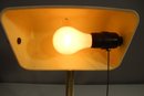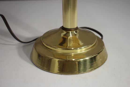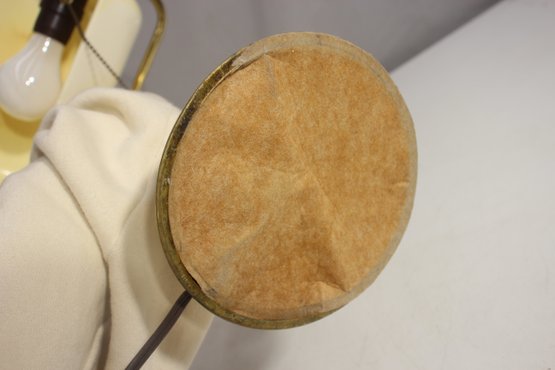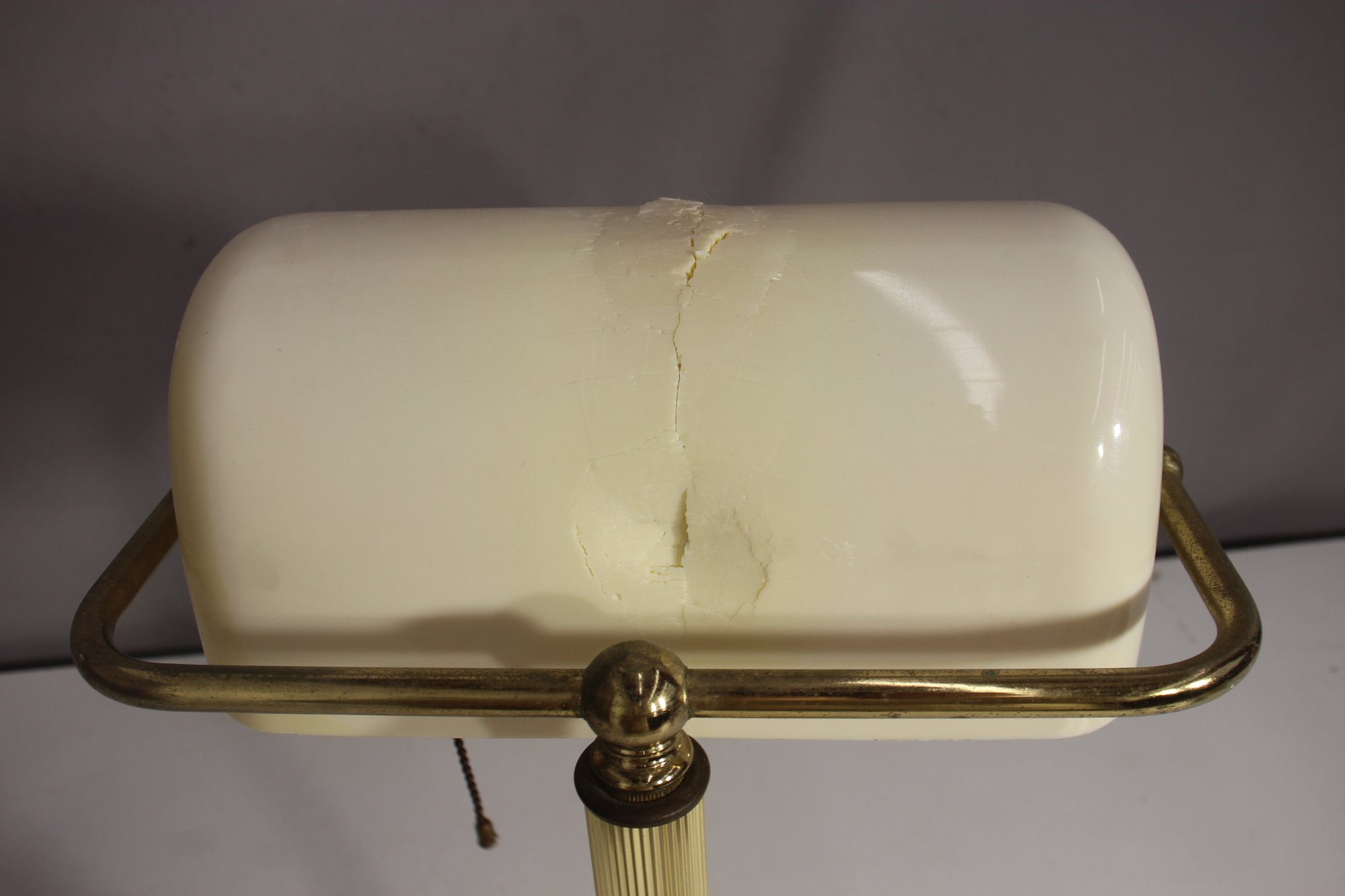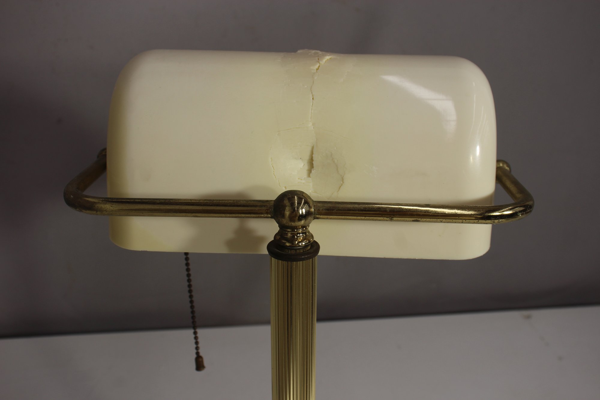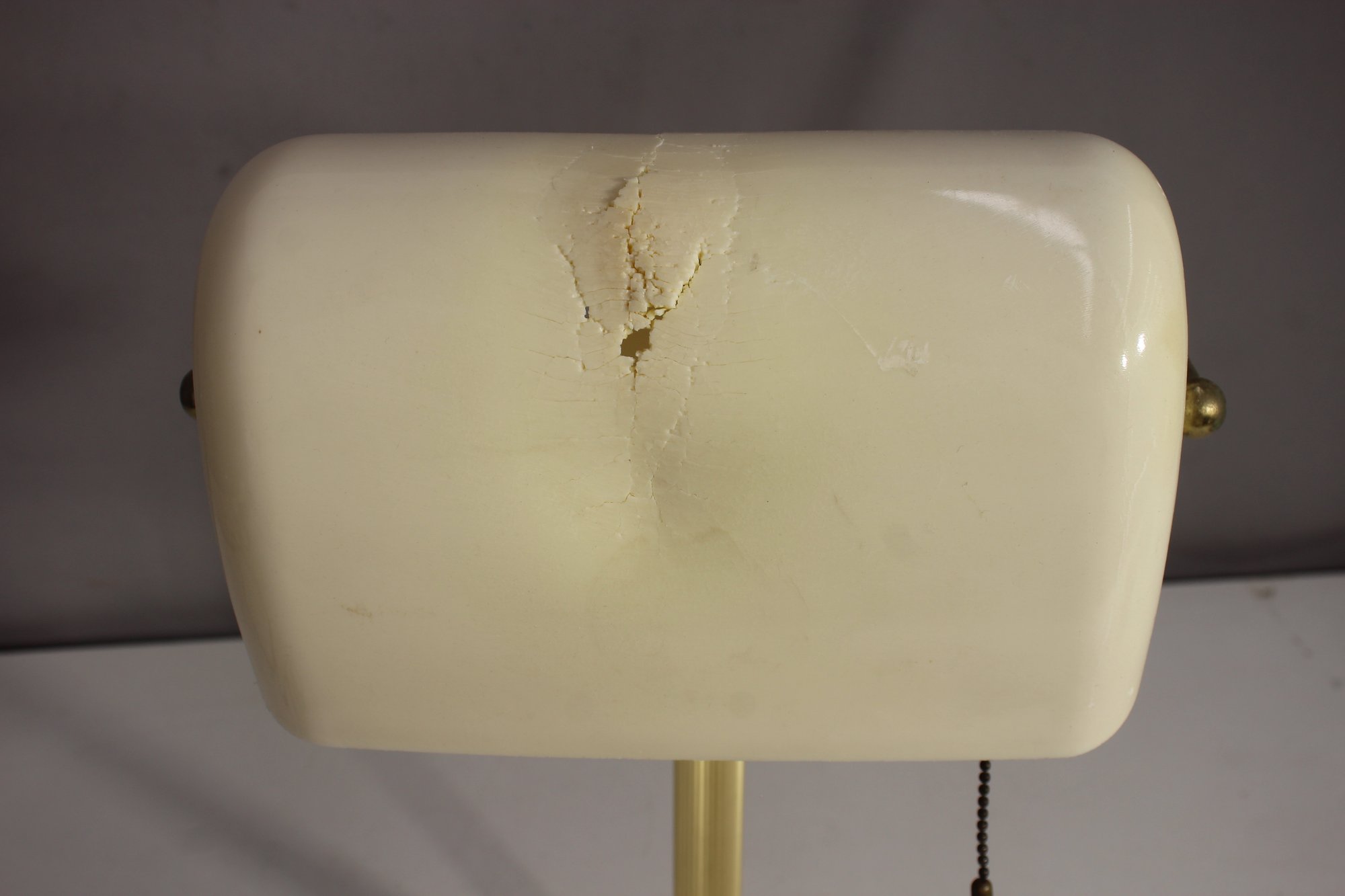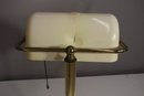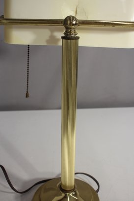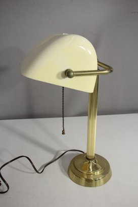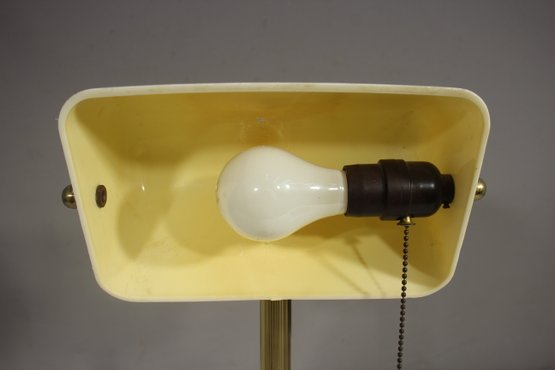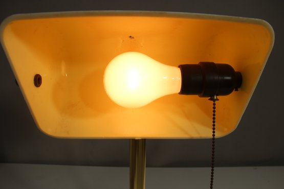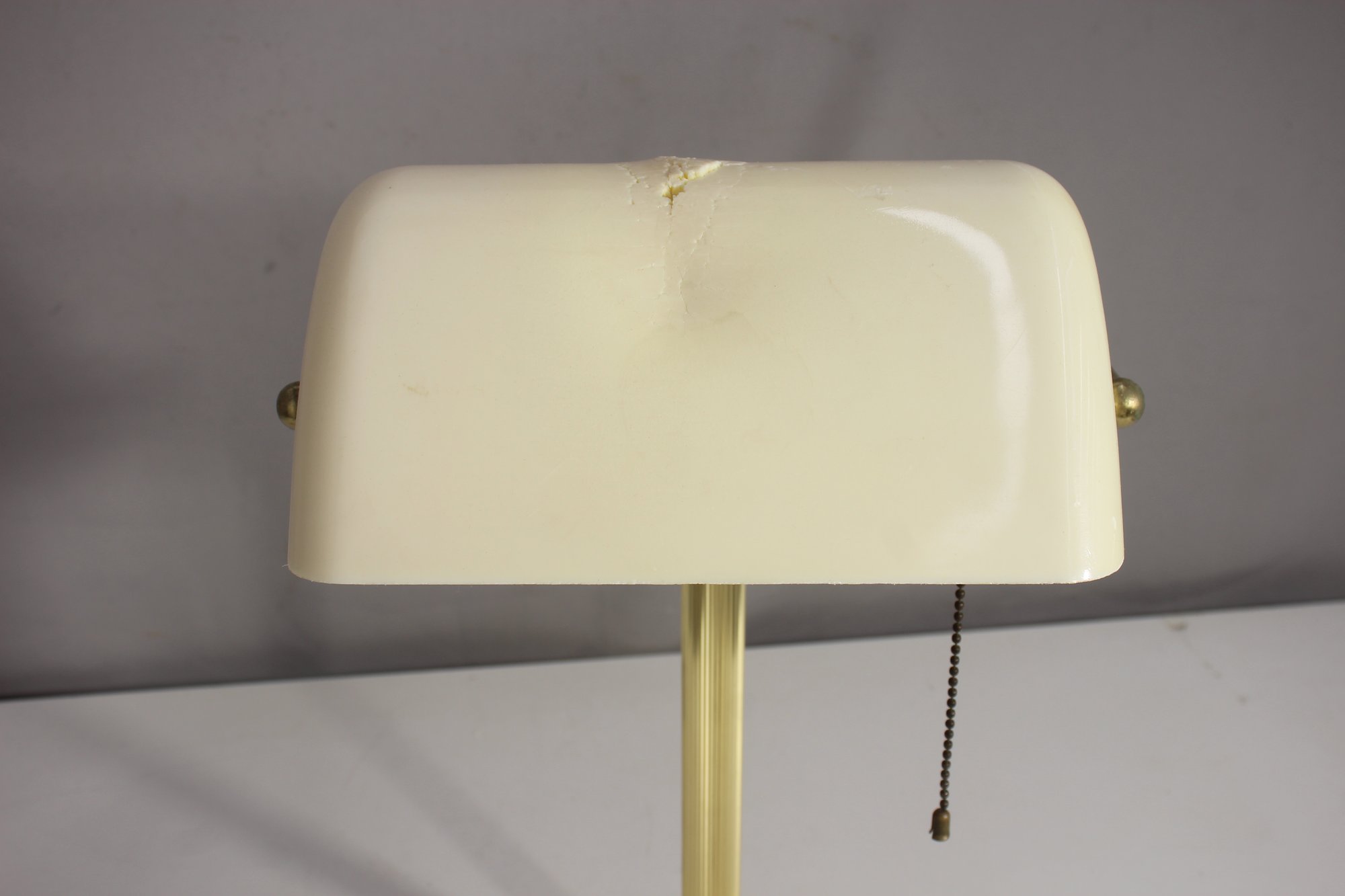 This classic 17” vintage brass banker’s desk lamp features a timeless design with a cream-colored shade and a pull-chain switch, perfect for office or home use.