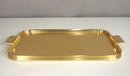 vintage Woblet England gold-tone metal serving tray, measuring 17” x 9”. This Mid-Century Modern tray features a sleek, brushed gold-tone finish, a subtle textured surface, and integrated Art Deco-inspired handles for easy serving.