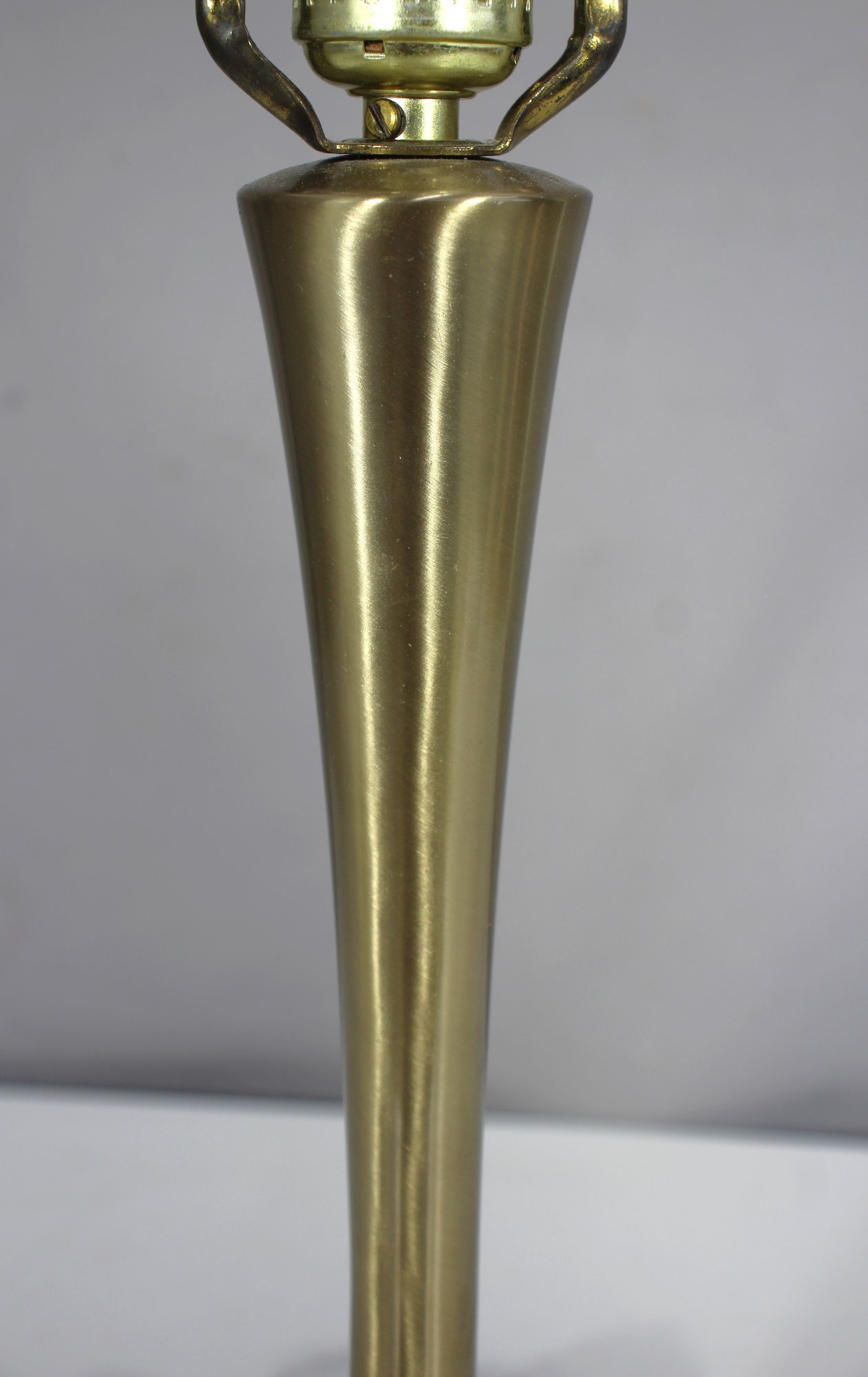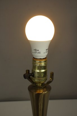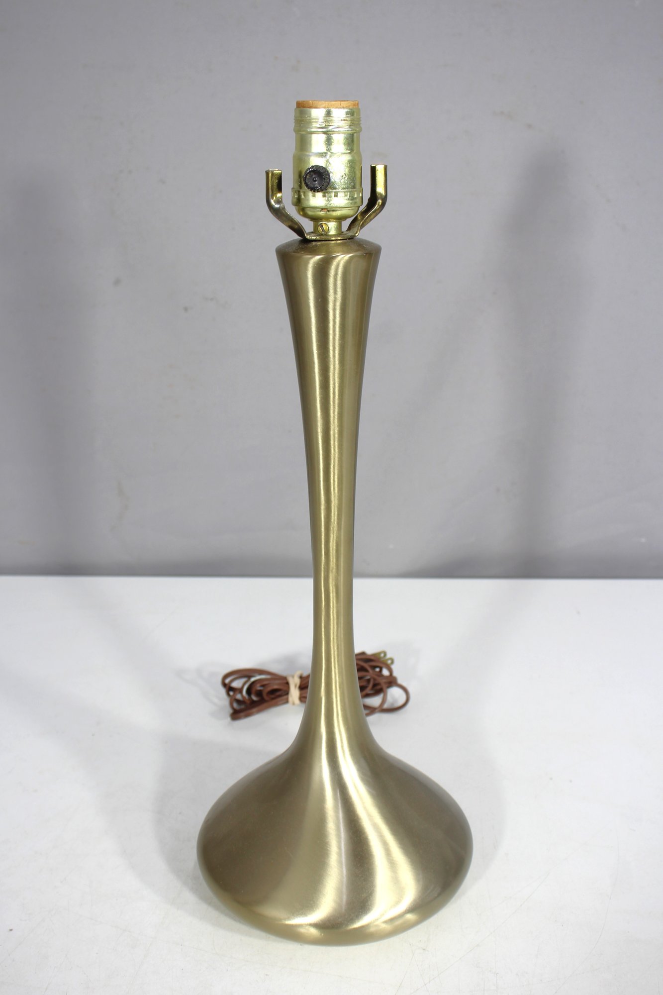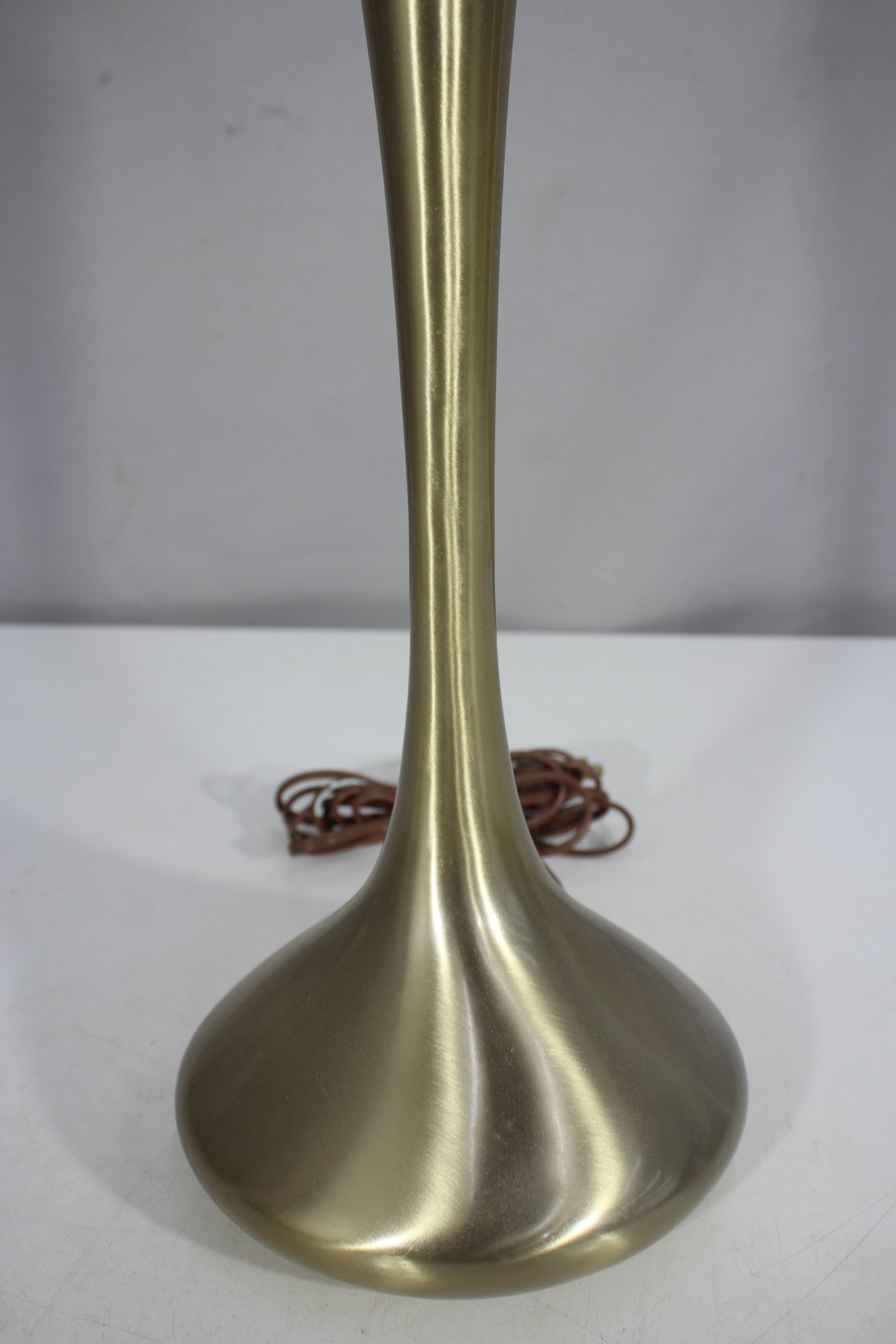 18-inch mid-century modern table lamp features a sleek brass tulip design with a gracefully flared base and a slender, sculptural form. The brushed brass finish gives it a warm, sophisticated glow, making it a timeless addition to any space.